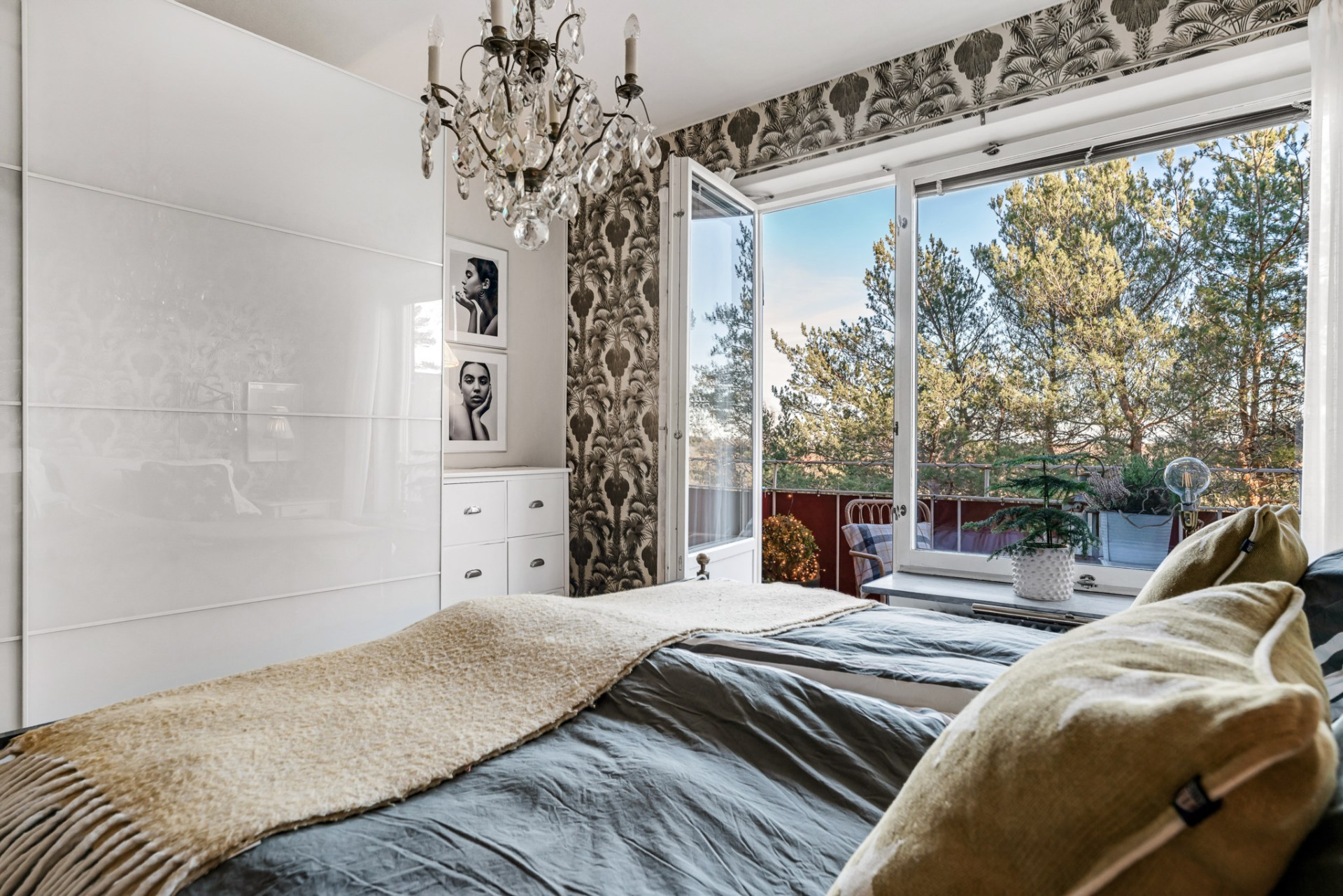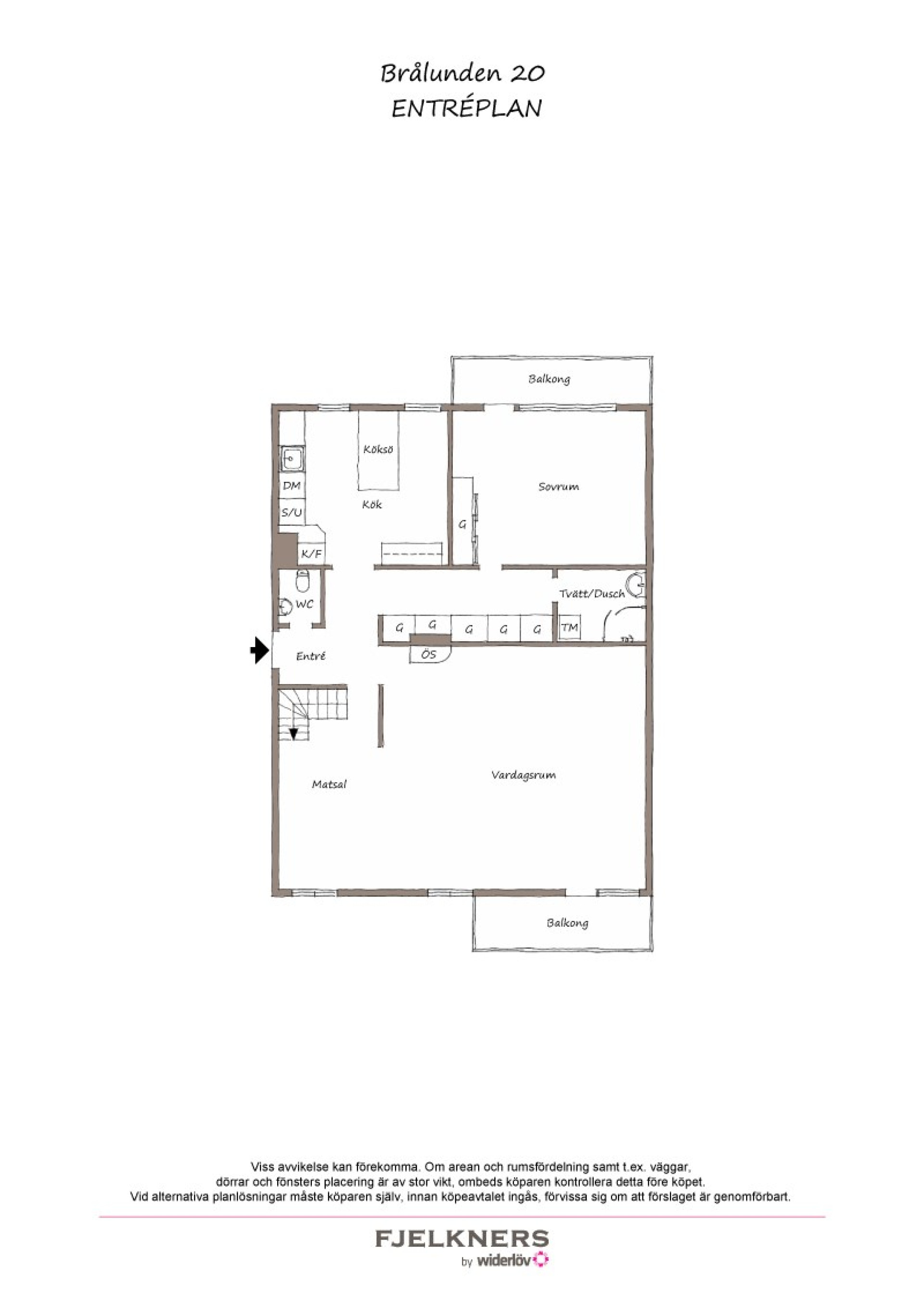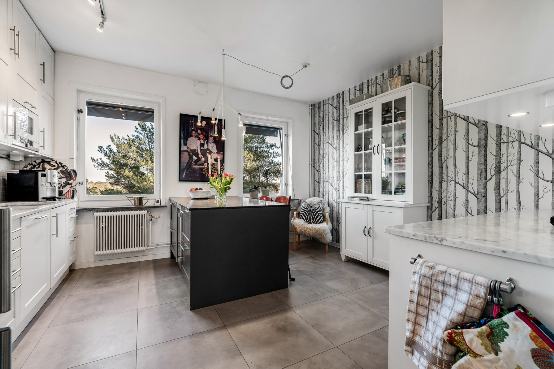 På entréplanet möts du av en ljus och välkomnande hall med gott om plats för avhängning. Här finns även en gäst-wc. Vardagsrum och matsal ligger i öppen planlösning och bjuder på en varm atmosfär med öppen spis, vacker stavlagd ekparkett i original och utgång till en av bostadens tre balkonger – denna med kvällssol och utsikt över Brålundens grönska. Köket är rymligt och ljust med dubbla fönster med markiser, köksö, vitrinskåp samt gott om förvaring och arbetsytor. Master bedroom har egen balkong i österläge, perfekt för morgonkaffet, och intill ligger ett duschrum där tvättmaskin får plats. I korridoren finns dessutom fem stora garderober som säkerställer utmärkt förvaring.