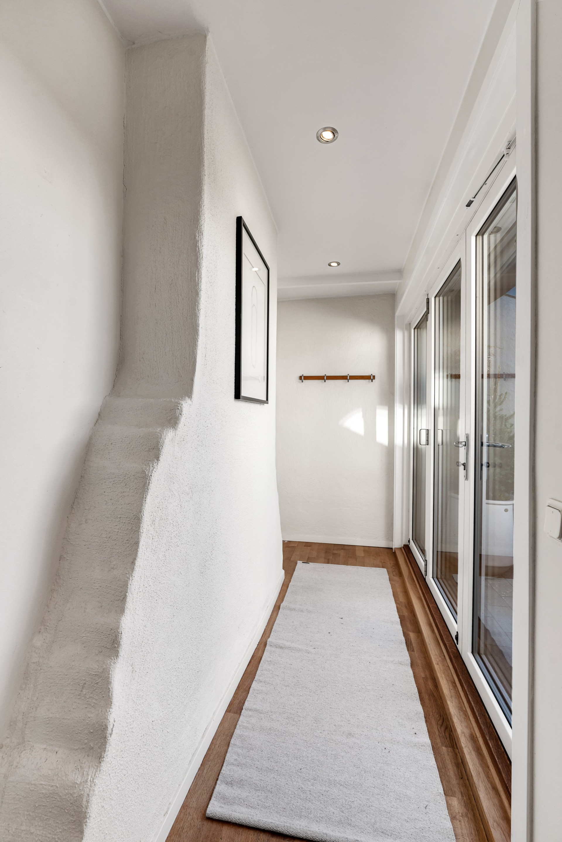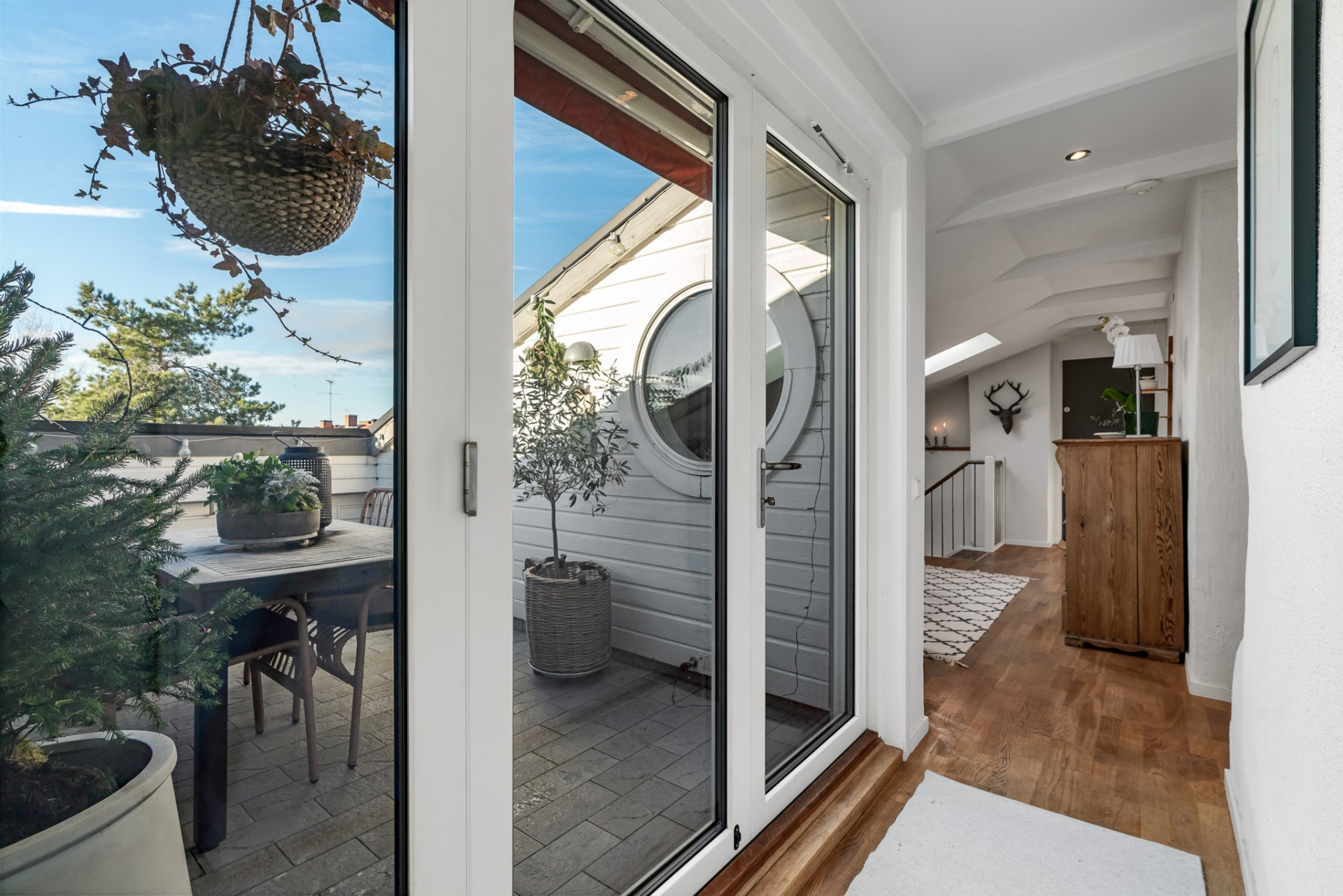 Övre planet nås via en ordentlig trappa från sällskapsytan och omfattar 57 kvm boarea samt ytterligare 31 kvm golvyta som ger en härlig rymd. Här finns även en egen entré från trapphuset. Planet rymmer ett stort allrum, två sovrum med takkupor och en magisk takterrass om 10 kvm med kvällssol. Det finns även ett rymligt badrum med ett angränsande förråd med egen entré, vilket i dag nyttjas som en generös walk-in-closet. Takkupan bidrar med extra ljus och en känsla av rymd.