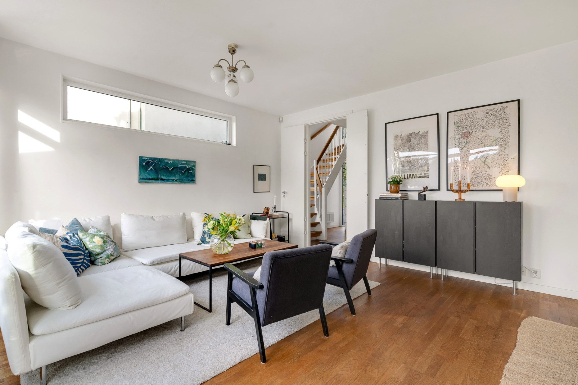 I alla rum finns det vacker oljad ekparkett vilket tillsammans med de stora fönsterpartierna skänker de olika rummen och de olika planen en oslagbar harmoni.