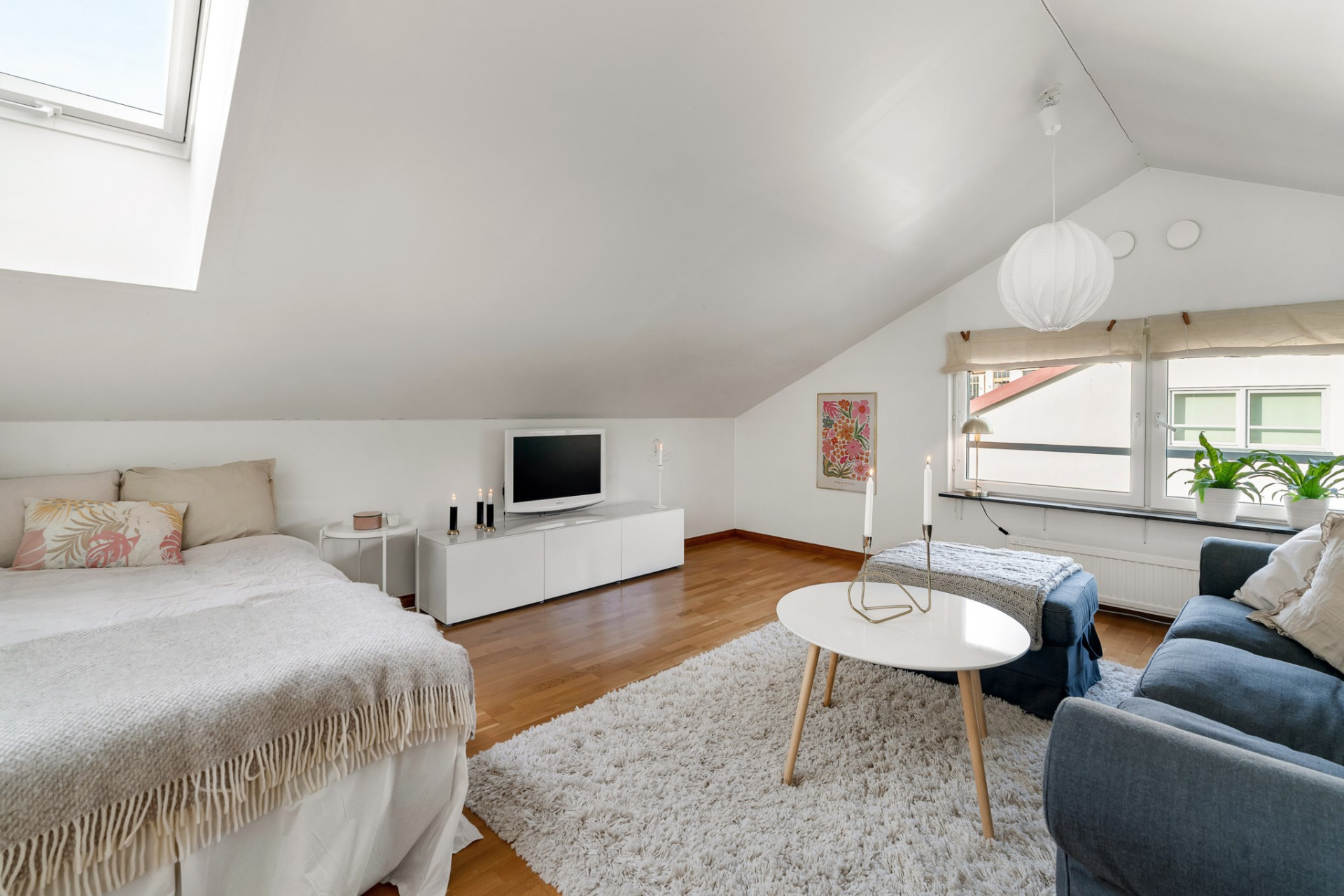Här finns även ett mycket smakfullt och ljust badrum med både dusch och hörnbadkar.