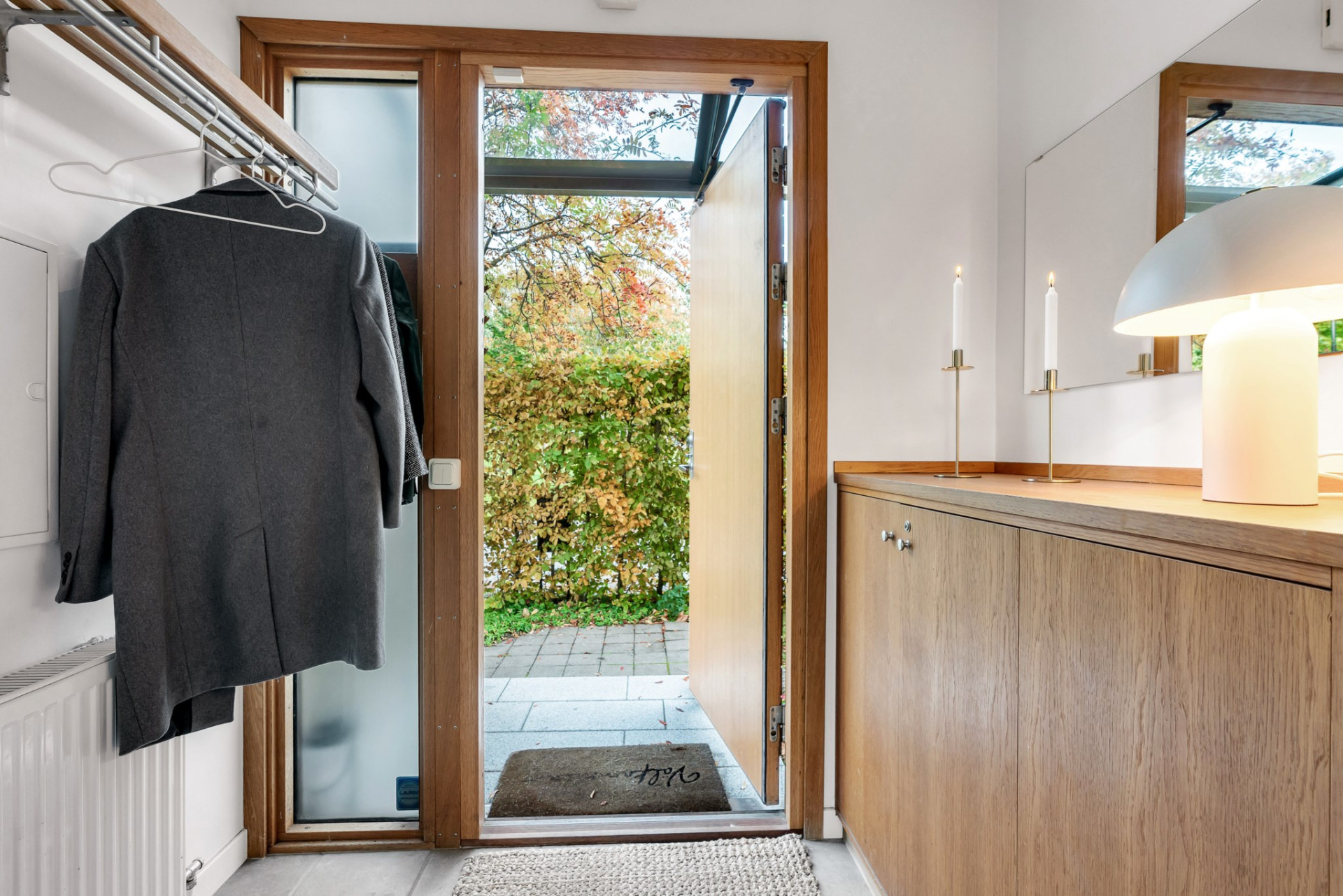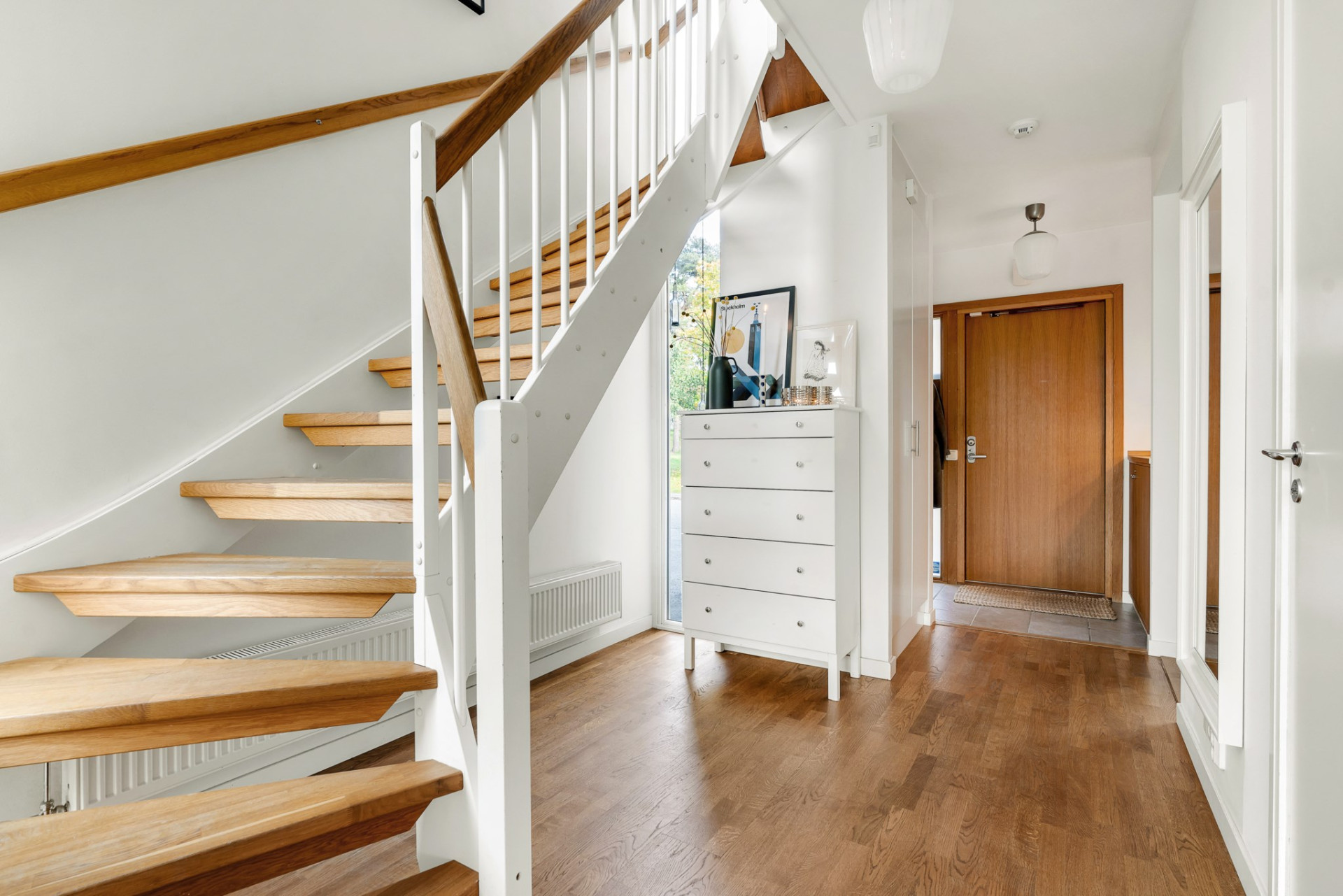 Välkomnande hall där känslan av kvalitet genast infinner sig. Vacker ekdörr och trädetaljer av ek ramar in hallen. Här finns kapphylla och platsbyggt skåp. Klinkergolv i förhallen med vattenburen golvvärme. Perfekt för den kalla och blöta delen av året. Den inre hallen badar i ljus genom fönstren som går från golv till tak i trapphallen. Vackert svängd ektrappa leder upp till övervåningen.