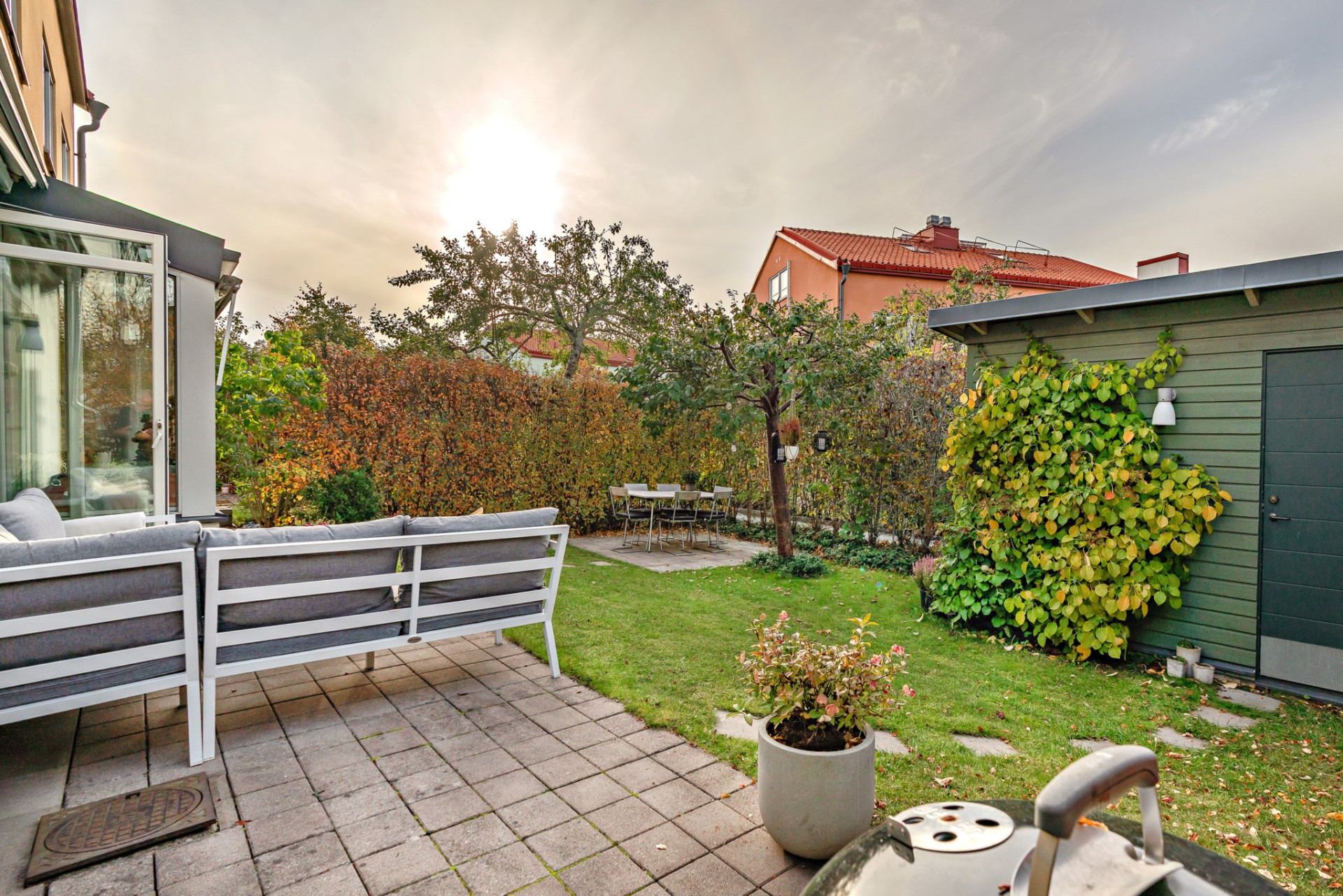 Här bor man med ett utmärkt solläge på en barnvänlig ordnad trädgårdstomt i söder/väster där man njuter av solen på någon av uteplatserna. Trädgården omgärdas av fina avenbokhäckar och syréner och är fri från insyn. På tomten finns även en rymlig isolerad förrådsbod.