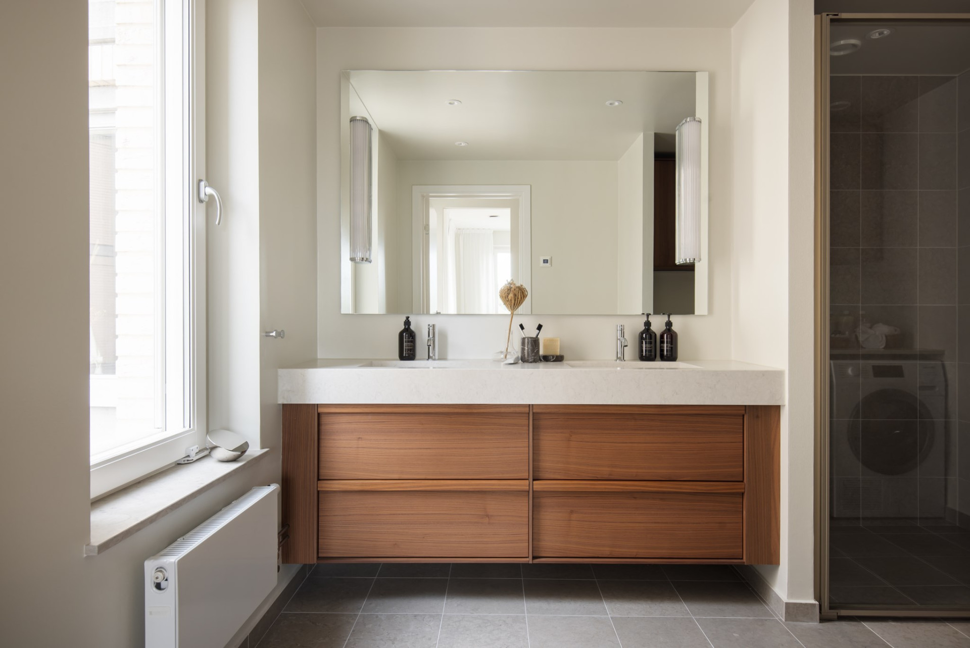 BadrumStilrent, rofyllt och välplanerat. Badrummet är utrustat med granitkeramik i kalkstenslook (Runö Light Grey från Bricmate), en elegant kommod i valnöt från Haven och en kromad blandare i tidlös design. Tvättmaskin och torktumlare från Miele gör vardagen smidigare, utan att tumma på stilen.