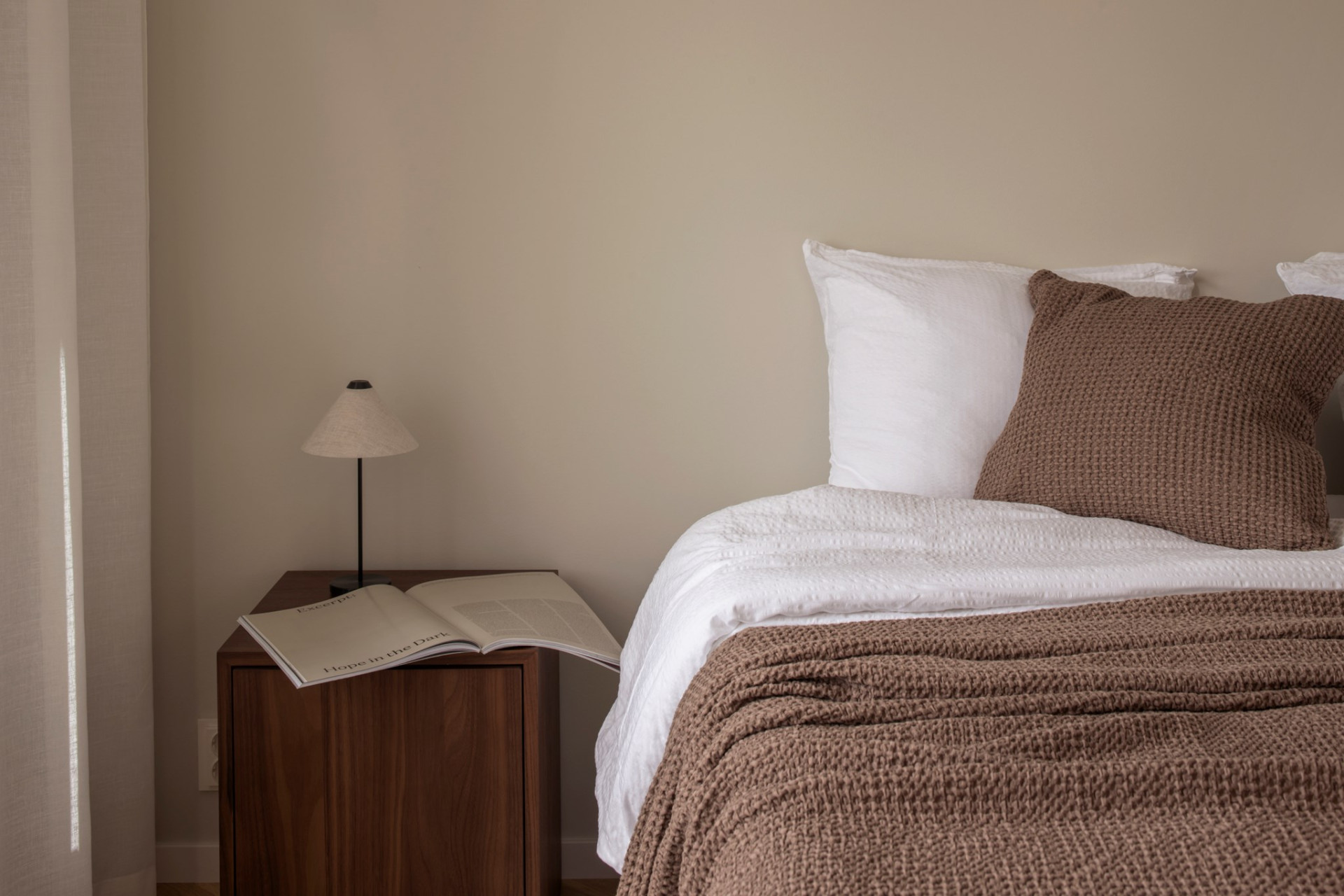 Det rofyllda sovrummet är inrett i en jordnära färgskala som tillsammans med de naturliga materialen bidrar till en avslappnande atmosfär. Här finns gott om plats för dubbelsäng och förvaring, vilket gör rummet till en privat oas för vila och återhämtning.