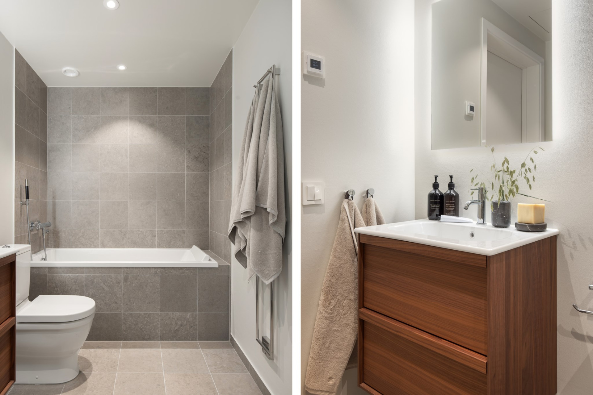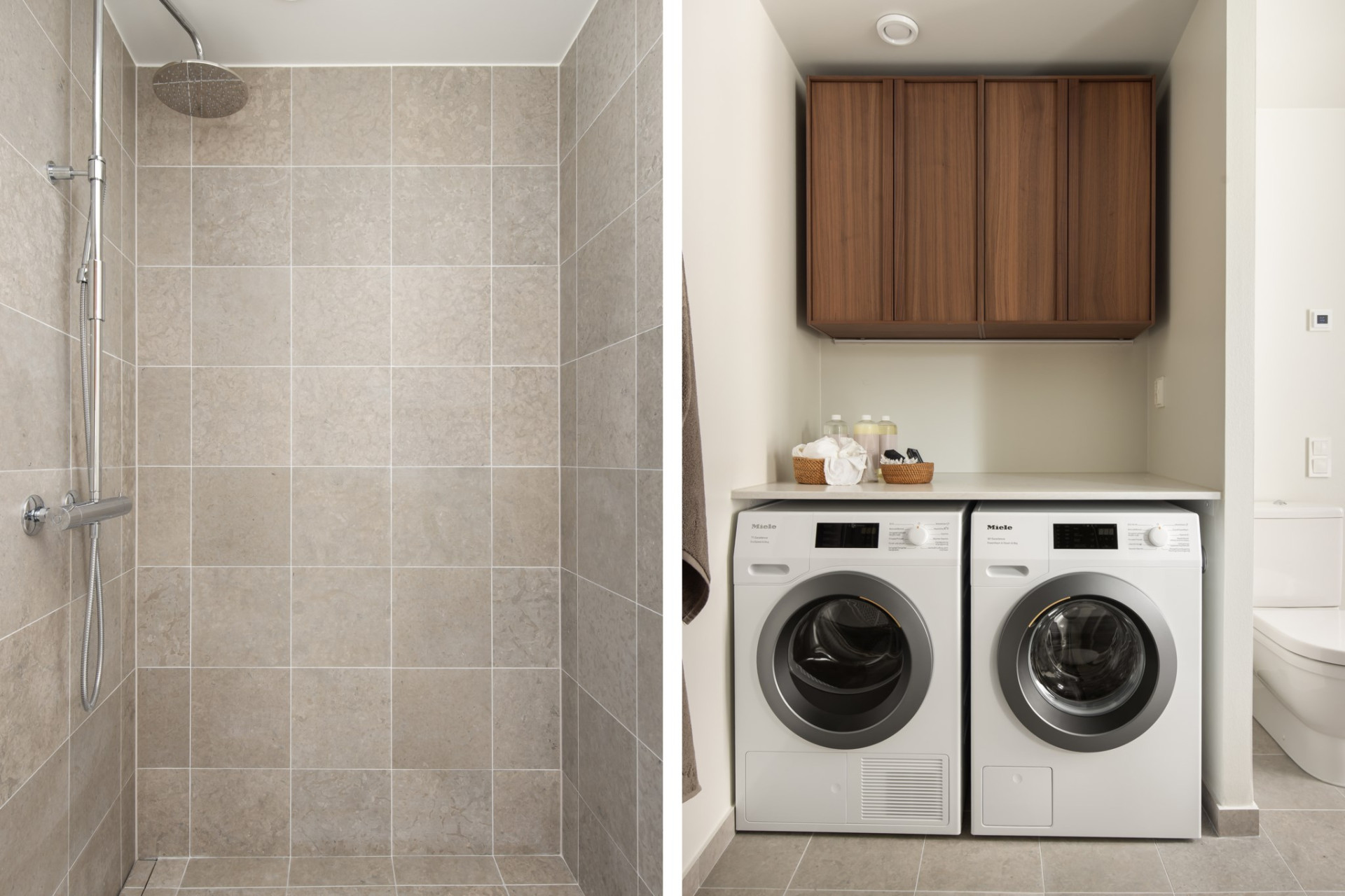 Badrummet håller samma höga standard som resten av lägenheten – med granitkeramik i kalkstenslook (Runö Light Grey från Bricmate), en kommod i valnöt från Haven och kromade detaljer som förhöjer helhetskänslan. Här finns även tvättmaskin och torktumlare från Miele, smart integrerade för att underlätta vardagen.