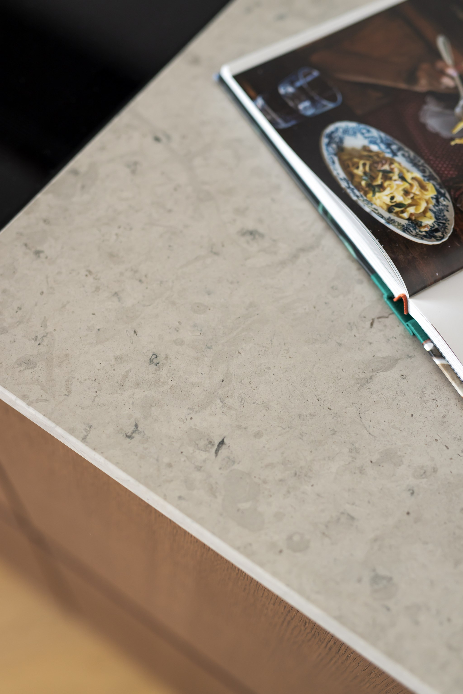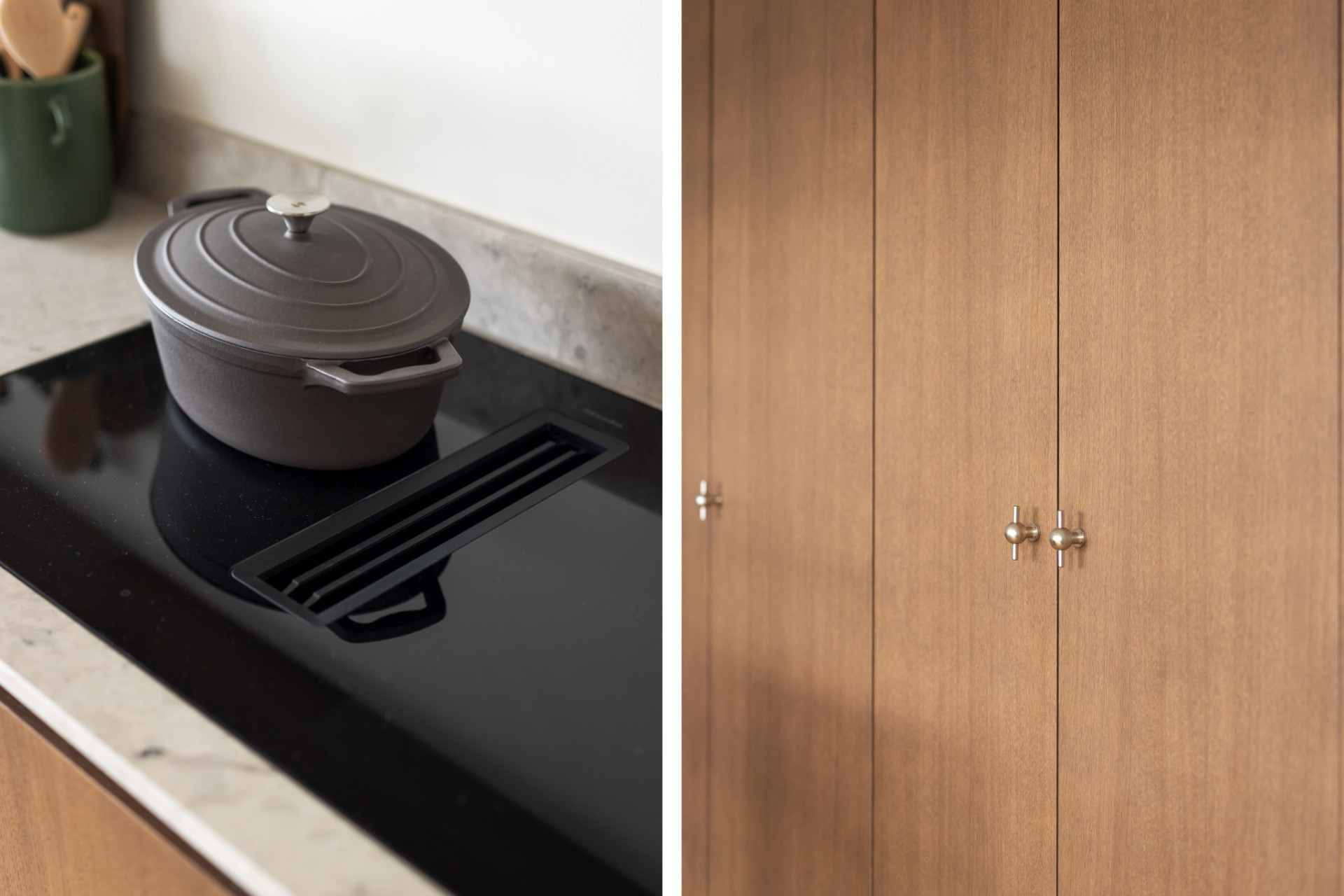 Köket är platsbyggt från Kvänum och erbjuder både funktionalitet och form i perfekt balans. Med luckor i ek, bänkskivor i kalksten och integrerade vitvaror från Miele är köket en självklar mittpunkt i hemmet – lika praktiskt för vardagens måltider som för middagar i goda vänners lag. Induktionshäll med inbyggd fläkt och stilrena linjer skapar ett avskalat och modernt uttryck.