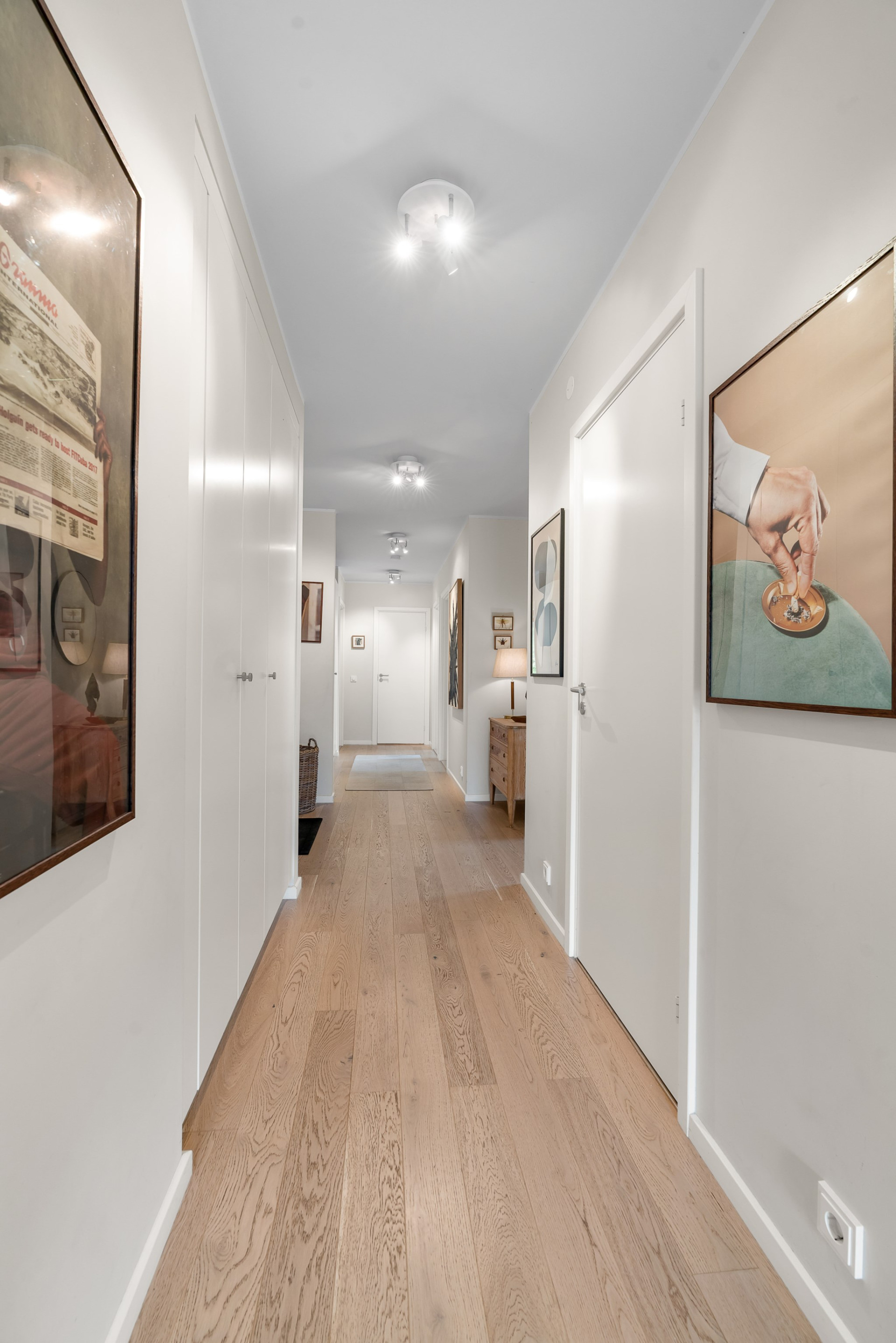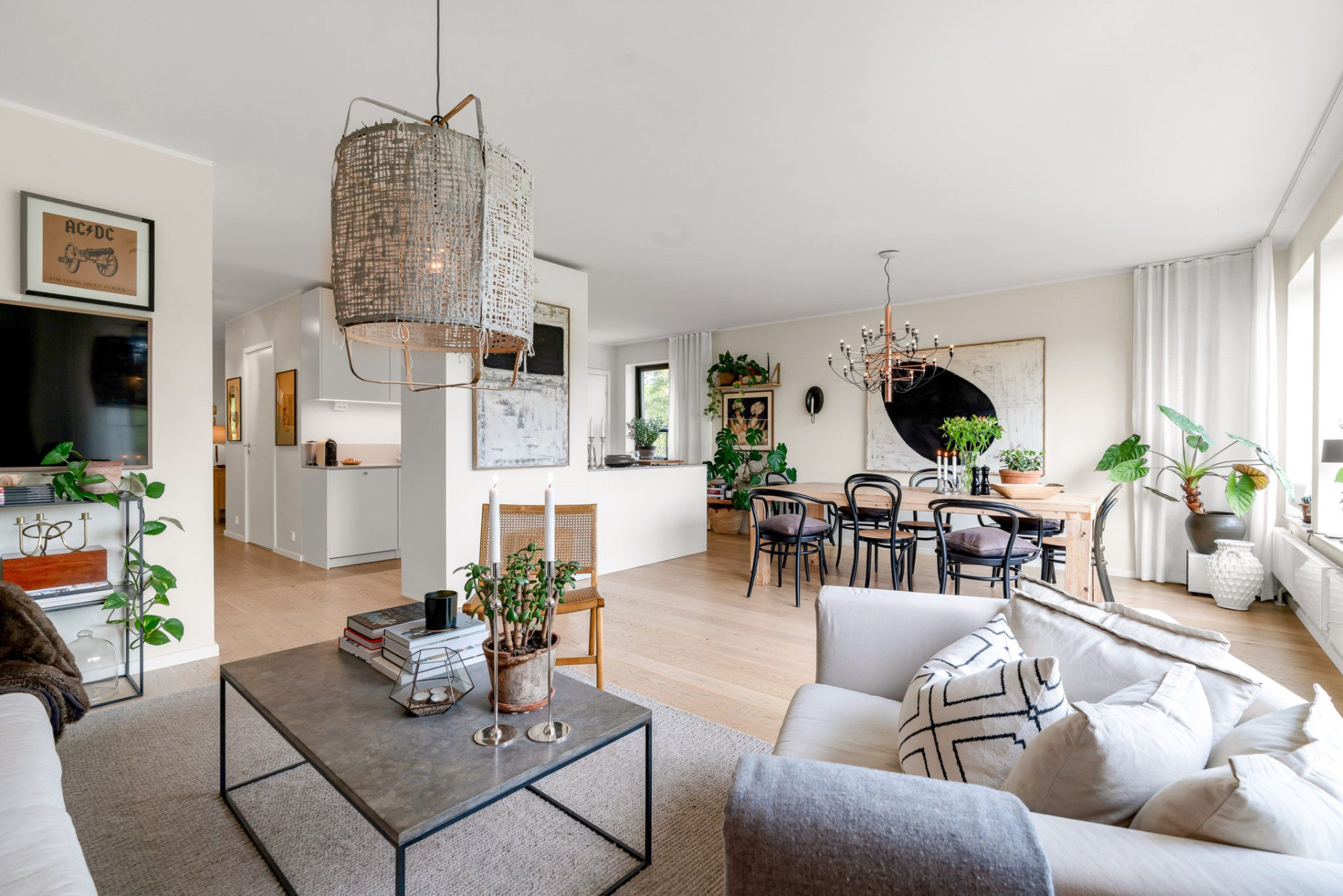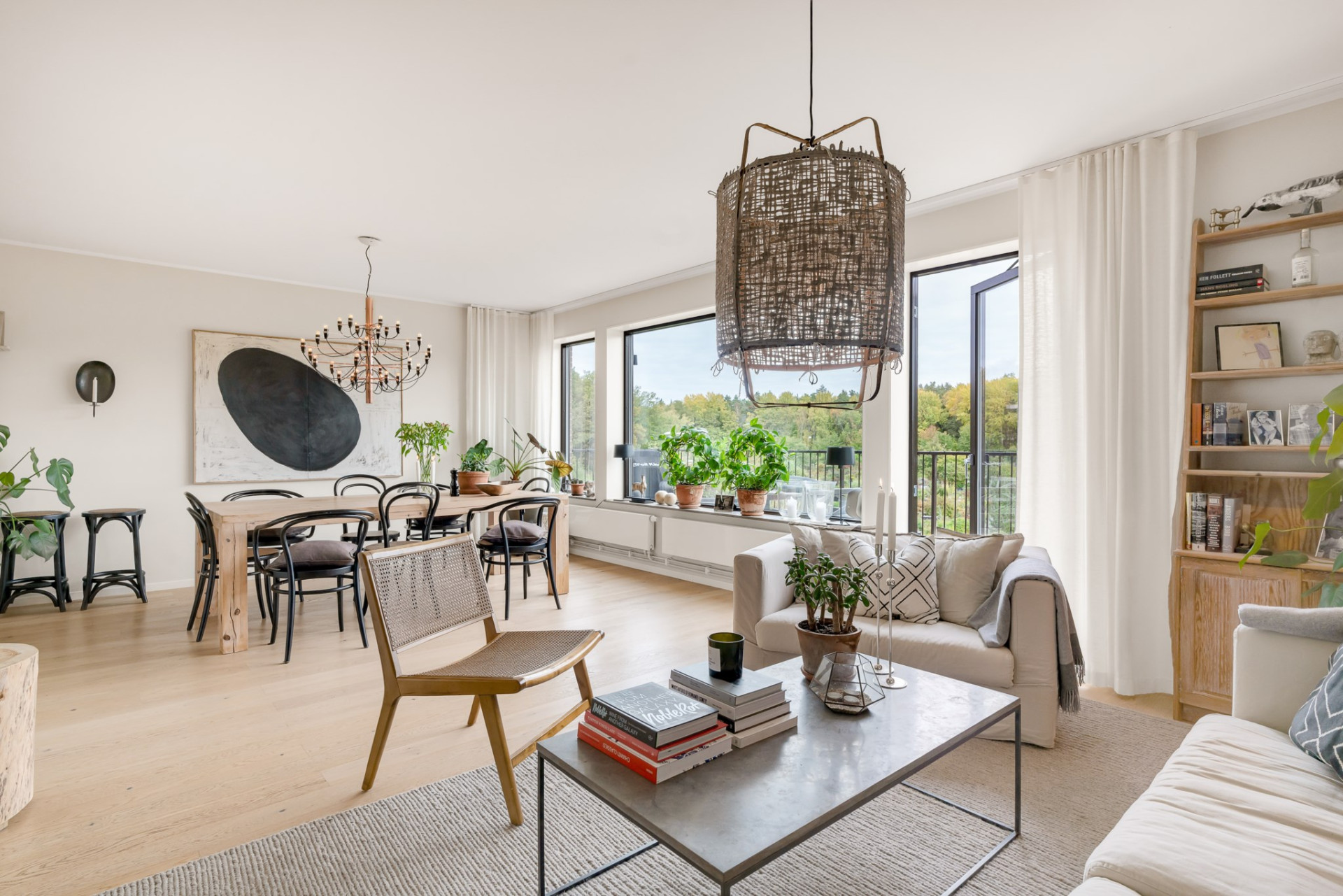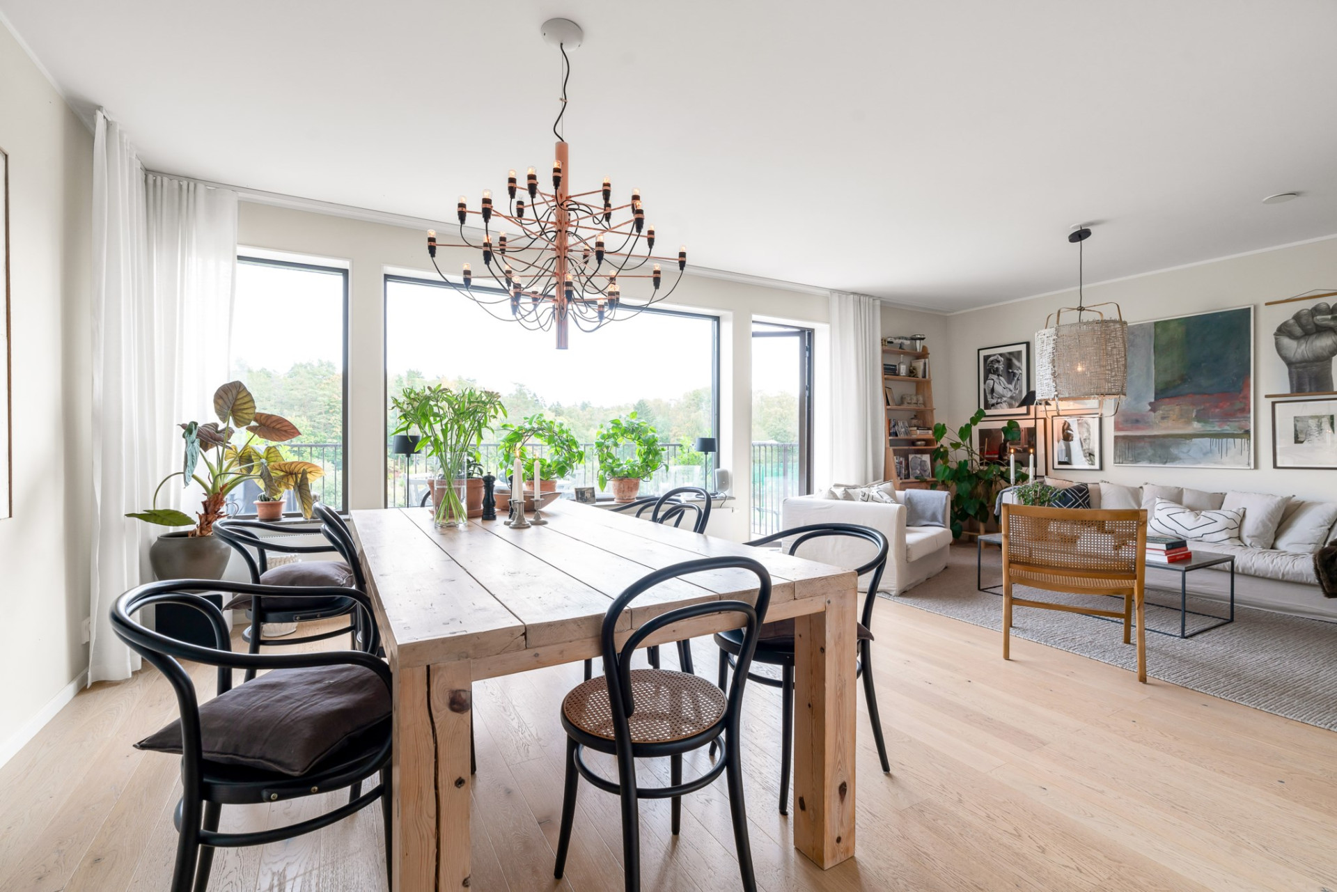 Bostaden präglas av en social och luftig planlösning där det smakfulla och praktiska köket möter ett generöst vardagsrum och matsalsdel. De stora fönsterpartierna ger ett fantastiskt ljusflöde som fyller hela våningen. Sovrummen är välplanerade och erbjuder gott om plats för både förvaring och möblering, och de två badrummen – ett större badrum samt ett mindre duschrum – gör vardagen extra bekväm.
