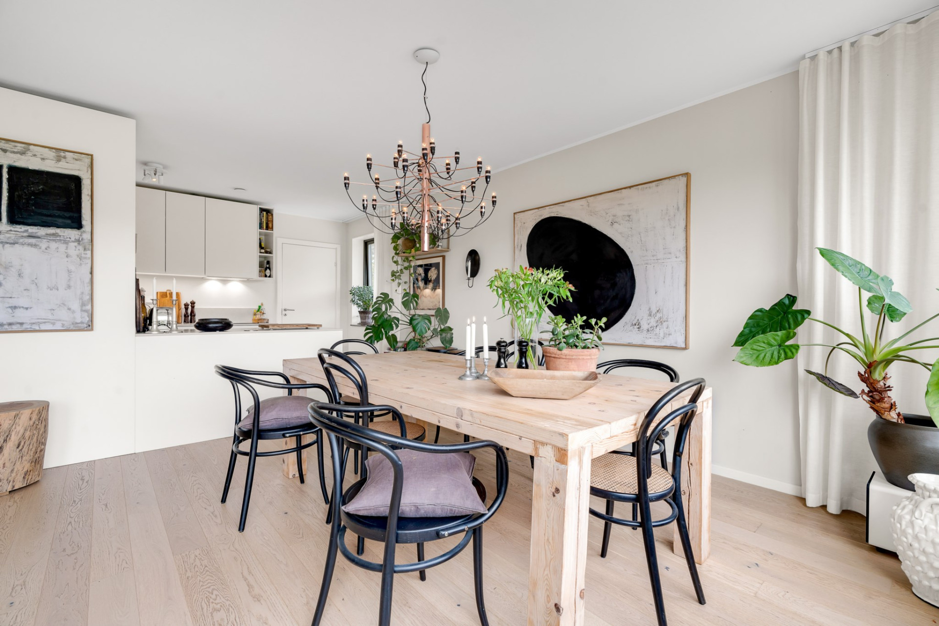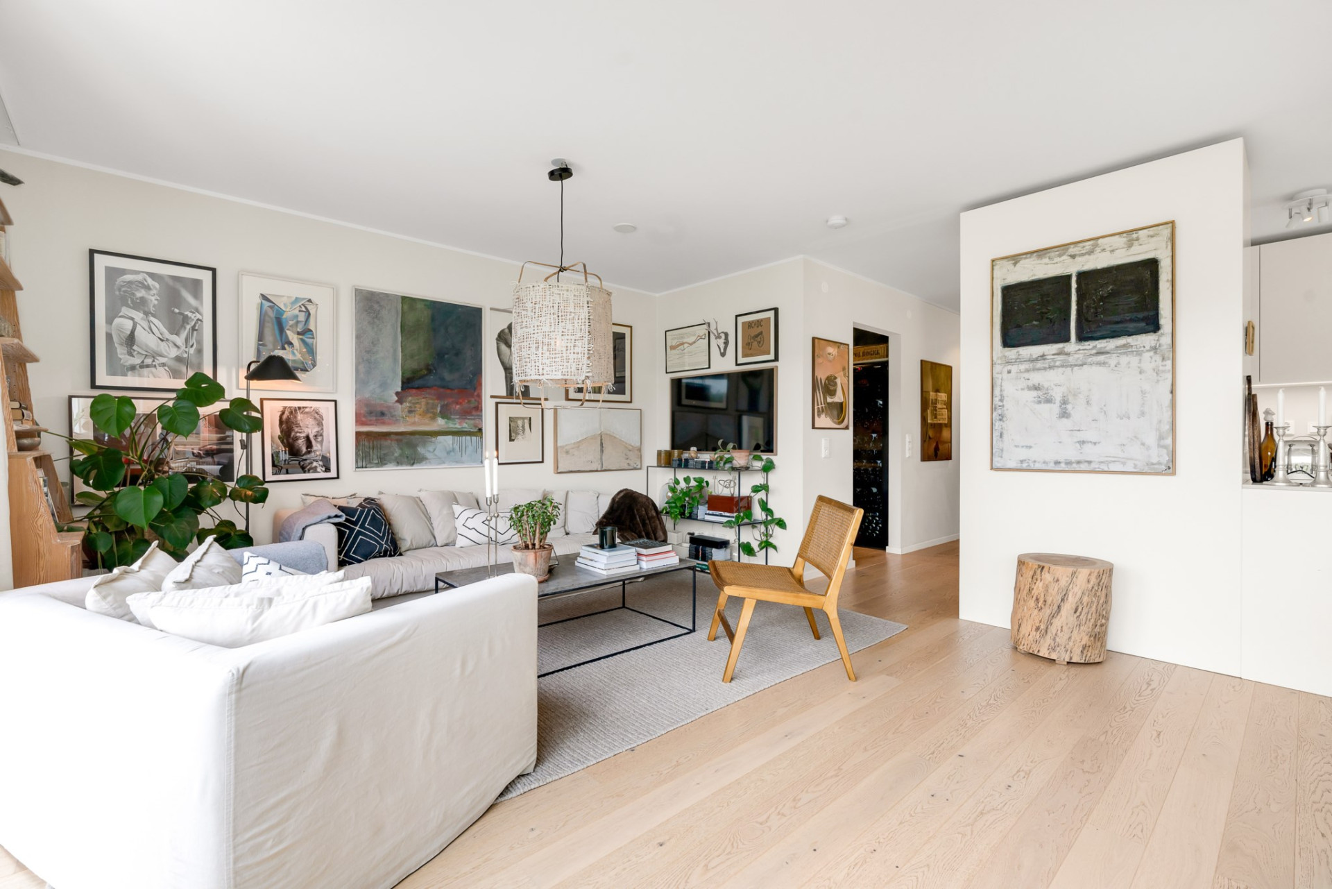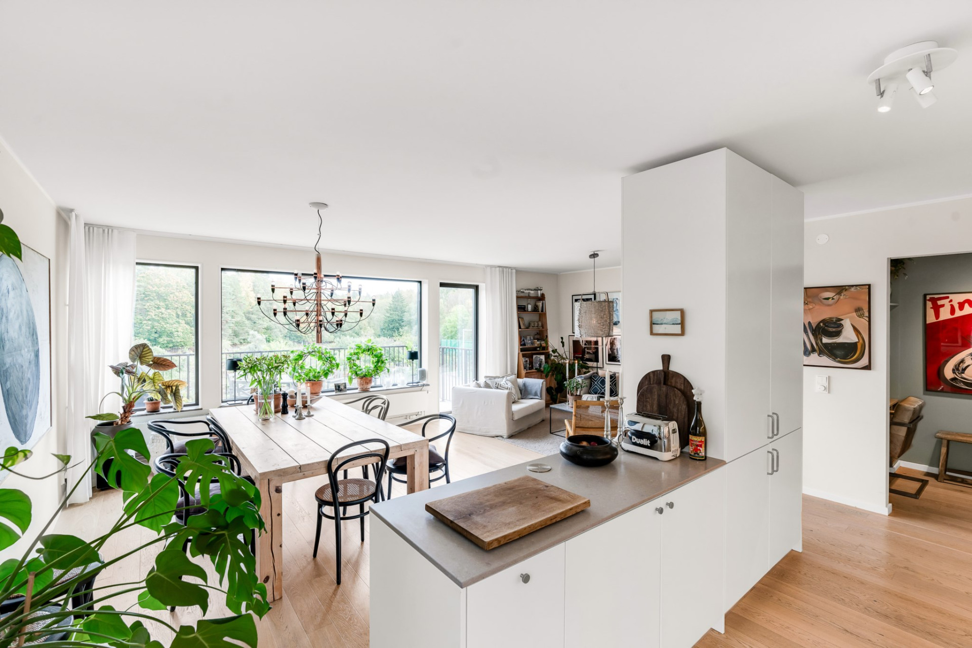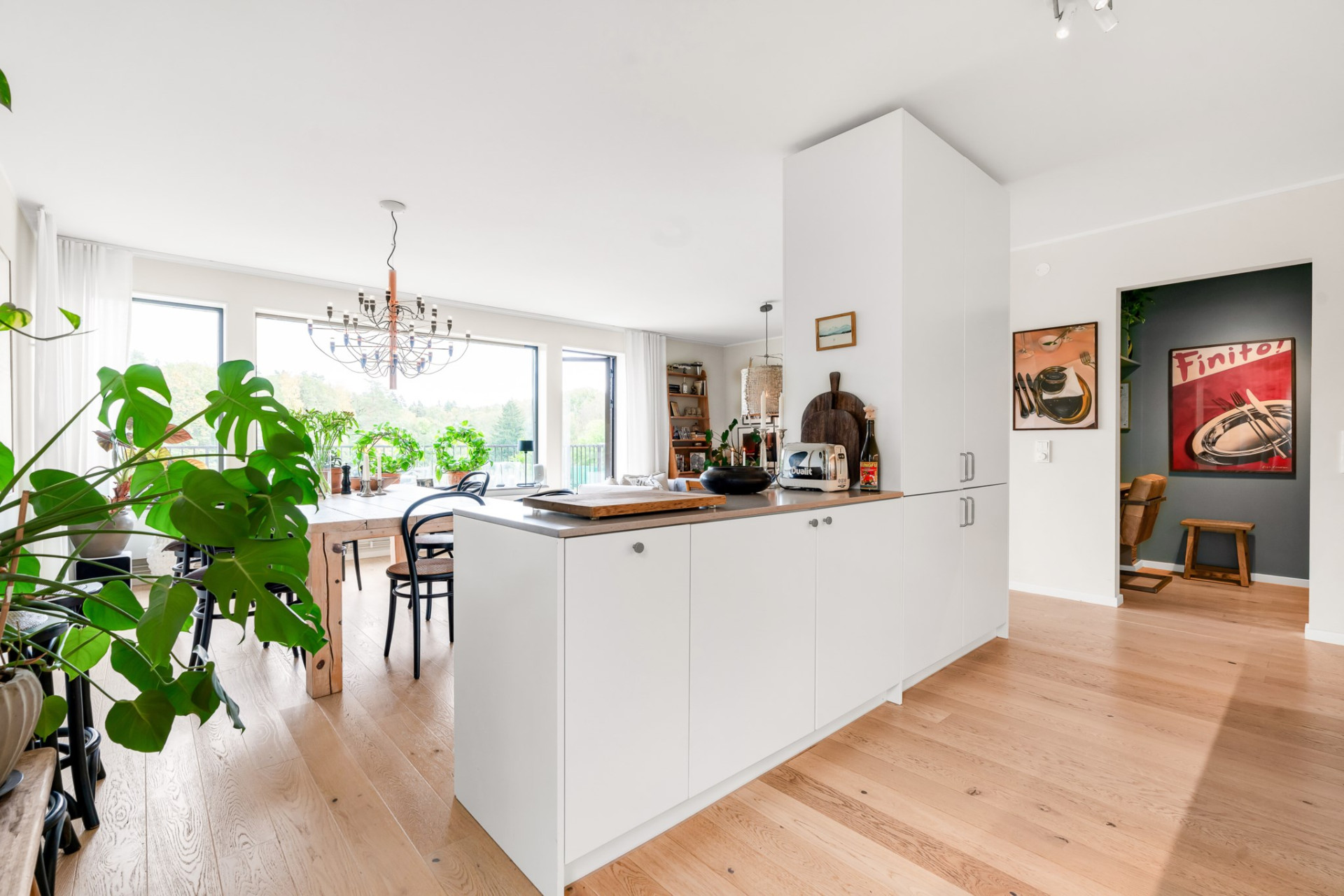 Bostaden präglas av en social och luftig planlösning där det smakfulla och praktiska köket möter ett generöst vardagsrum och matsalsdel. De stora fönsterpartierna ger ett fantastiskt ljusflöde som fyller hela våningen. Sovrummen är välplanerade och erbjuder gott om plats för både förvaring och möblering, och de två badrummen – ett större badrum samt ett mindre duschrum – gör vardagen extra bekväm.