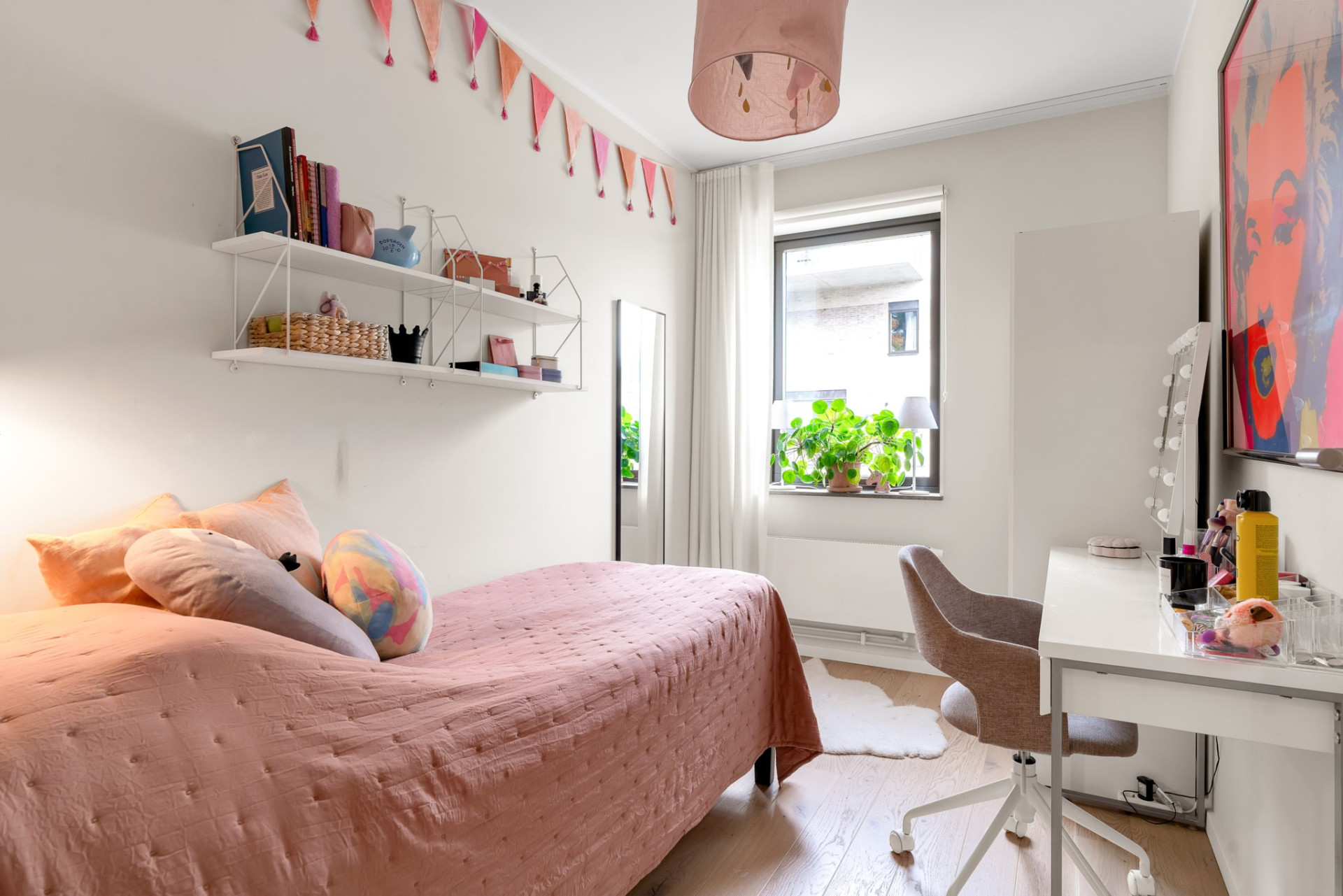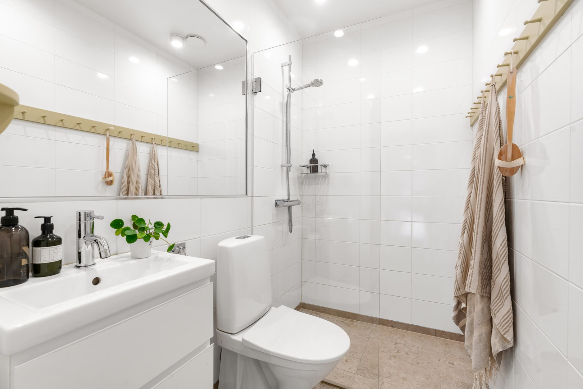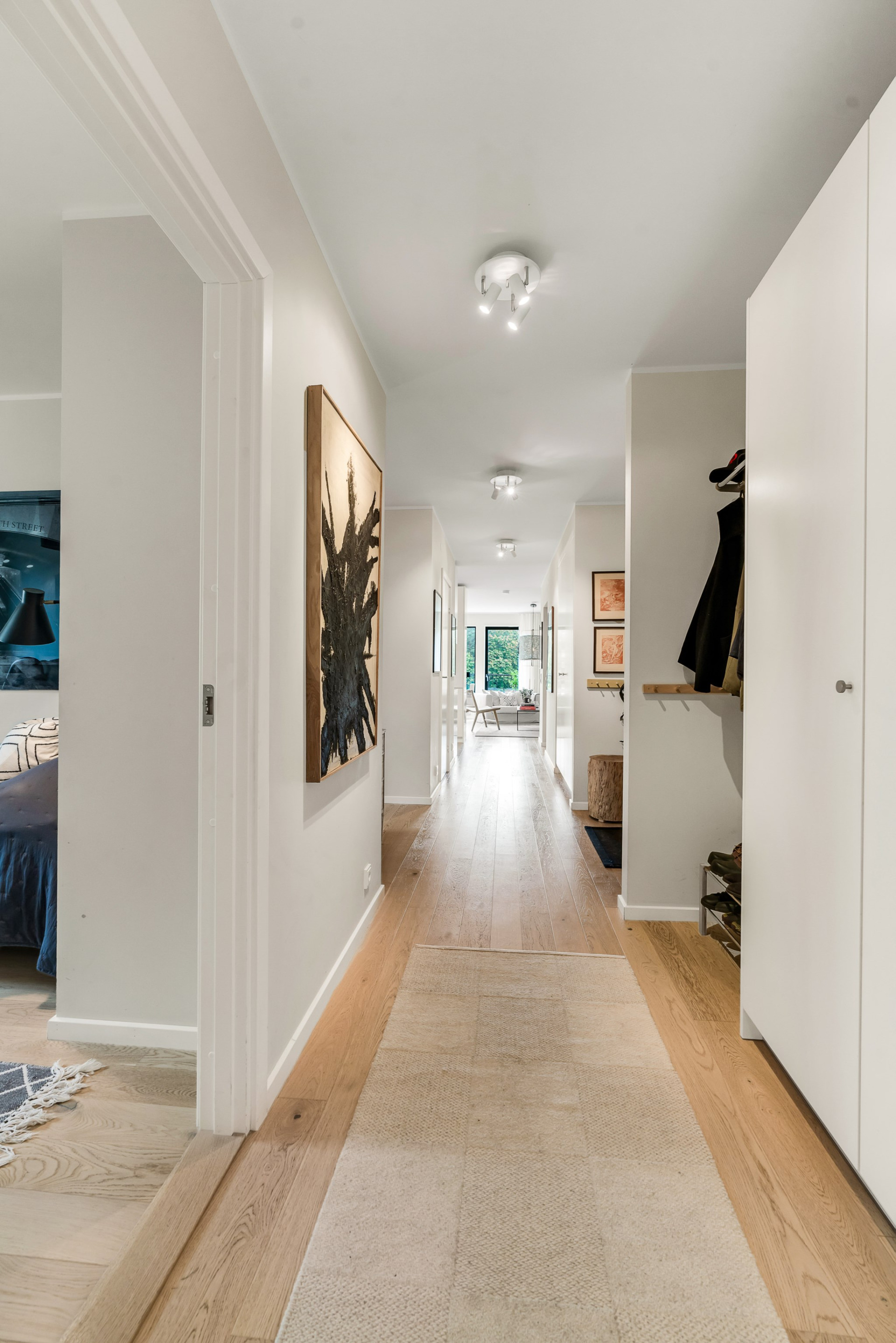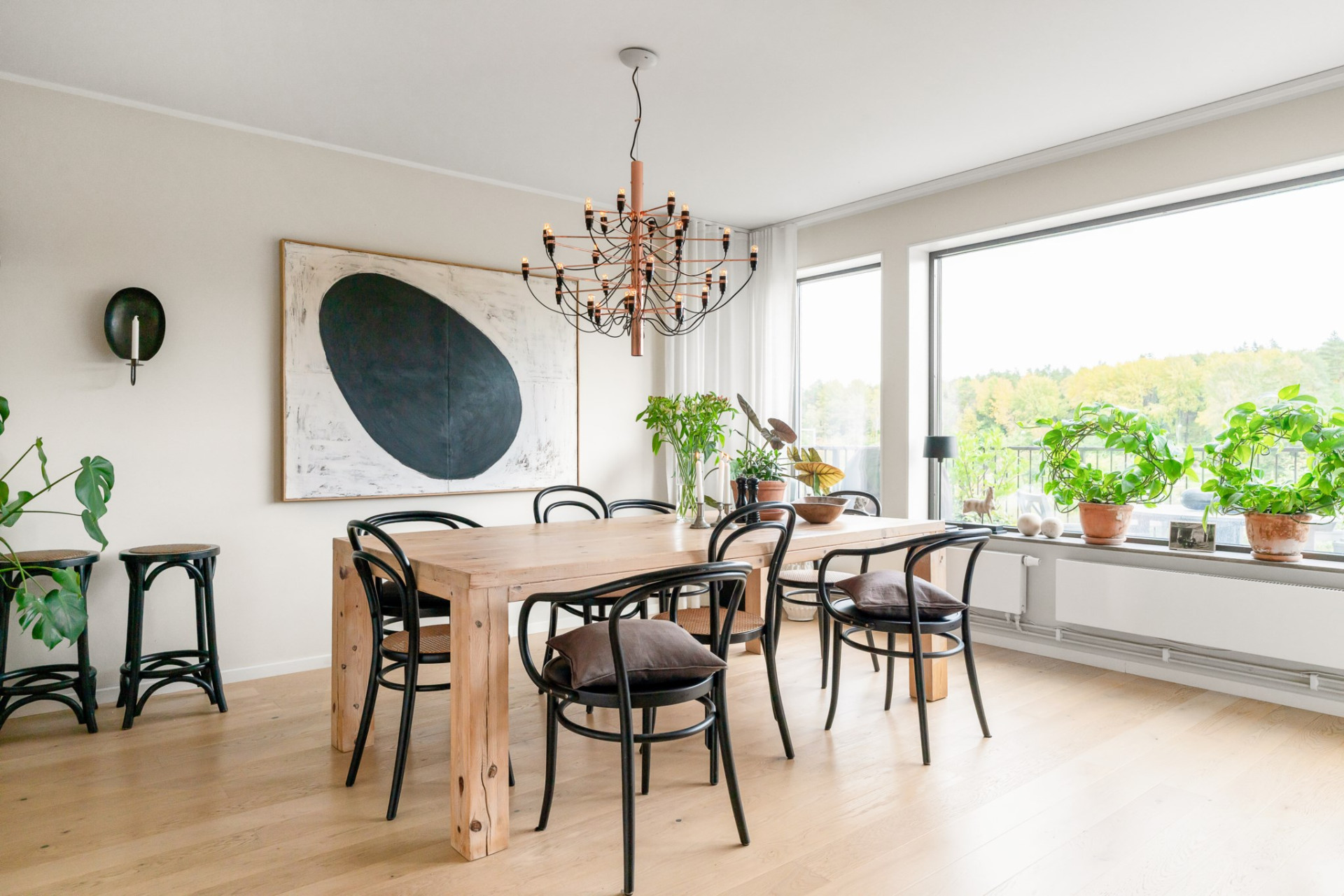 Bostaden präglas av en social och luftig planlösning där det smakfulla och praktiska köket möter ett generöst vardagsrum och matsalsdel. De stora fönsterpartierna ger ett fantastiskt ljusflöde som fyller hela våningen. Sovrummen är välplanerade och erbjuder gott om plats för både förvaring och möblering, och de två badrummen – ett större badrum samt ett mindre duschrum – gör vardagen extra bekväm.