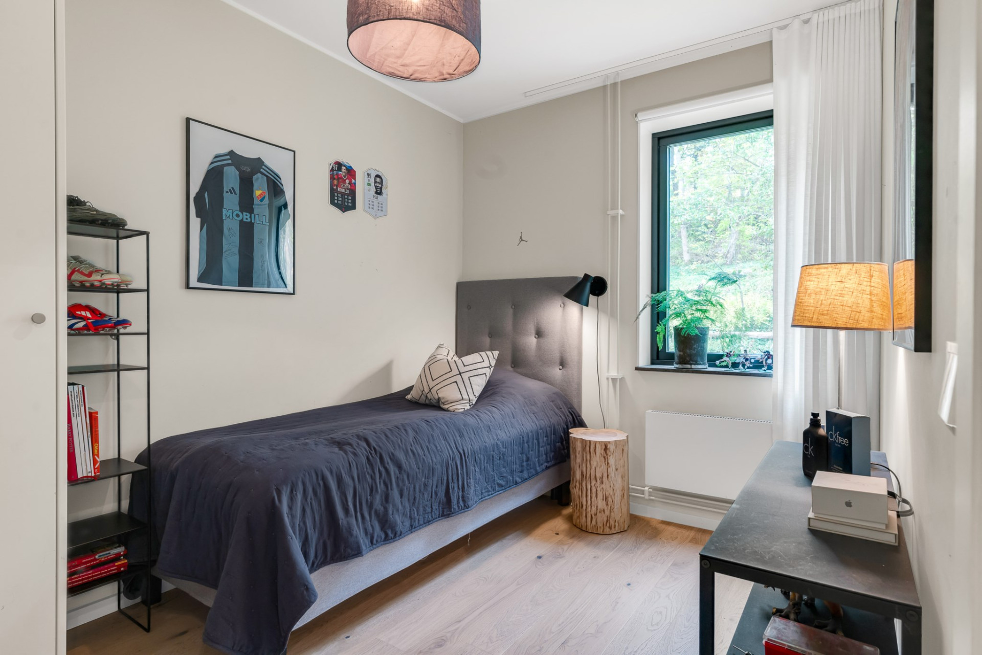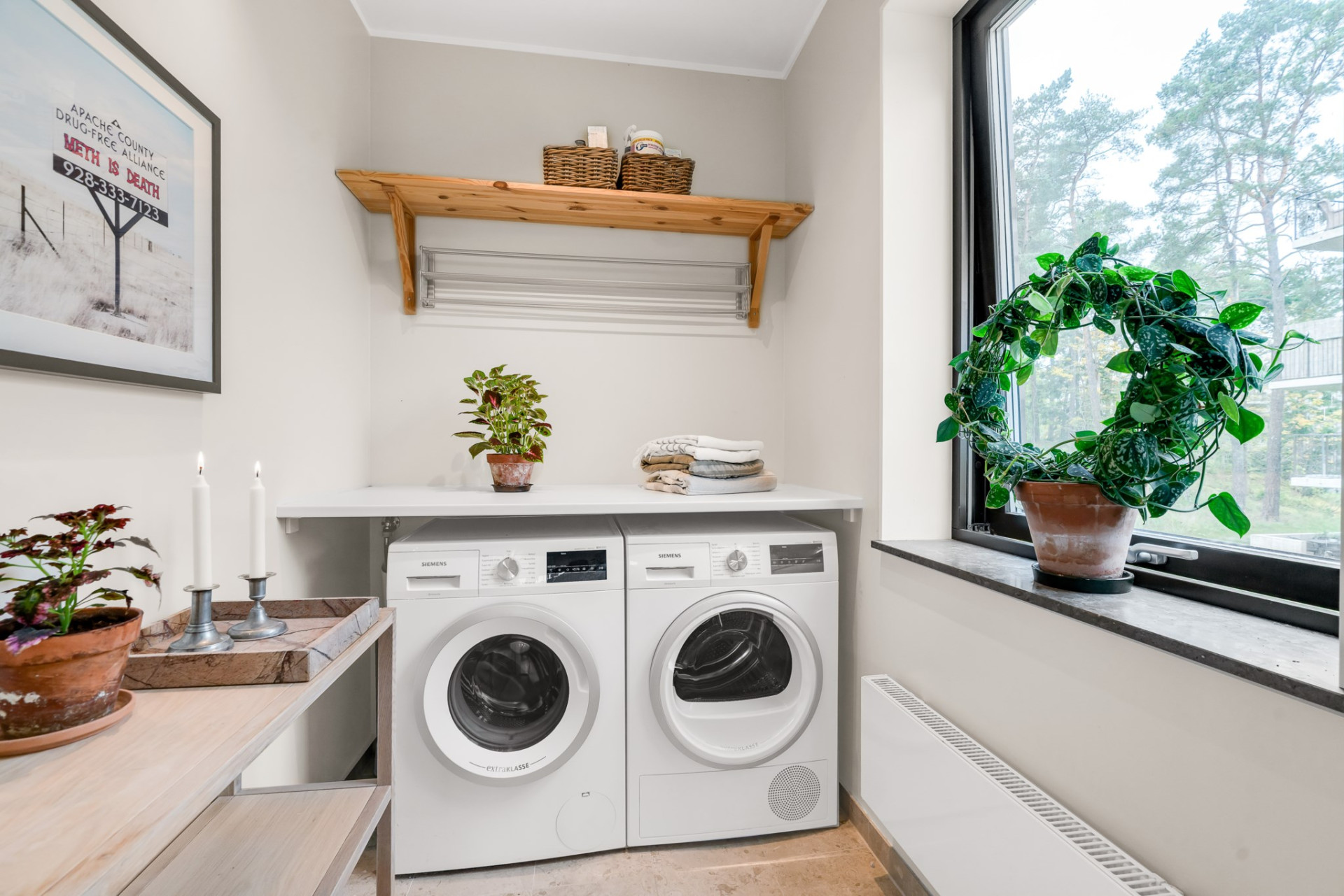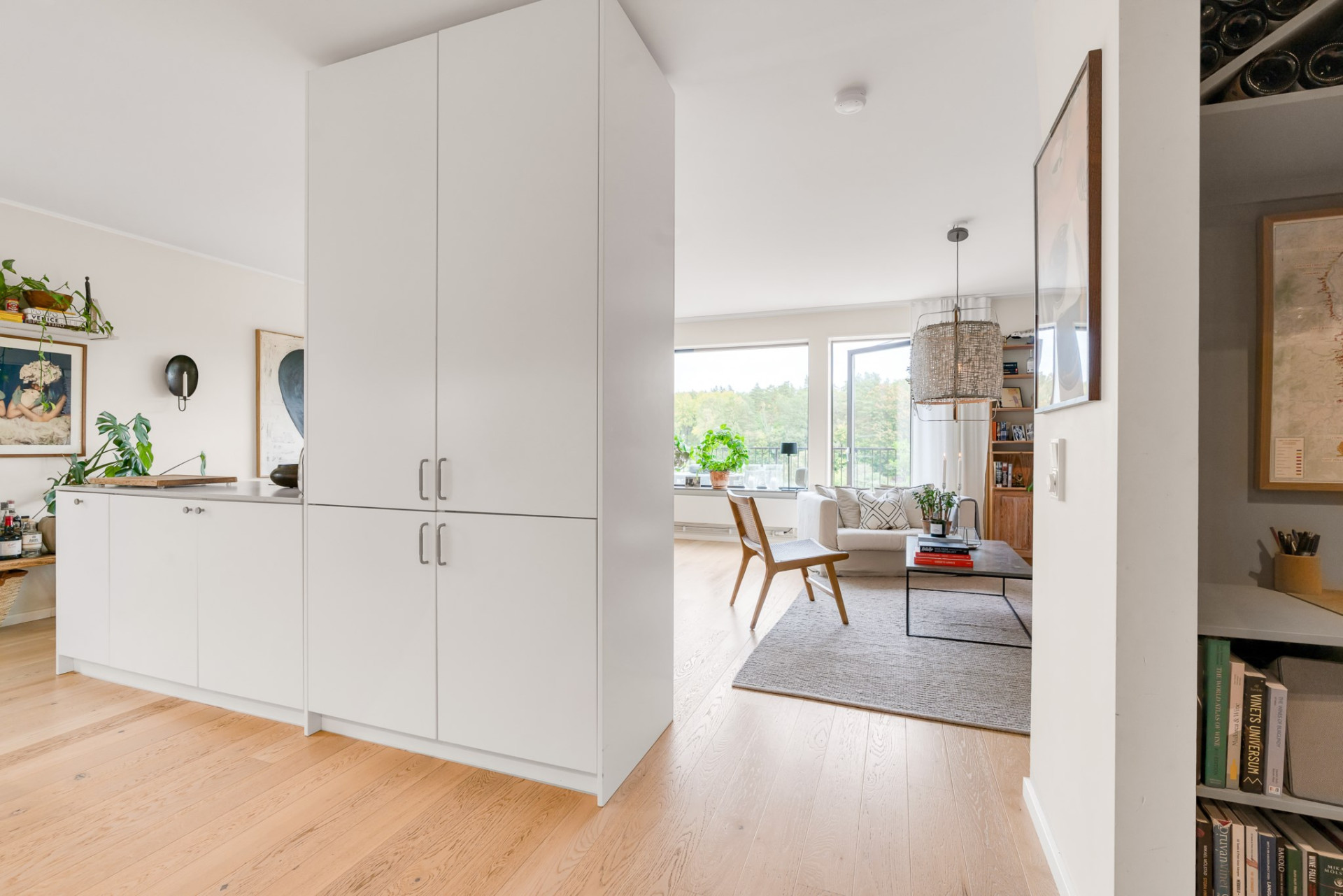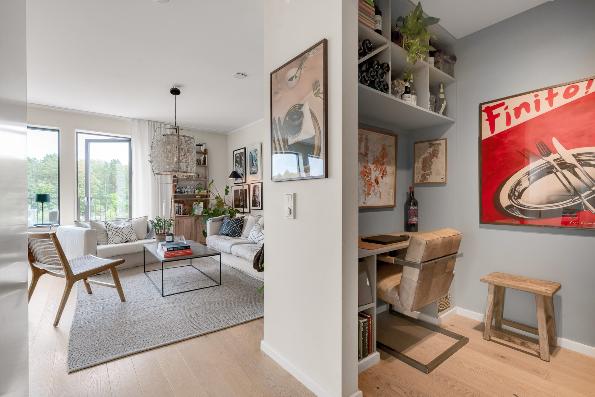 Genomgående fina materialval och en genomtänkt helhet löper som en röd tråd genom hemmet. Tvättstugan är smart placerad i ett eget rum och det ursprungliga förrådet är ombyggt till en liten kontorsdel i kombination med praktiska hyllor och vinkyl. Ett boende som kombinerar funktion, stil och naturnära trivsel på bästa sätt. Hissen i fastigheten går direkt ner till garaget och på hustaket i fastigheten finns solceller.