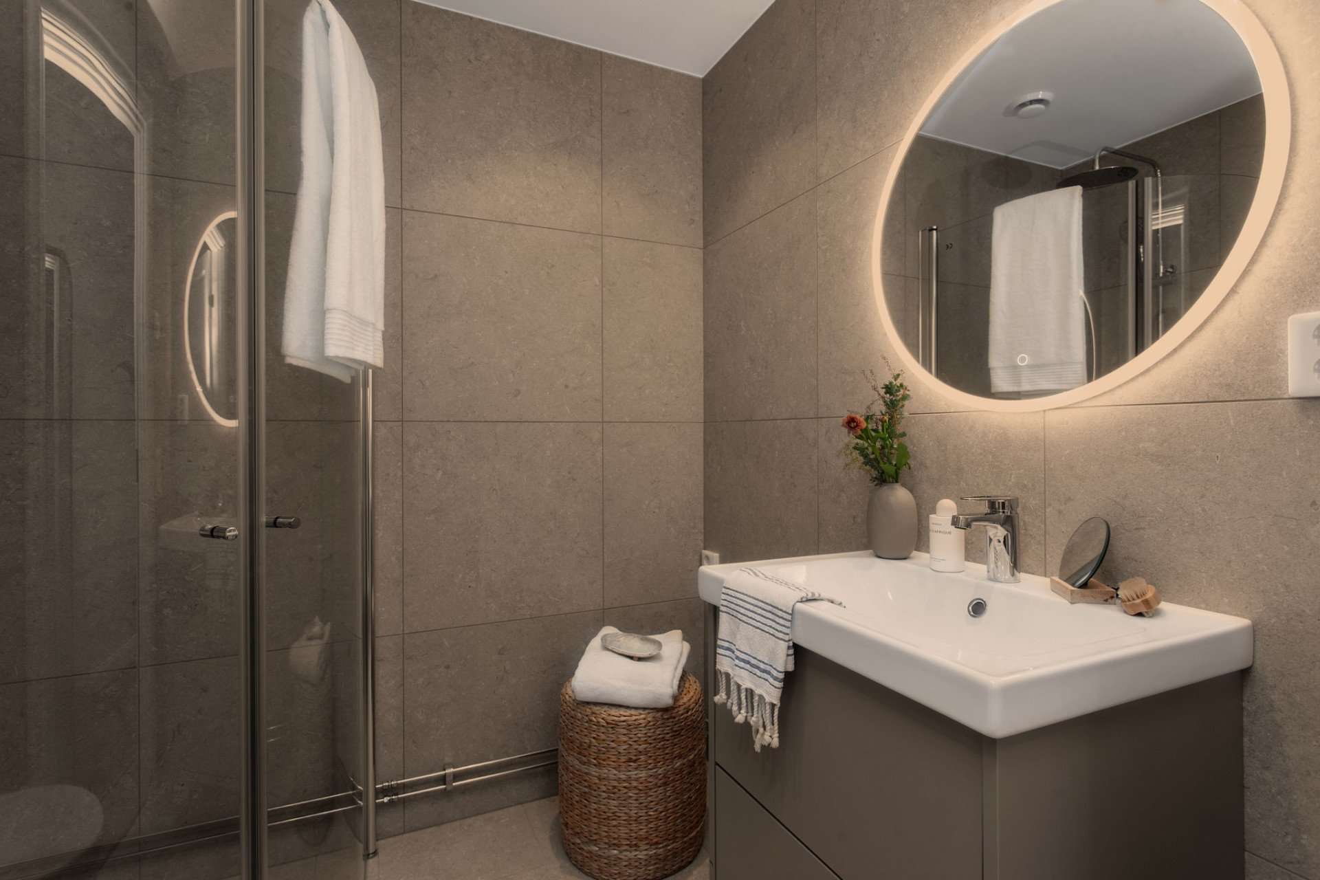Nybyggnationen har gjorts med stor omsorg och känsla för kvalitet – genomgående fiskbenslagd ekparkett, mjukt balanserad färgsättning och noggrant utvalda materialval. Kök, matplats och vardagsrum ligger i en öppen planlösning som bjuder in till både socialt umgänge och avkoppling. Lägenheten rymmer två sovrum, ett stilrent badrum med dusch, wc och platsbyggd kommod samt en klädkammare.