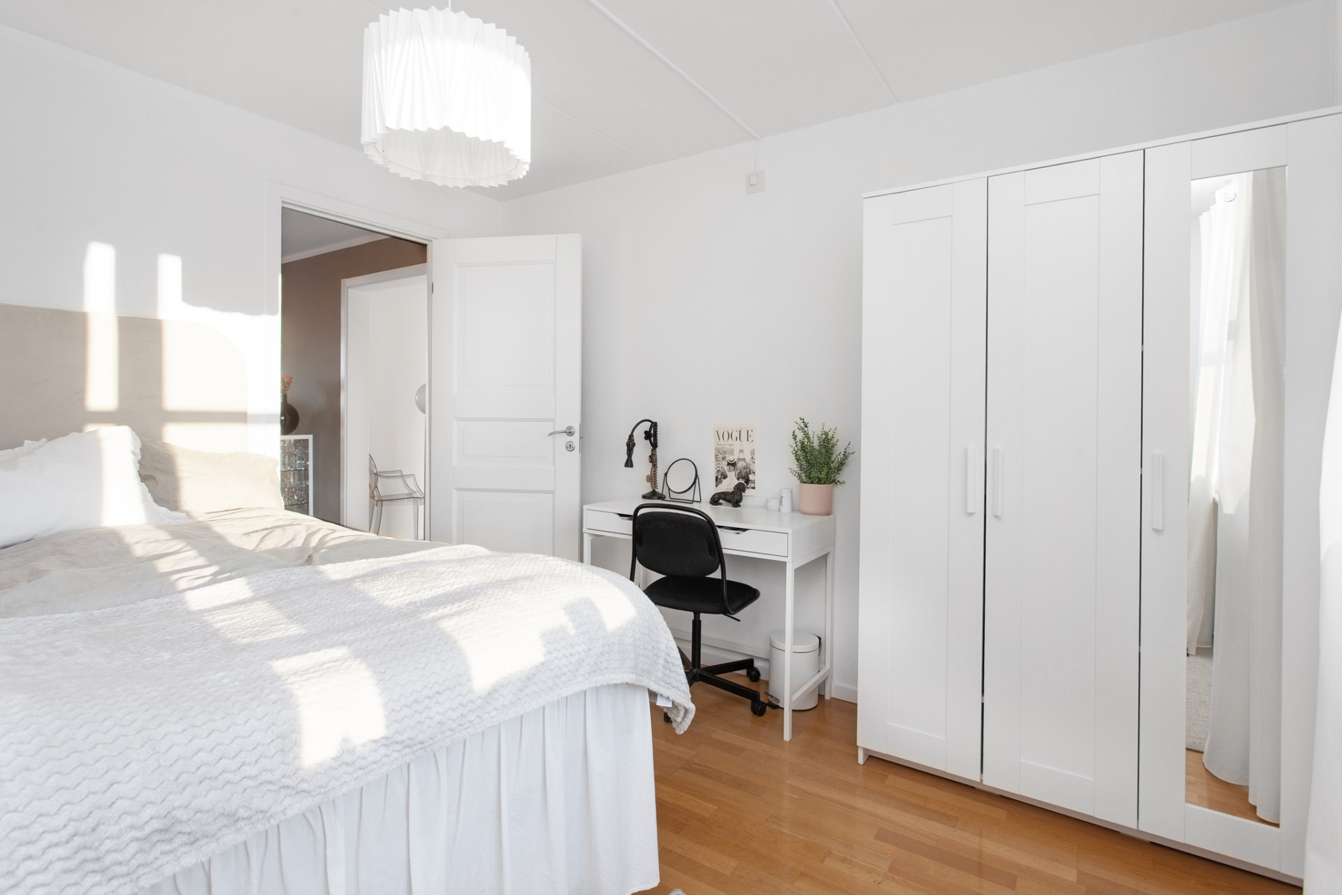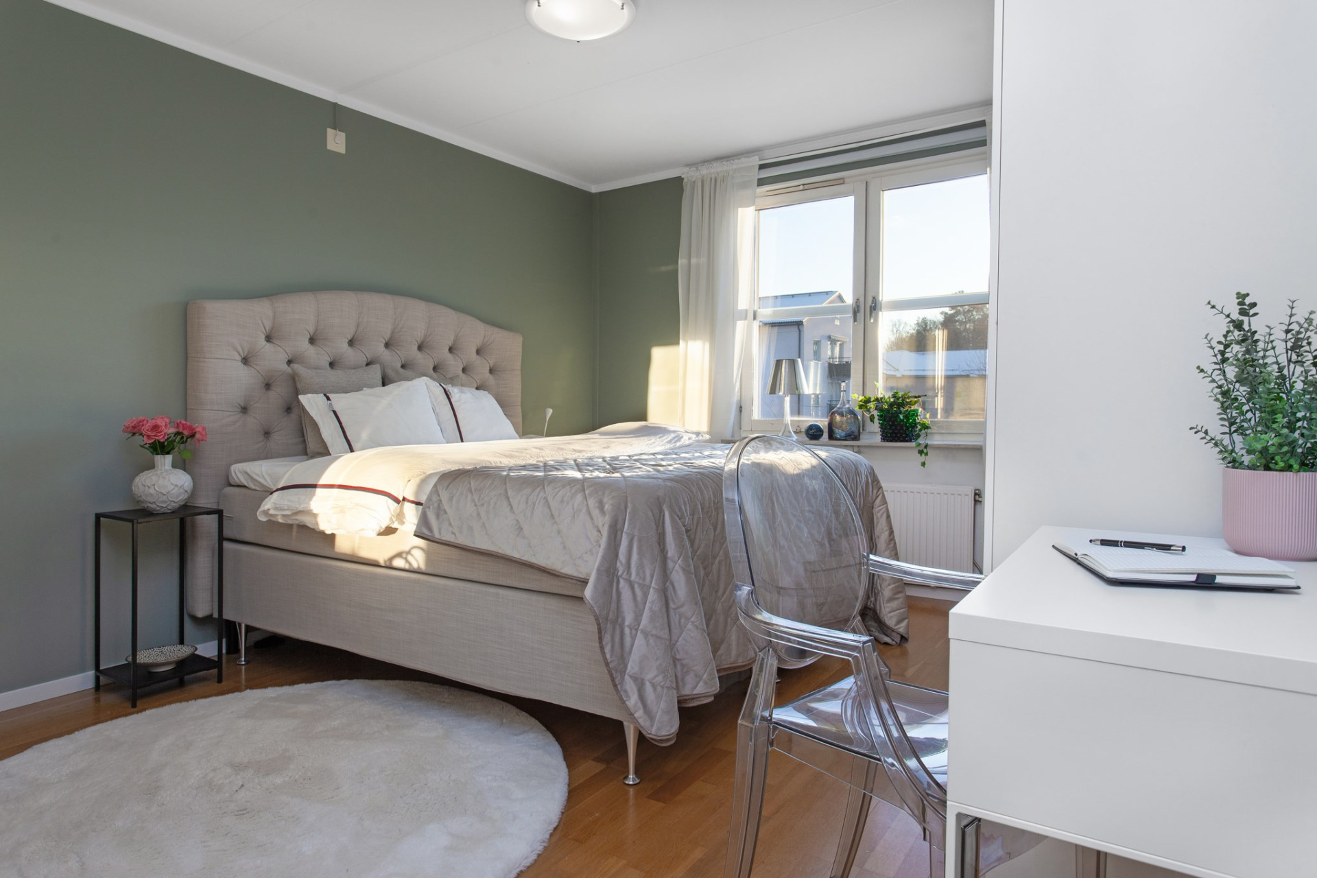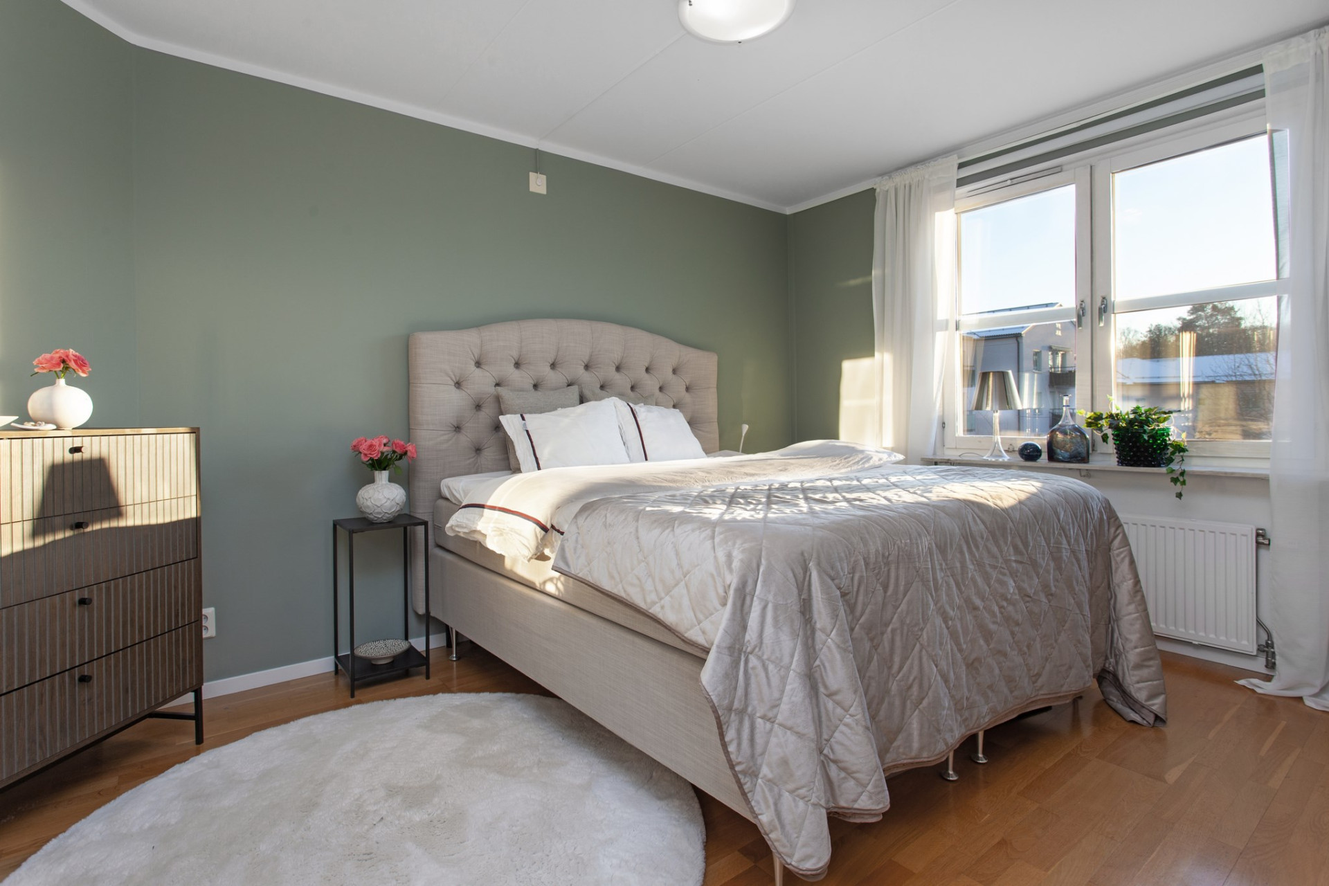 SOVRUM 3Ljust och inbjudande sovrum med fint ljusinsläpp och en härlig utsikt som ger rummet extra rymd. Här finns en smart, praktisk förbättring där säljaren har förlängt väggen vid sängens huvudända och samtidigt satt in en smalare dörr – en lösning som gör rummet mer lättmöblerat och som möjliggör att en 105 cm säng får plats utan problem. Den neutrala färgsättningen tillsammans med parkettgolvet skapar en tidlös bas som är enkel att inreda, och rummet passar utmärkt som barnrum, tonårsrum eller gästrum. Ett rofyllt sovrum med genomtänkta detaljer som gör stor skillnad i vardagen.