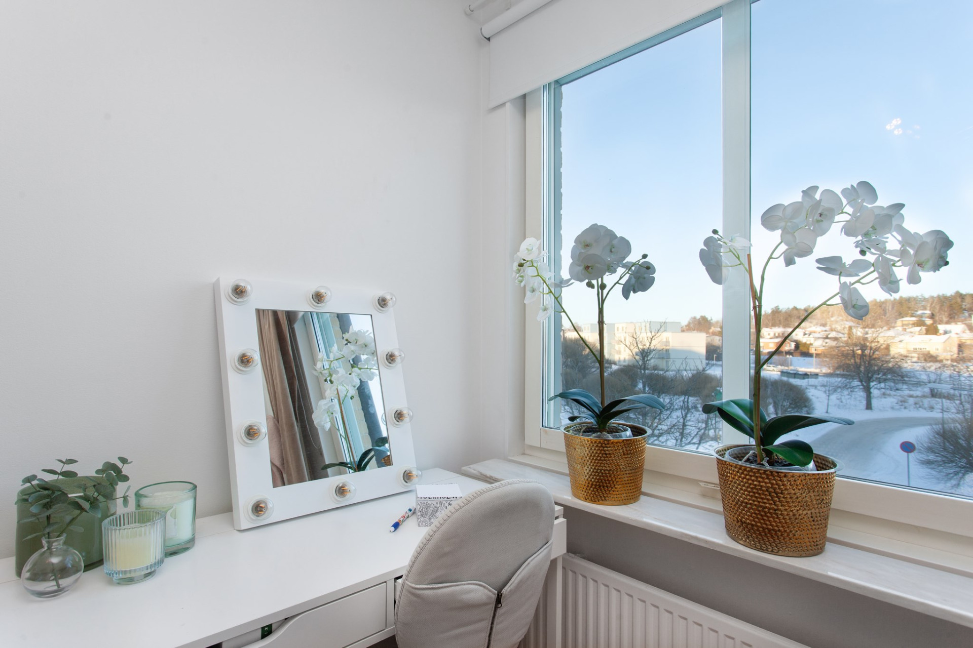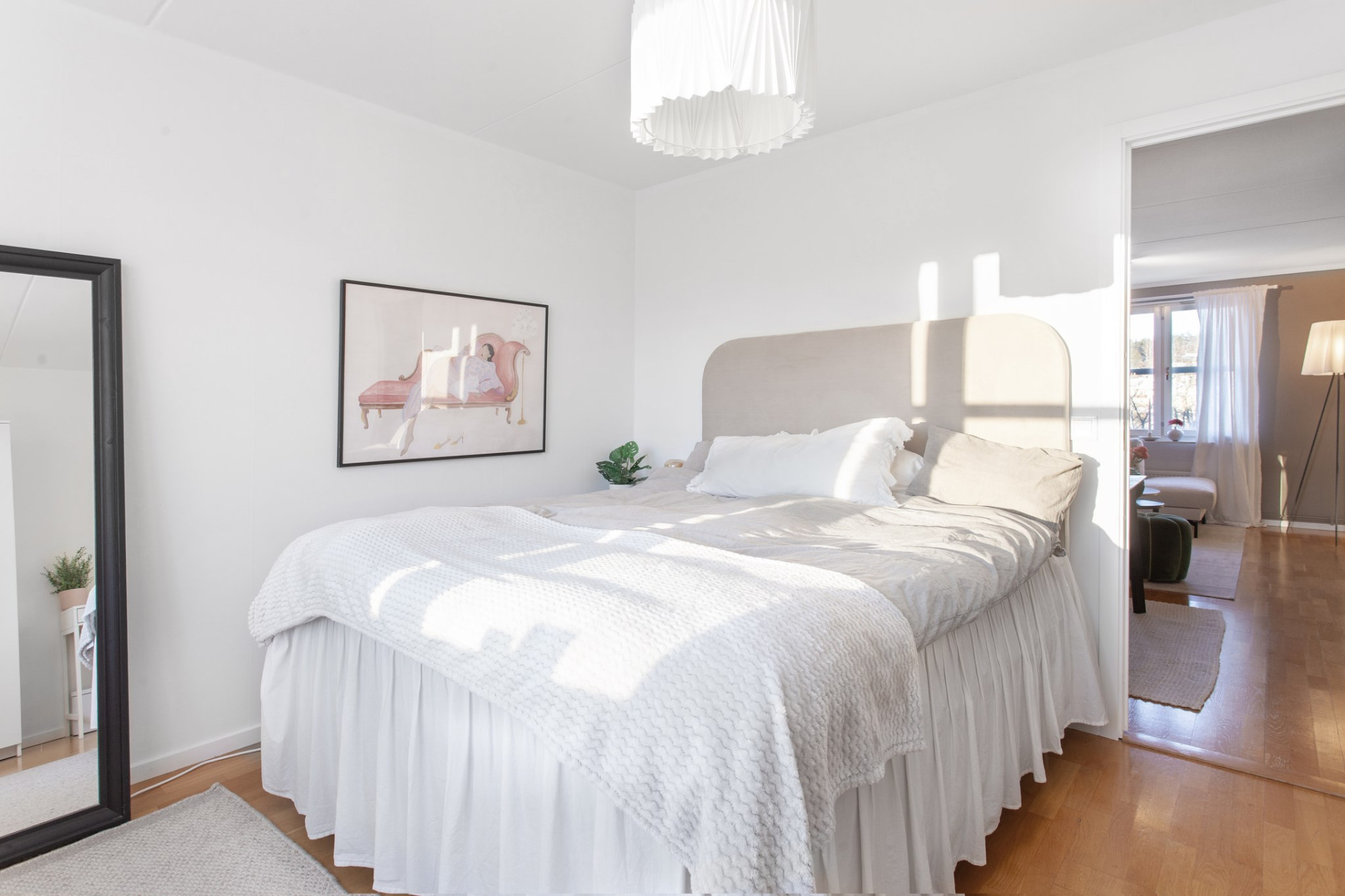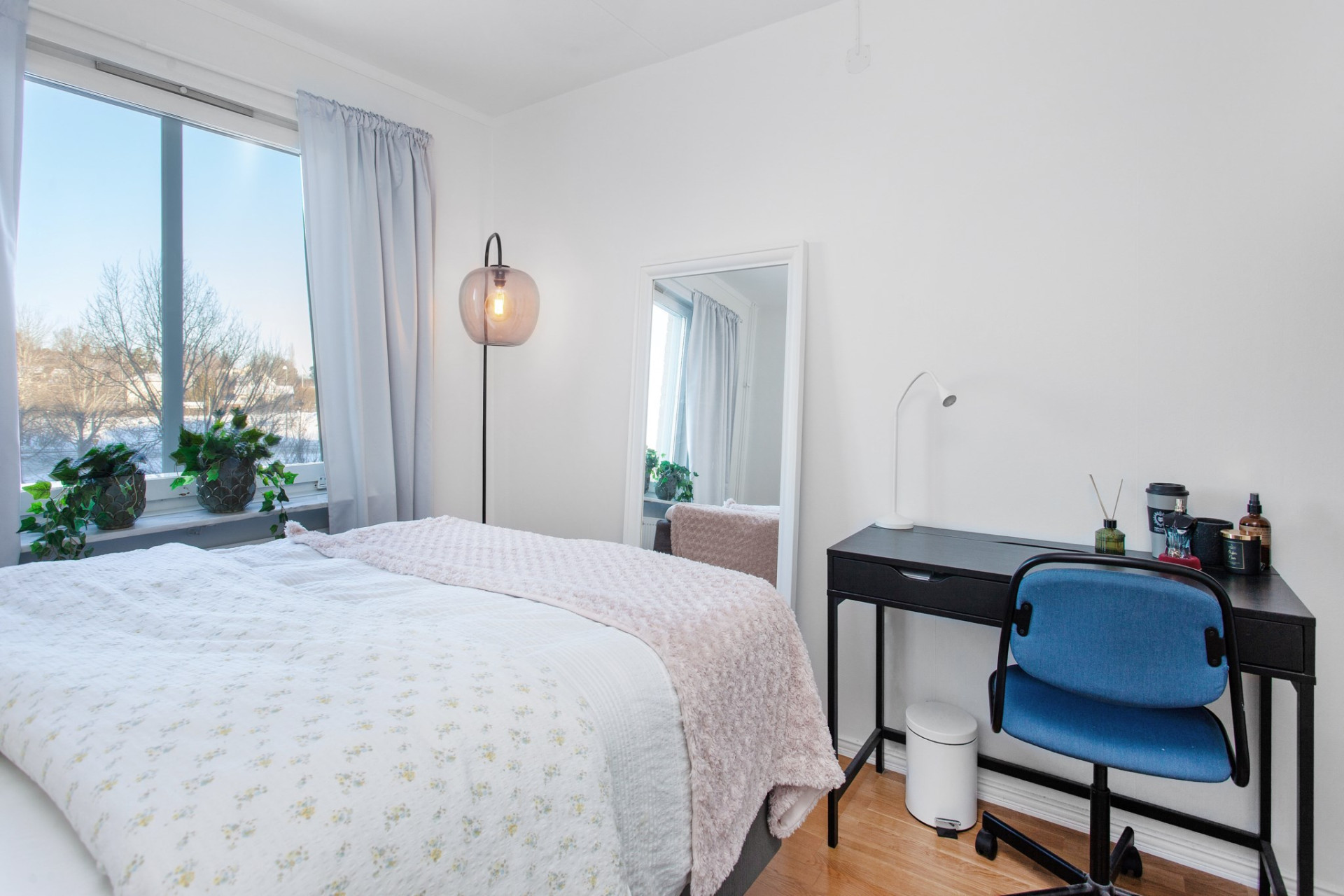 SOVRUM 3Ljust och inbjudande sovrum med fint ljusinsläpp och en härlig utsikt som ger rummet extra rymd. Här finns en smart, praktisk förbättring där säljaren har förlängt väggen vid sängens huvudända och samtidigt satt in en smalare dörr – en lösning som gör rummet mer lättmöblerat och som möjliggör att en 105 cm säng får plats utan problem. Den neutrala färgsättningen tillsammans med parkettgolvet skapar en tidlös bas som är enkel att inreda, och rummet passar utmärkt som barnrum, tonårsrum eller gästrum. Ett rofyllt sovrum med genomtänkta detaljer som gör stor skillnad i vardagen.