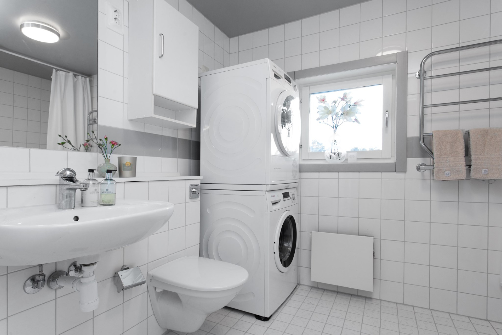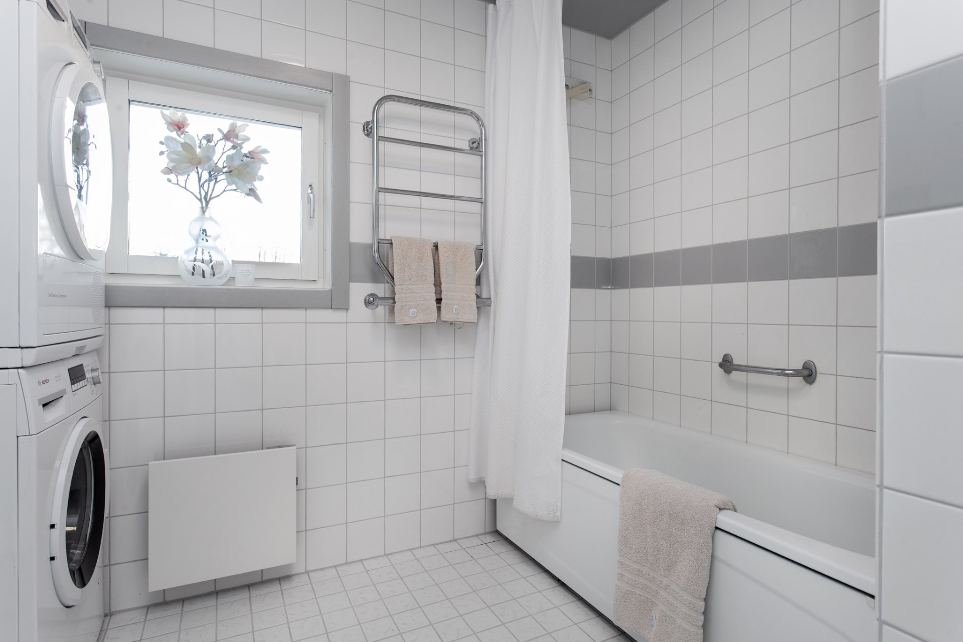 BADRUM 1Stilrent och rymligt badrum i tidlös färgsättning med helkaklade väggar och ett fint ljusinsläpp från fönster som ger rummet en extra fräsch och luftig känsla. Här erbjuds en praktisk och mycket uppskattad vardagslyx i form av egen tvättavdelning med tvättmaskin och torktumlare i stapel – smidigt och platsbesparande. Badrummet är välplanerat med handfat och förvaring, wc samt badkar för sköna badstunder. Kompletteras av handdukstork och generösa ytor som gör rummet lätt att använda även för familjen. Ett funktionellt badrum med allt på plats – och den där extra bekvämligheten som gör stor skillnad i vardagen.