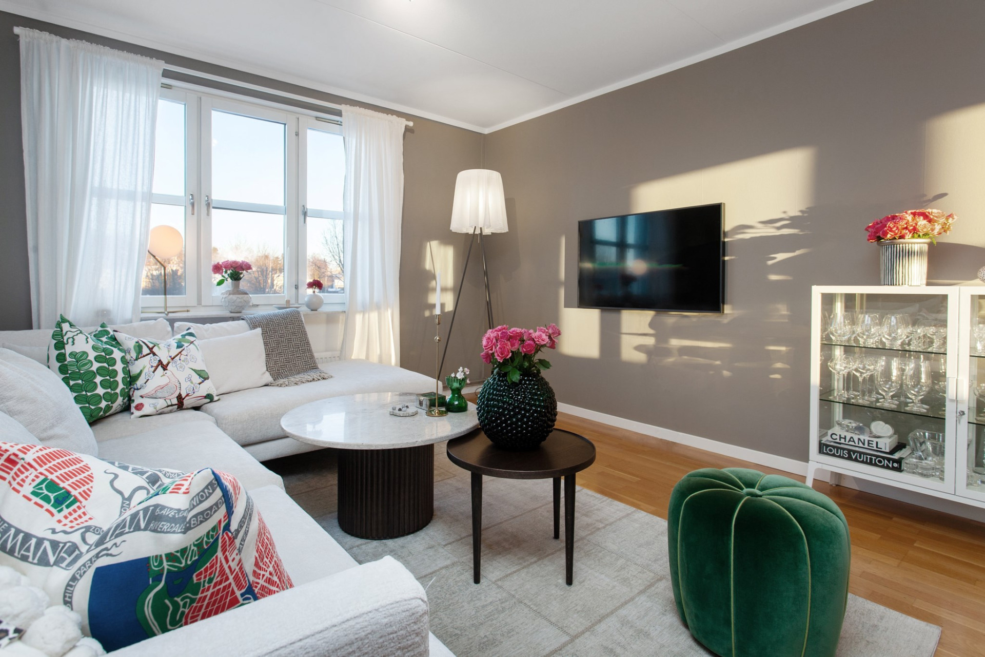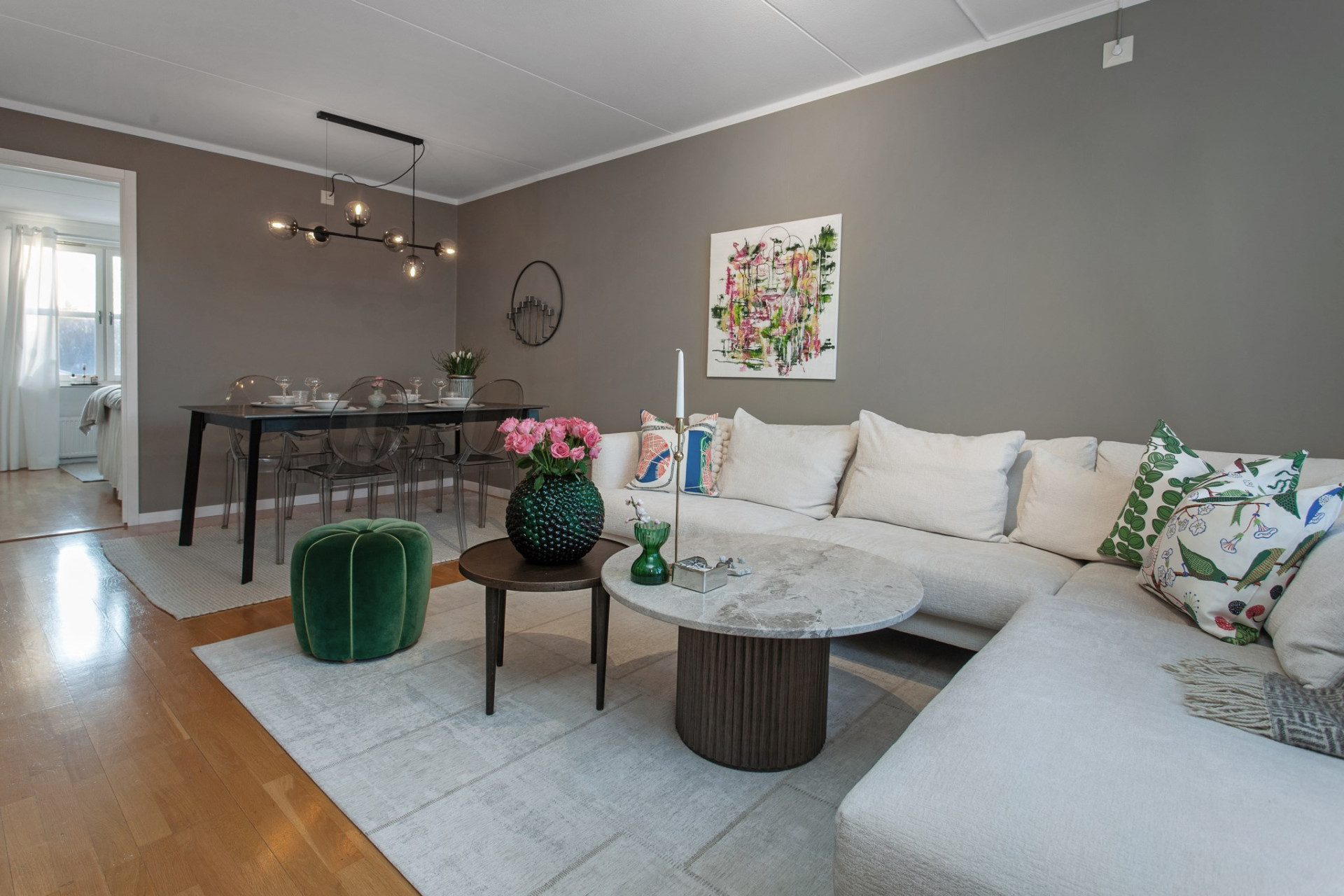 VARDAGSRUMLjust och generöst vardagsrum med en varm, ombonad känsla och gott om plats för både socialt umgänge och avkoppling. Rummet bjuder på fina sällskapsytor där soffgrupp och matplats samsas på ett naturligt sätt – perfekt för såväl middagar med vänner som lugna kvällar hemma. De stora fönsterpartierna ger ett härligt ljusinsläpp och skapar en luftig atmosfär, samtidigt som den stilrena färgsättningen och parkettgolvet ger en elegant helhet. Ett lättmöblerat och inbjudande rum som blir hemmets självklara samlingspunkt.