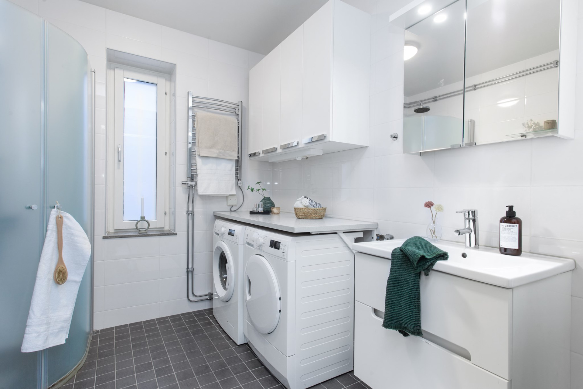 BadrumLjust och stilfullt helkaklat badrum med vitt kakel och grått klinker. Utrustat med tvättmaskin och torktumlare, bänkskiva ovanför med väggmonterat badrumsskåp. Handfat och wc i vitt porslin, kommod under handfat och spegelskåp ovan. Handdukstork med värmefunktion samt badrumsskåp med speglar och belysning. Duschhörna med frostade vikdörrar av glas, handdusch och frostat fönsterparti som ger ett vackert ljusinsläpp.