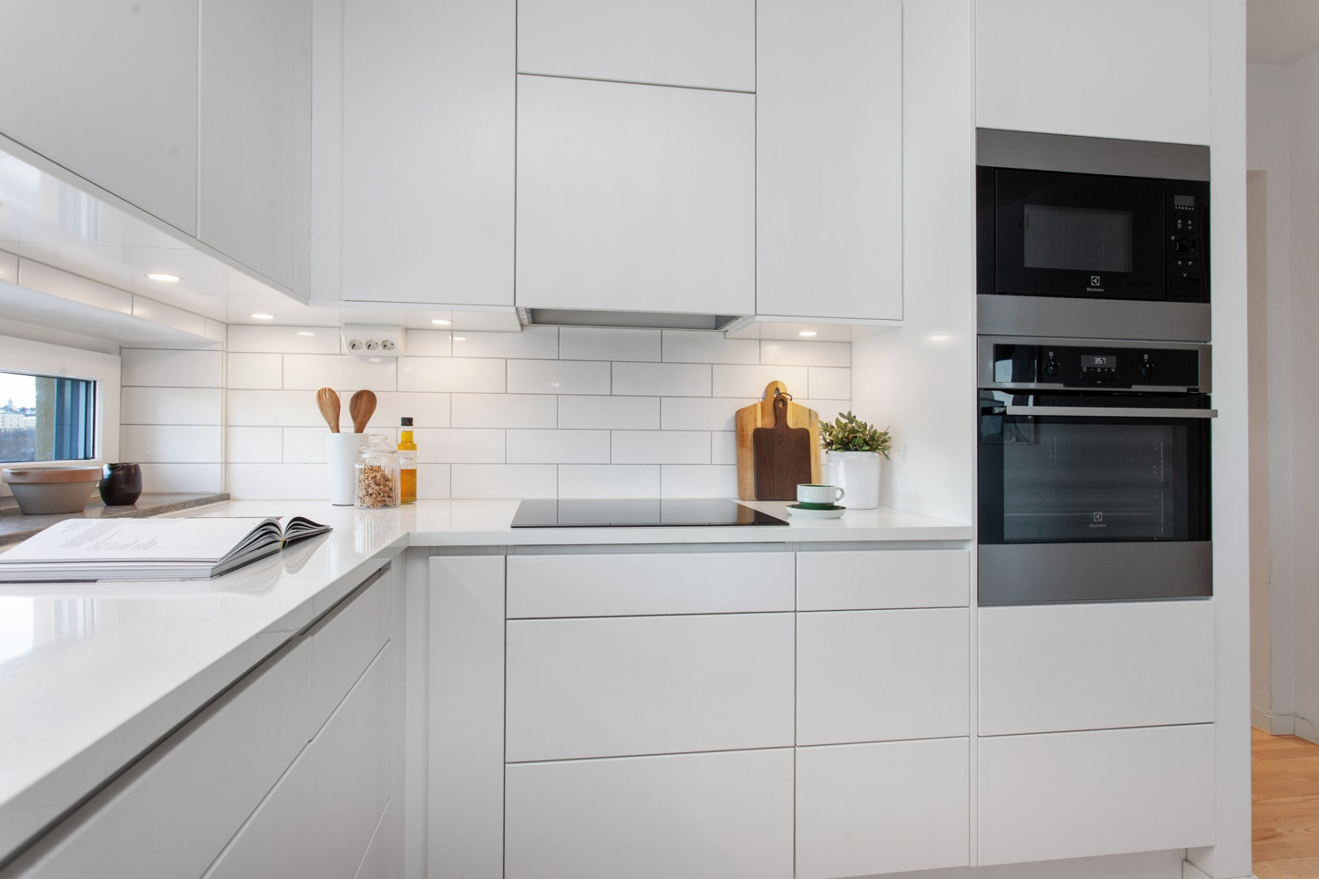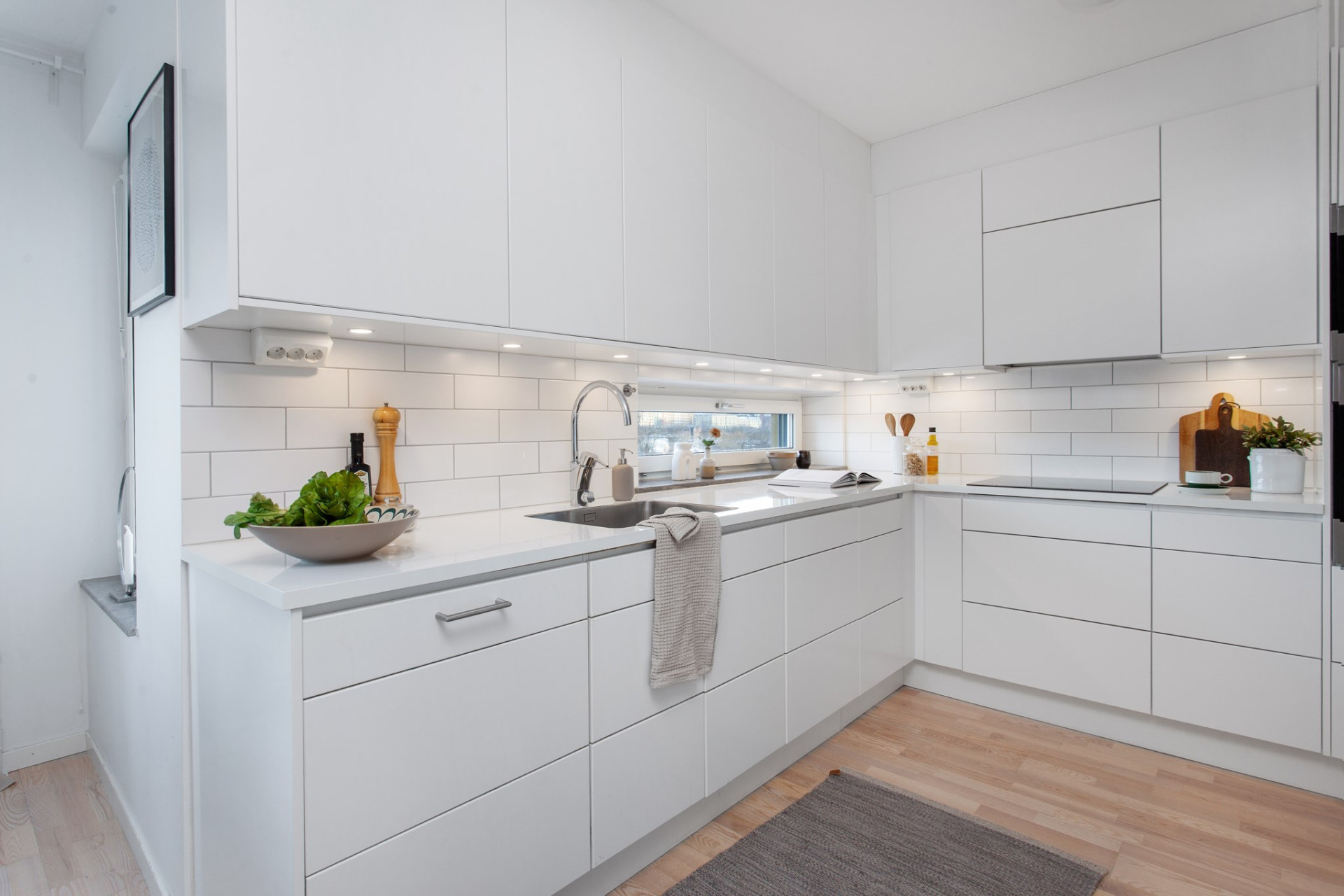 KökStilfullt kök med gott om förvaring i form av över och underskåp samt generöst med arbetsyta. Vita köksluckor och vitt kakel ovan arbetsbänk med bänkskiva i trä. Utrustat med spishäll, två diskhoar med blandare, fläkt, inbyggd ugn och micro samt kyl och frys.