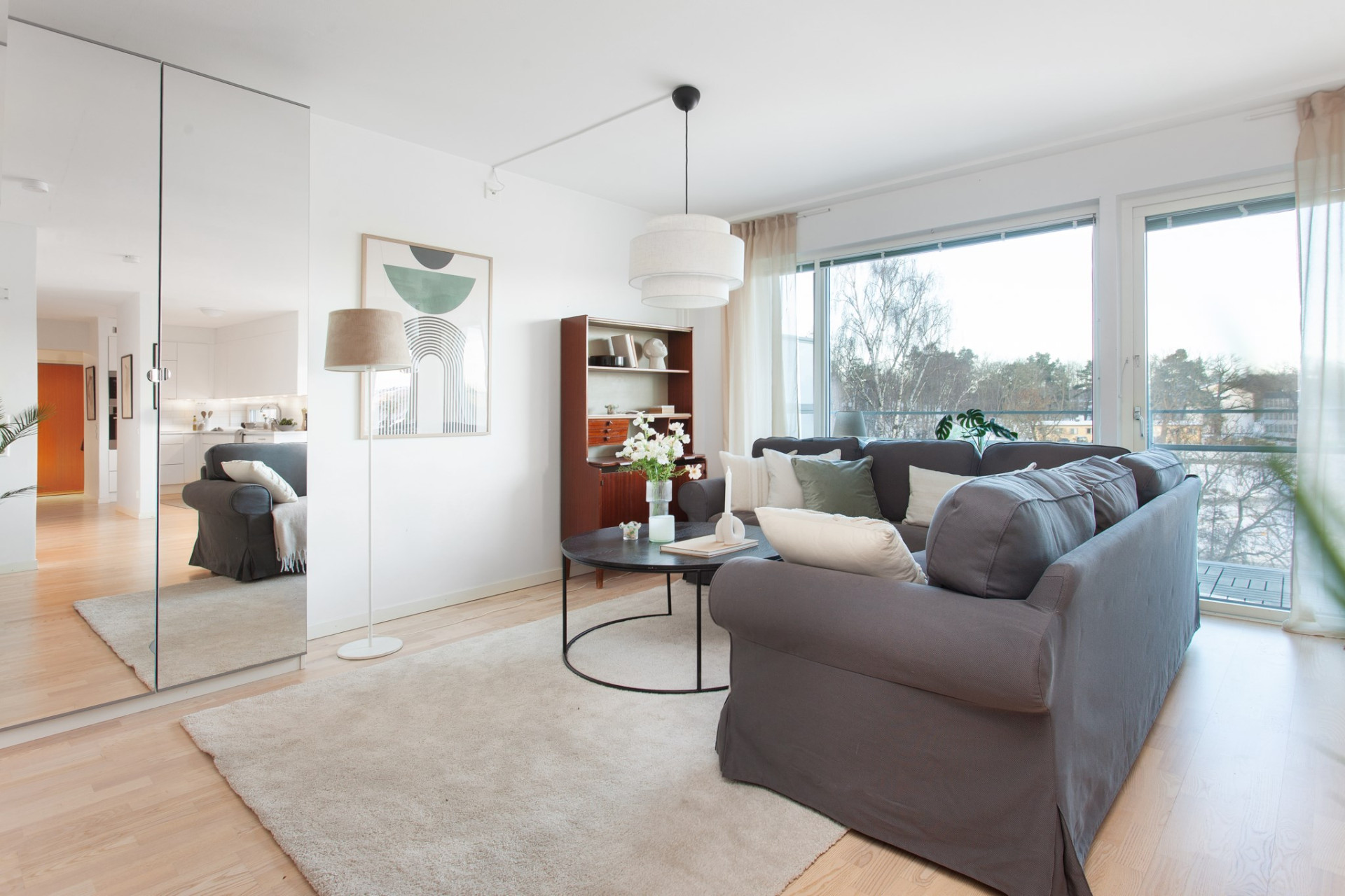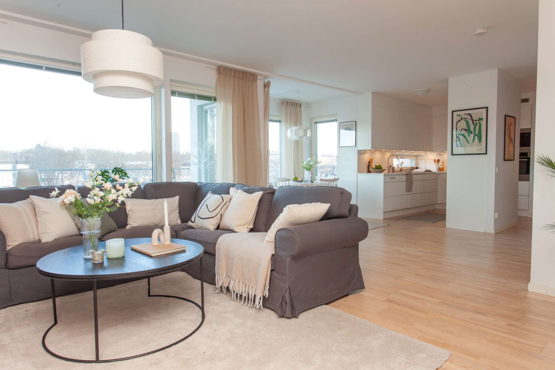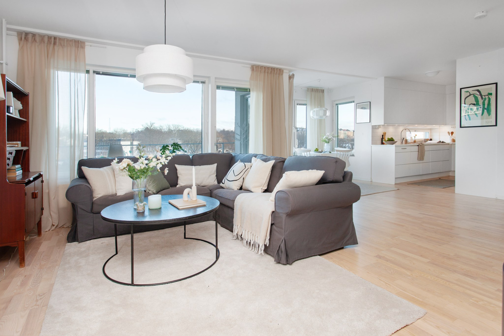 VardagsrumPlats för större soffgrupp och matbord. Social och öppen planlösning mellan kök och vardagsrum. Fantastiskt ljusinsläpp från de stora fönsterpartierna med utsikt mot Karlbergskanalen. Från vardagsrummet nås den stora balkongen med plats för utemöbler och växter.