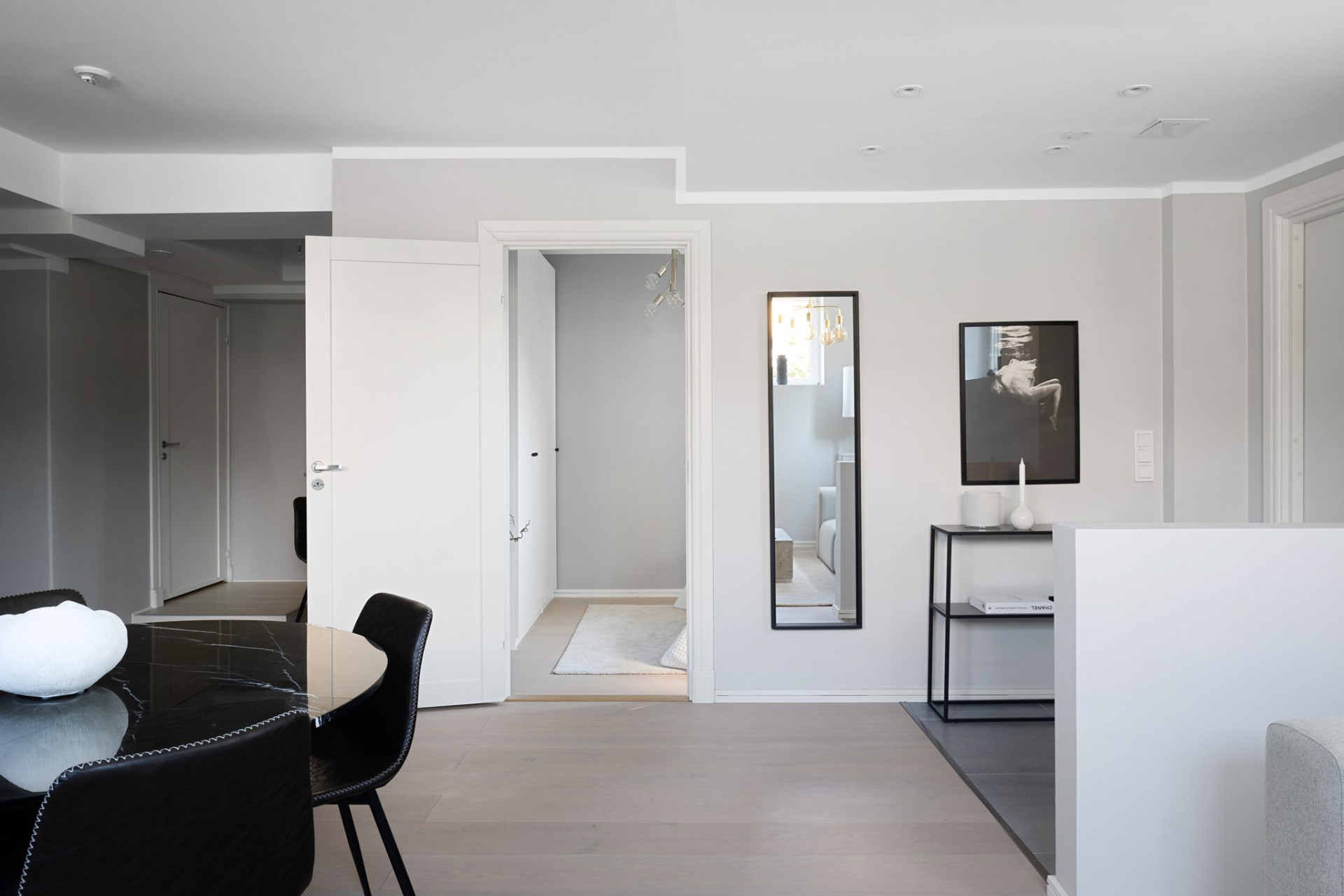 Vidare in i bostaden öppnar det välplanerade köket upp sig i en stilsäker interiör. Här finns en elegant bänkskiva i carraramarmor, generösa arbetsytor och gott om förvaring. Köket är fullt utrustat med kyl/frys, diskmaskin, tvättmaskin, glaskeramikhäll, ugn och fläkt. På golvet ligger fint ekparkettgolv som är genomgående i hela bostaden.