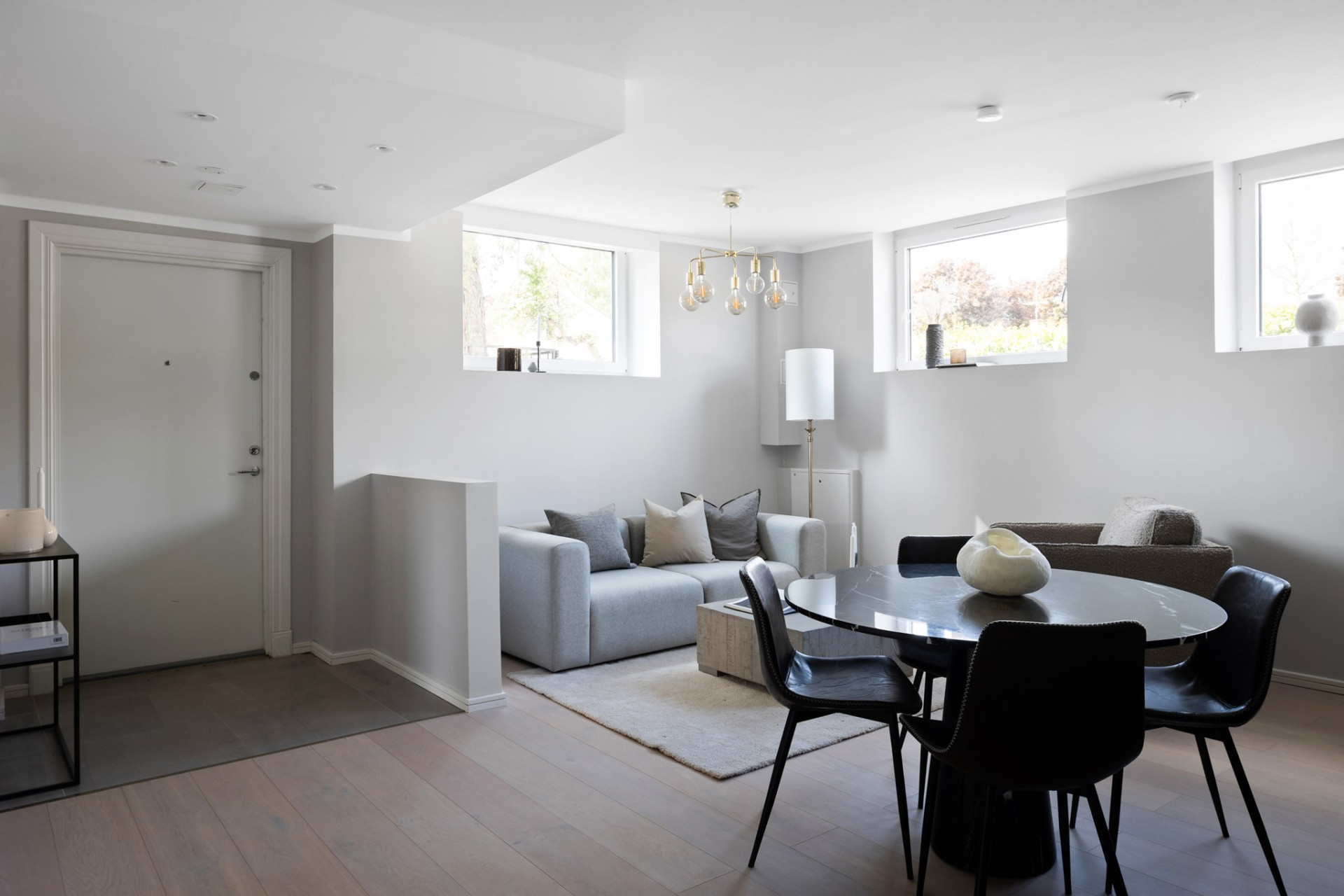 Köket smälter samman med vardagsrummet som är lättmöblerat och erbjuder gott om plats för både soffgrupp och matbord, vilket skapar en perfekt yta för såväl avkoppling som sociala tillställningar.