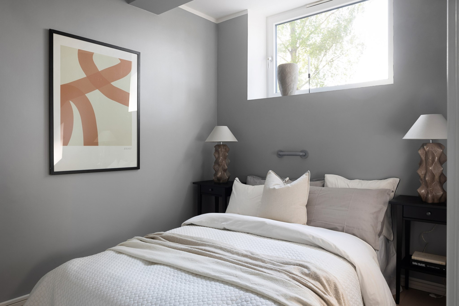 Sovrummet är rofyllt och erbjuder plats för dubbelsäng med tillhörande sidobord. Här finns utmärkta förvaringsmöjligheter i garderober.