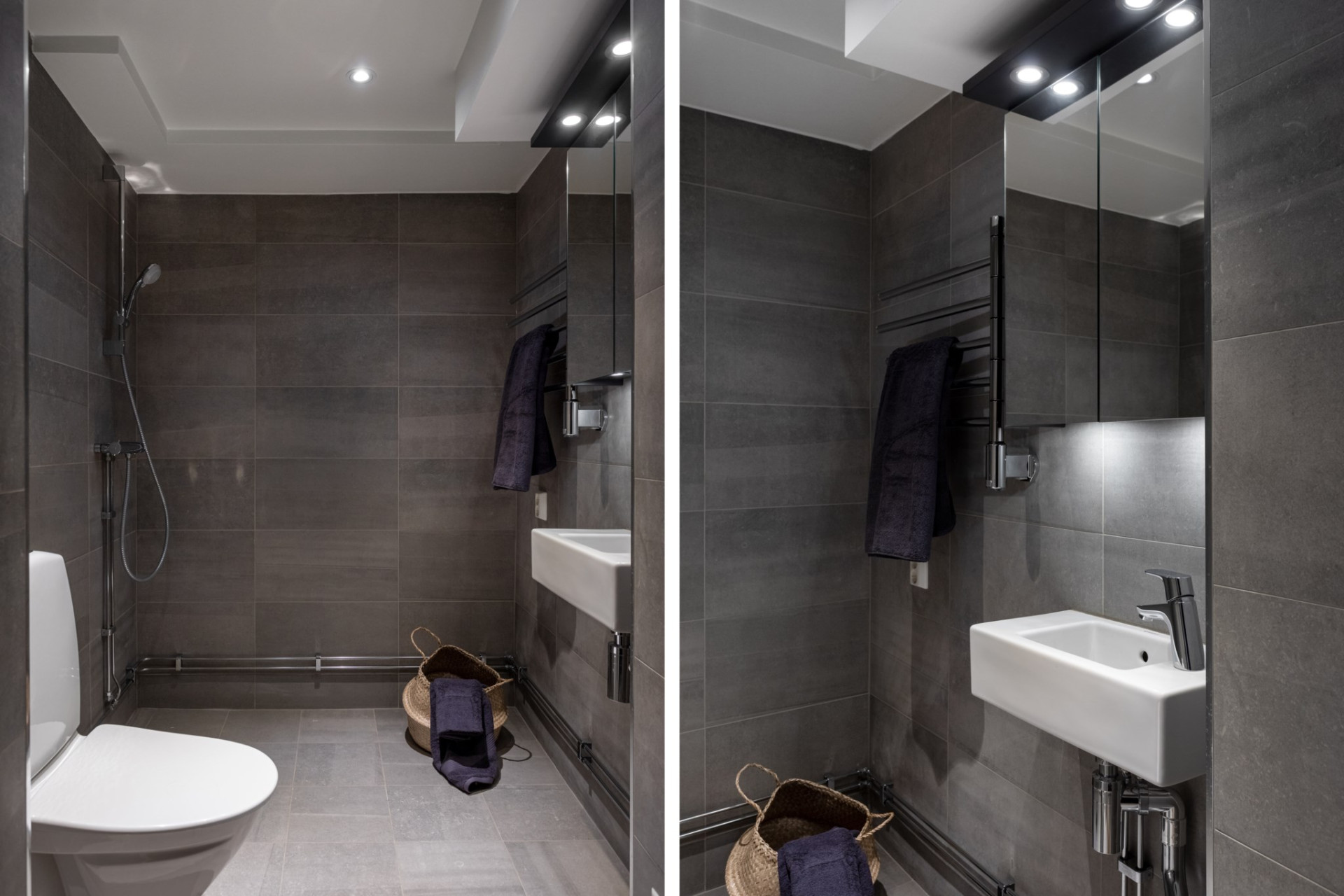 Badrummet är helkaklat med klinkergolv och håller en stilren standard. Det är utrustat med dusch, handdukstork, toalett, handfat samt spegelskåp ovan.