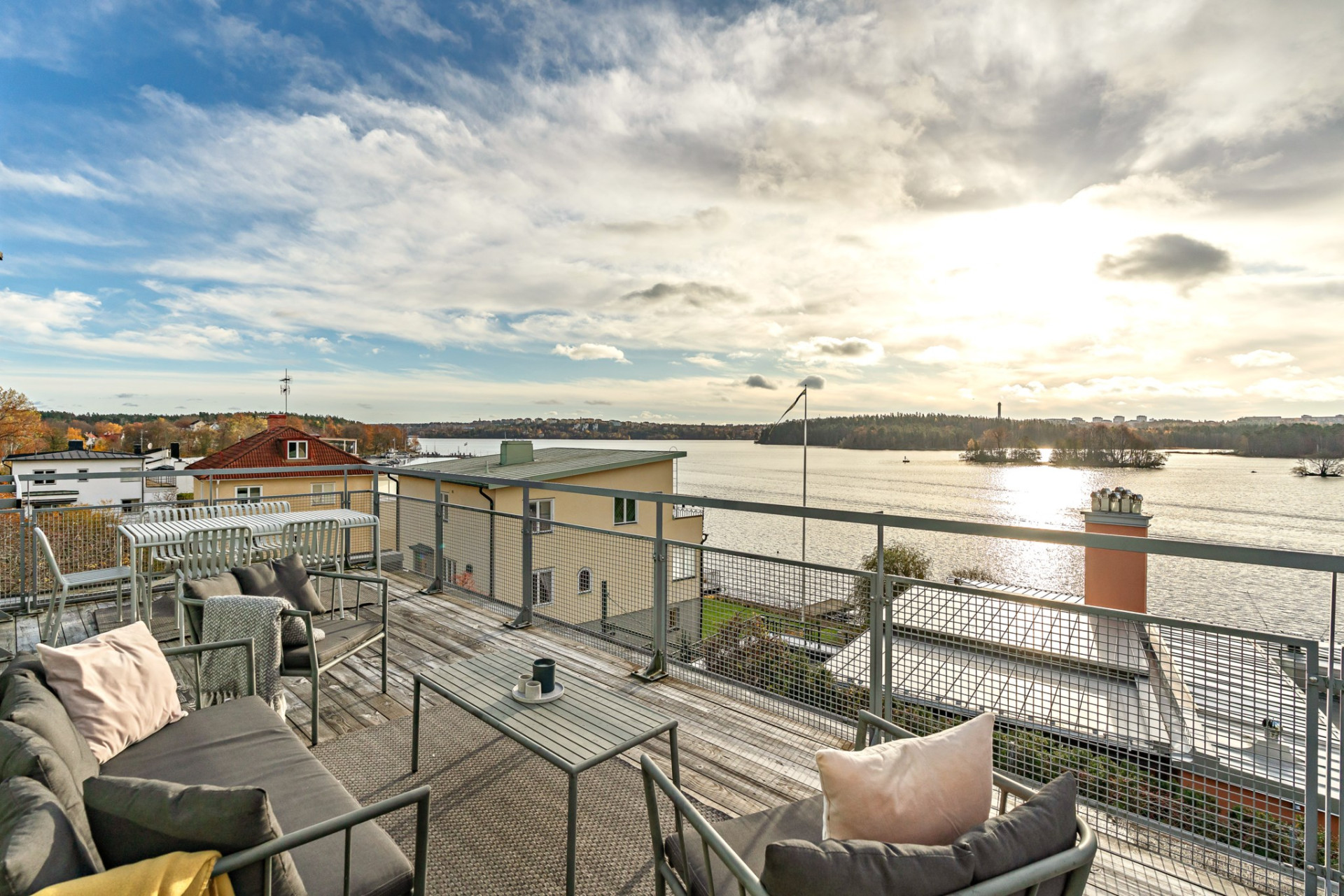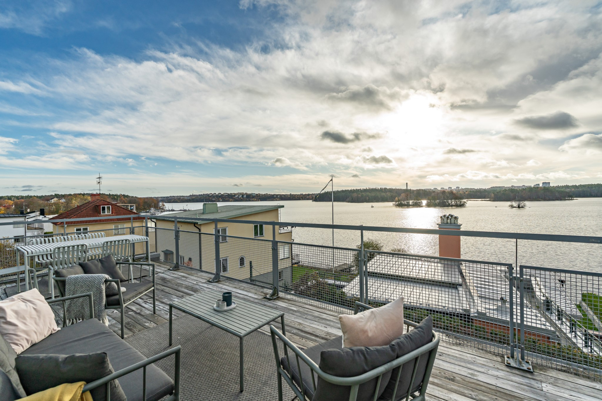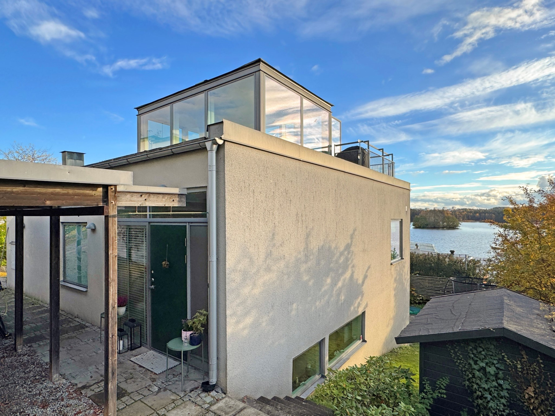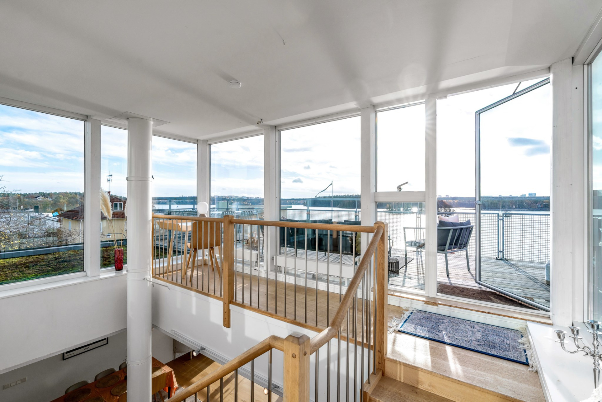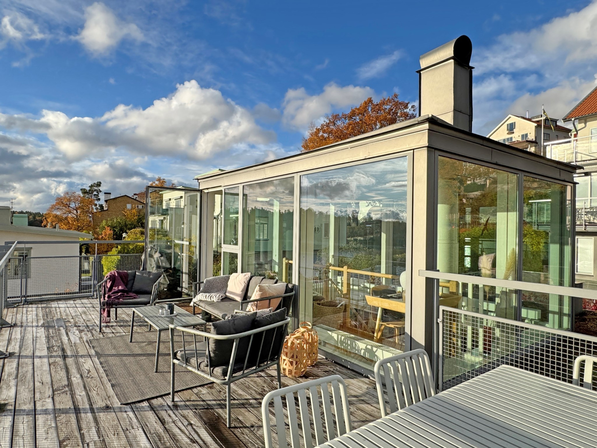 Ektrappan leder upp till lanterninen med glaspartier från golv till tak i alla väderstreck. Här finns det plats för växter, en liten arbetsplats och ett par stolar där man kan avnjuta sjöutsikten de dagar då vädret inte tillåter att man går ut på den väl tilltagna takterrassen på 26 kvm, med den svårslagna utsikten över Mälarens glittrande vatten.