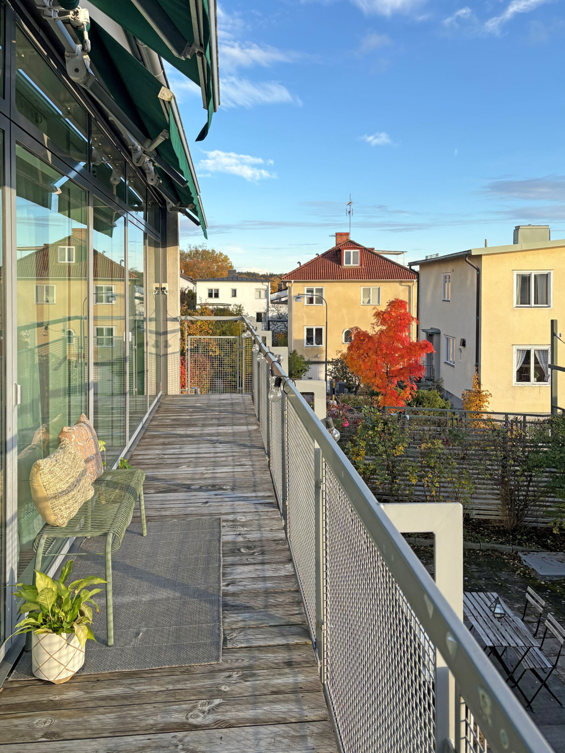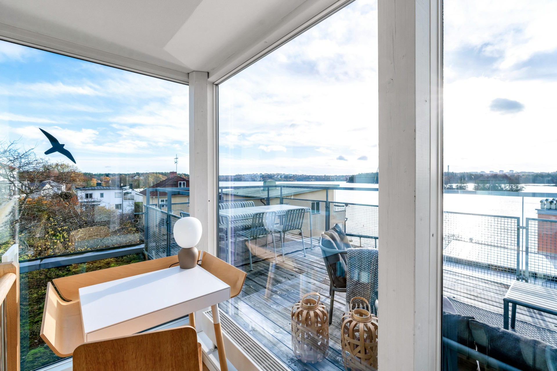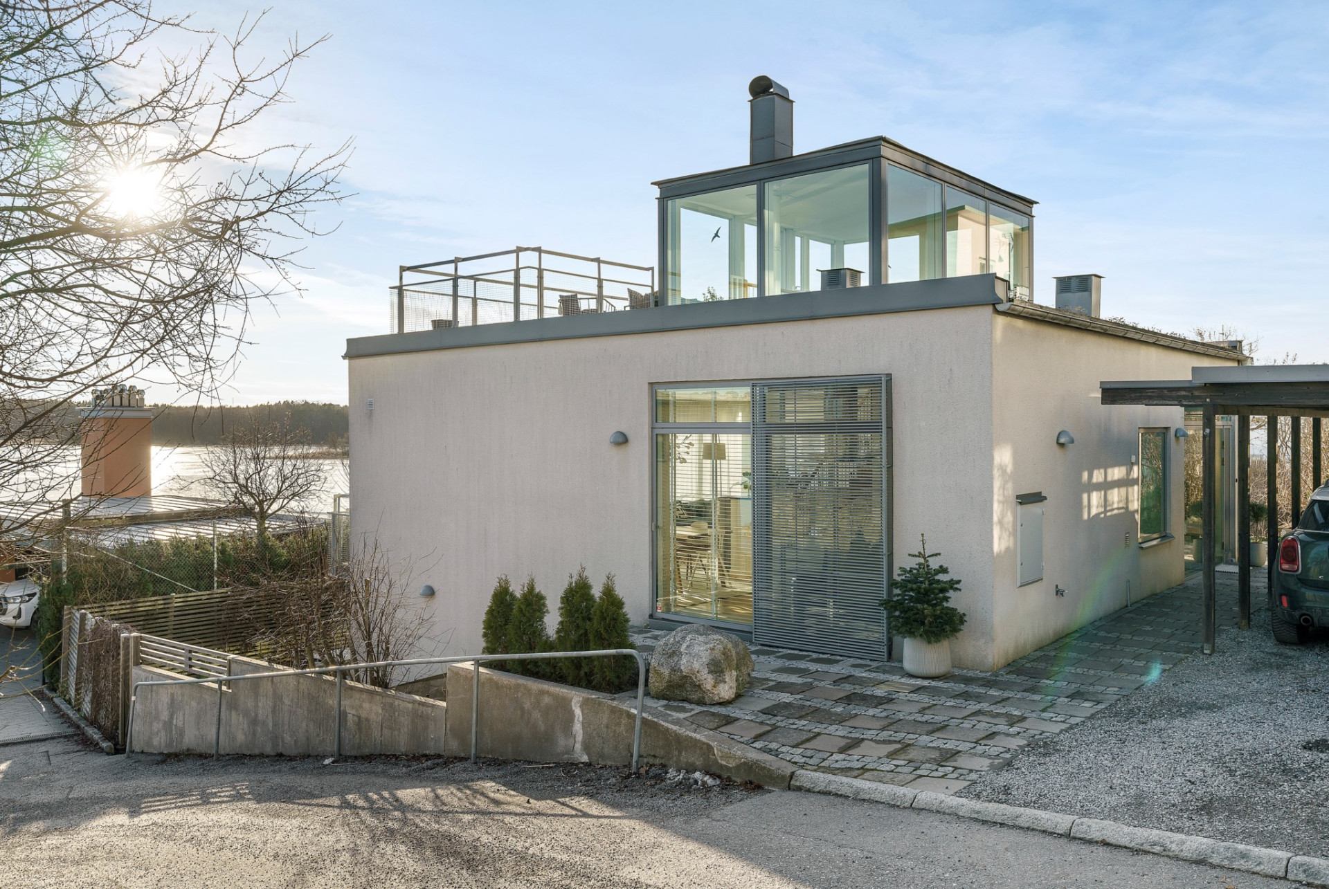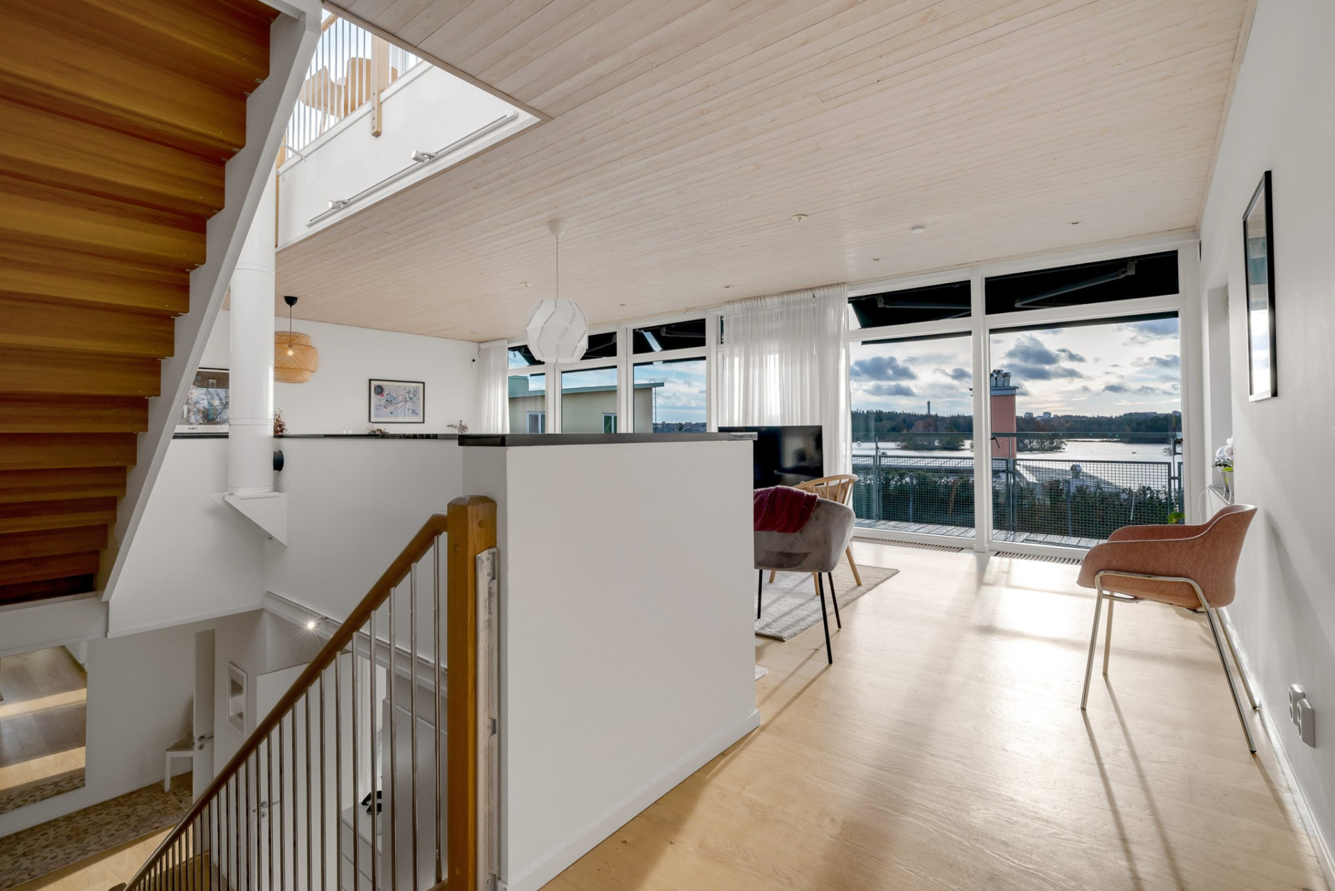 Ektrappan leder upp till lanterninen med glaspartier från golv till tak i alla väderstreck. Här finns det plats för växter, en liten arbetsplats och ett par stolar där man kan avnjuta sjöutsikten de dagar då vädret inte tillåter att man går ut på den väl tilltagna takterrassen på 26 kvm, med den svårslagna utsikten över Mälarens glittrande vatten.