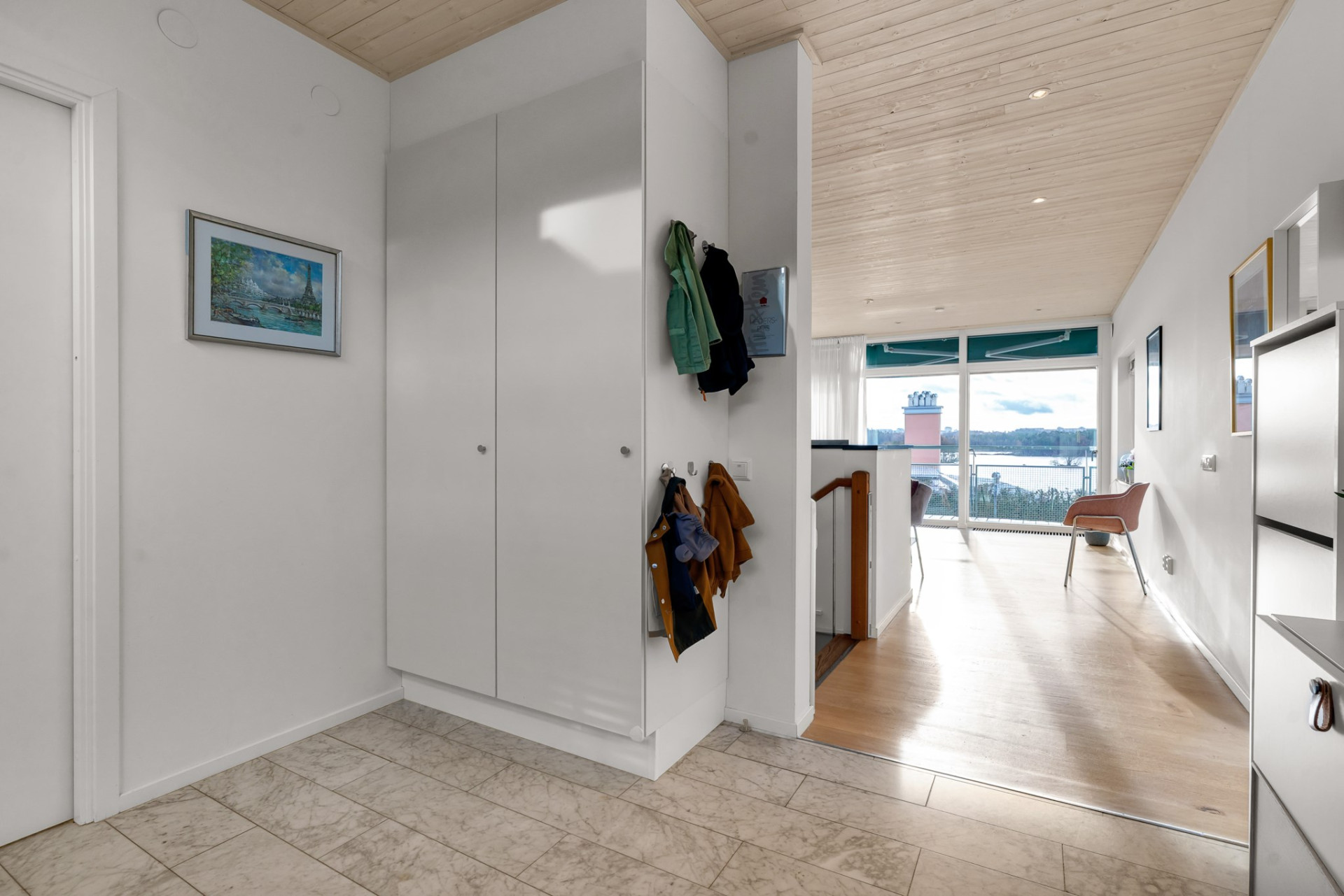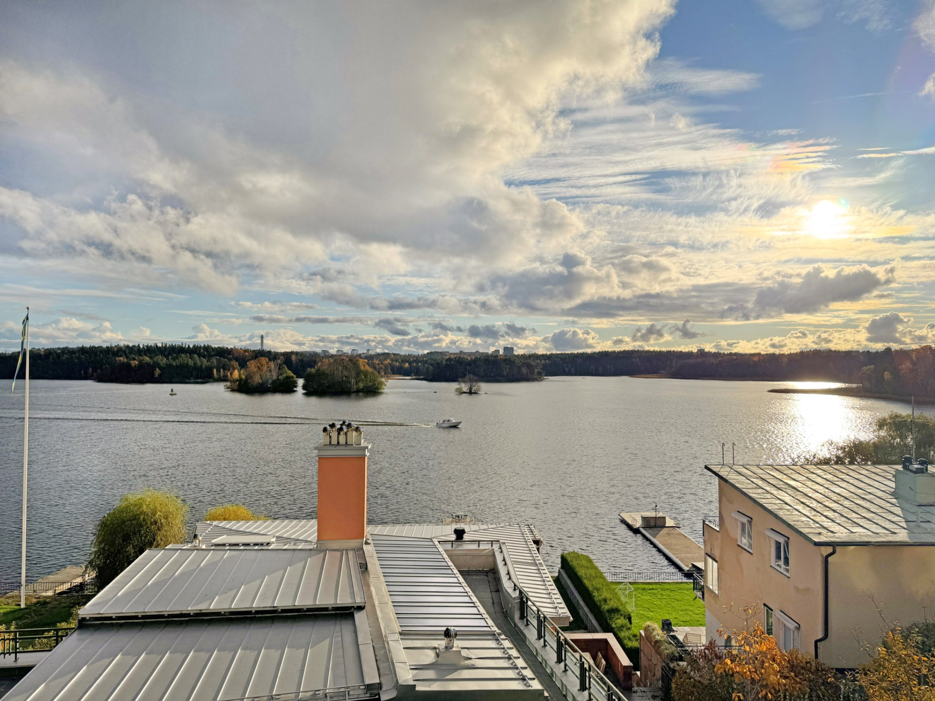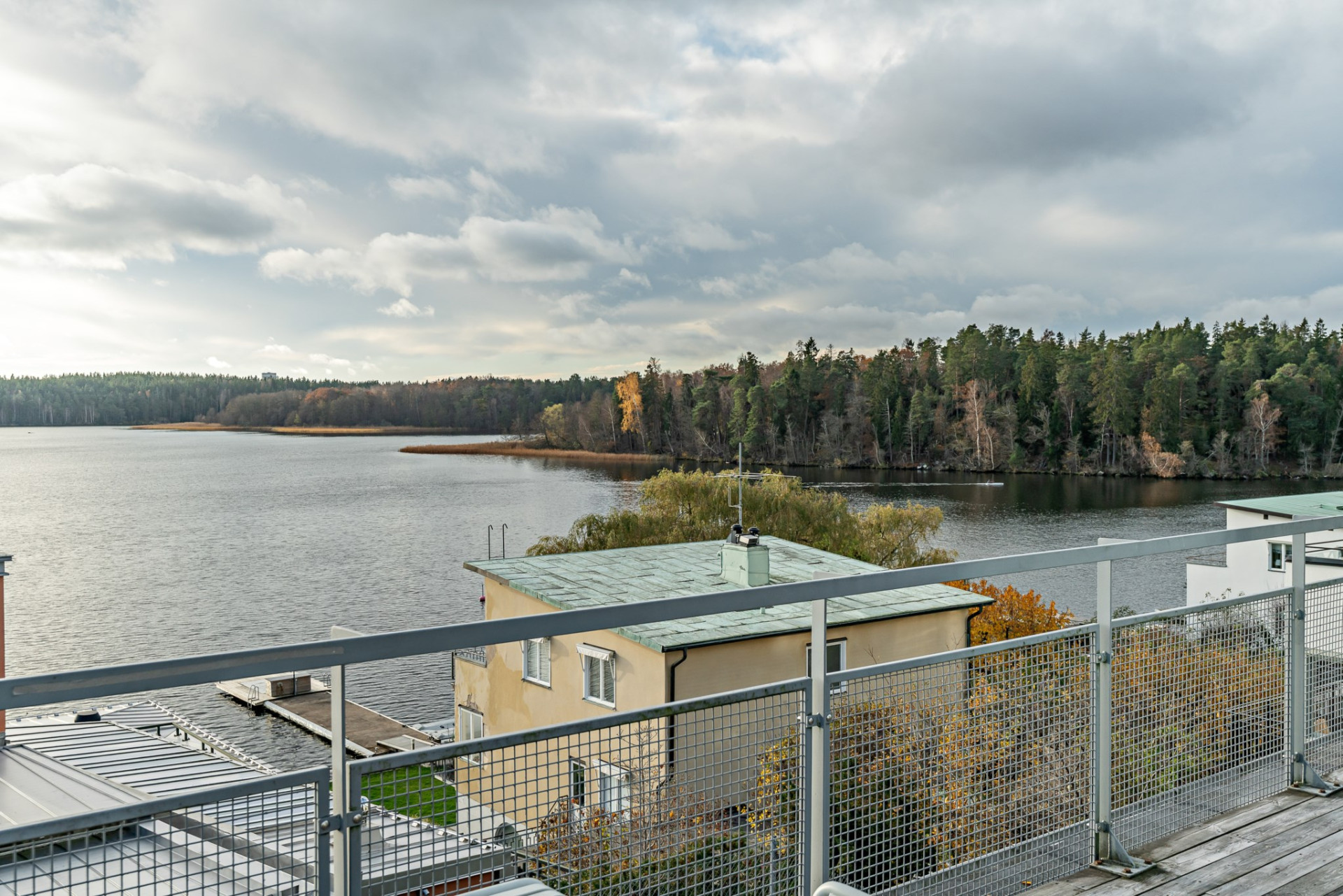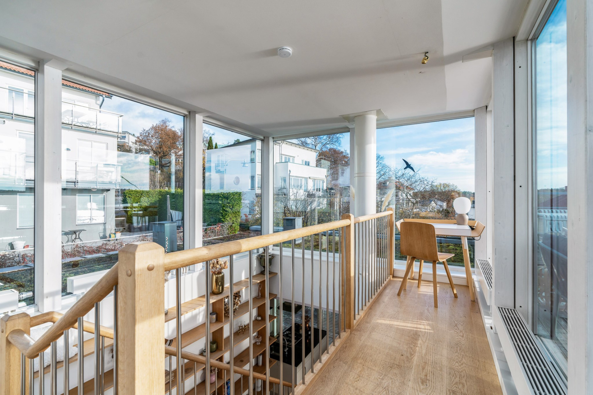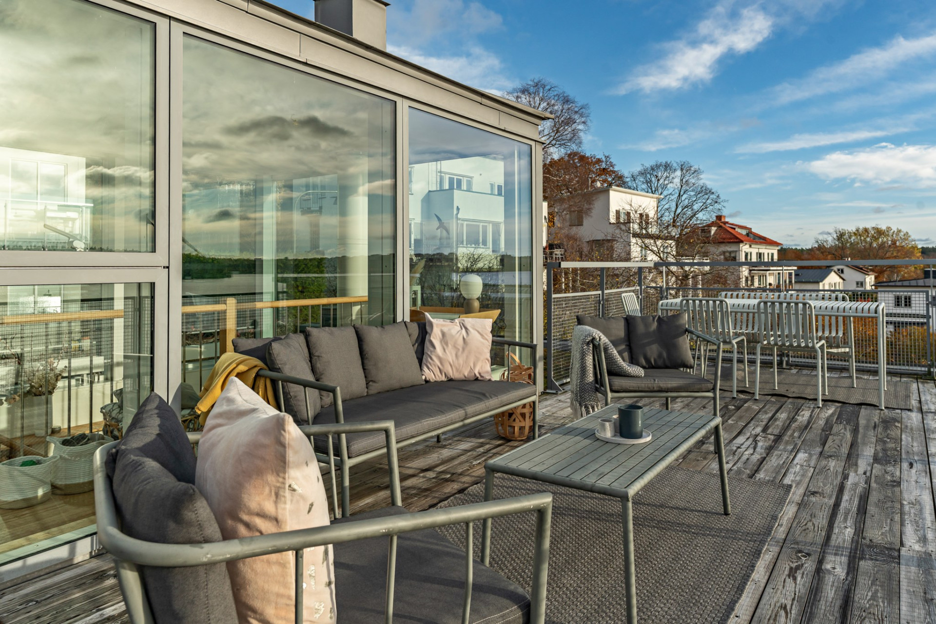Ektrappan leder upp till lanterninen med glaspartier från golv till tak i alla väderstreck. Här finns det plats för växter, en liten arbetsplats och ett par stolar där man kan avnjuta sjöutsikten de dagar då vädret inte tillåter att man går ut på den väl tilltagna takterrassen på 26 kvm, med den svårslagna utsikten över Mälarens glittrande vatten.