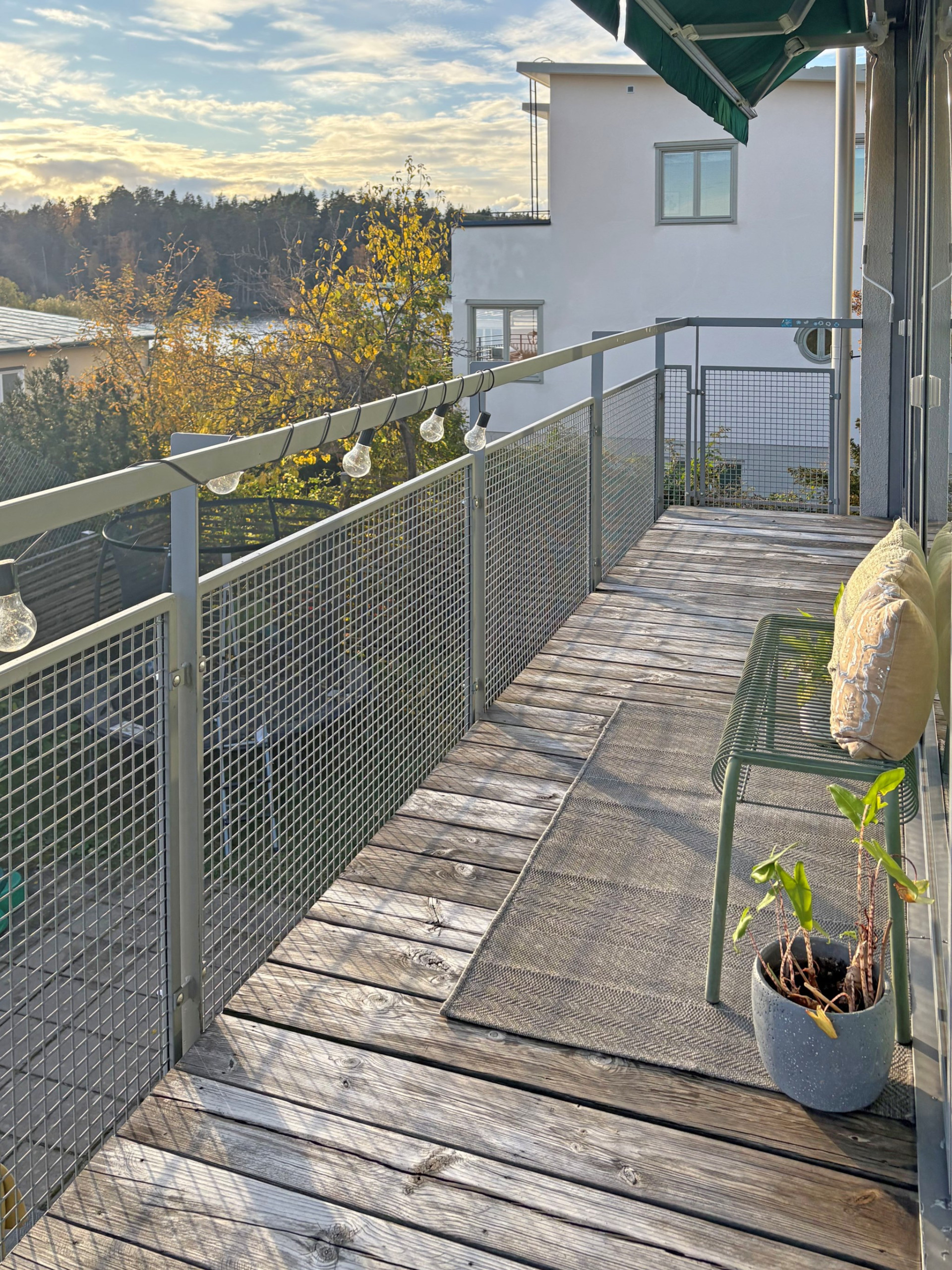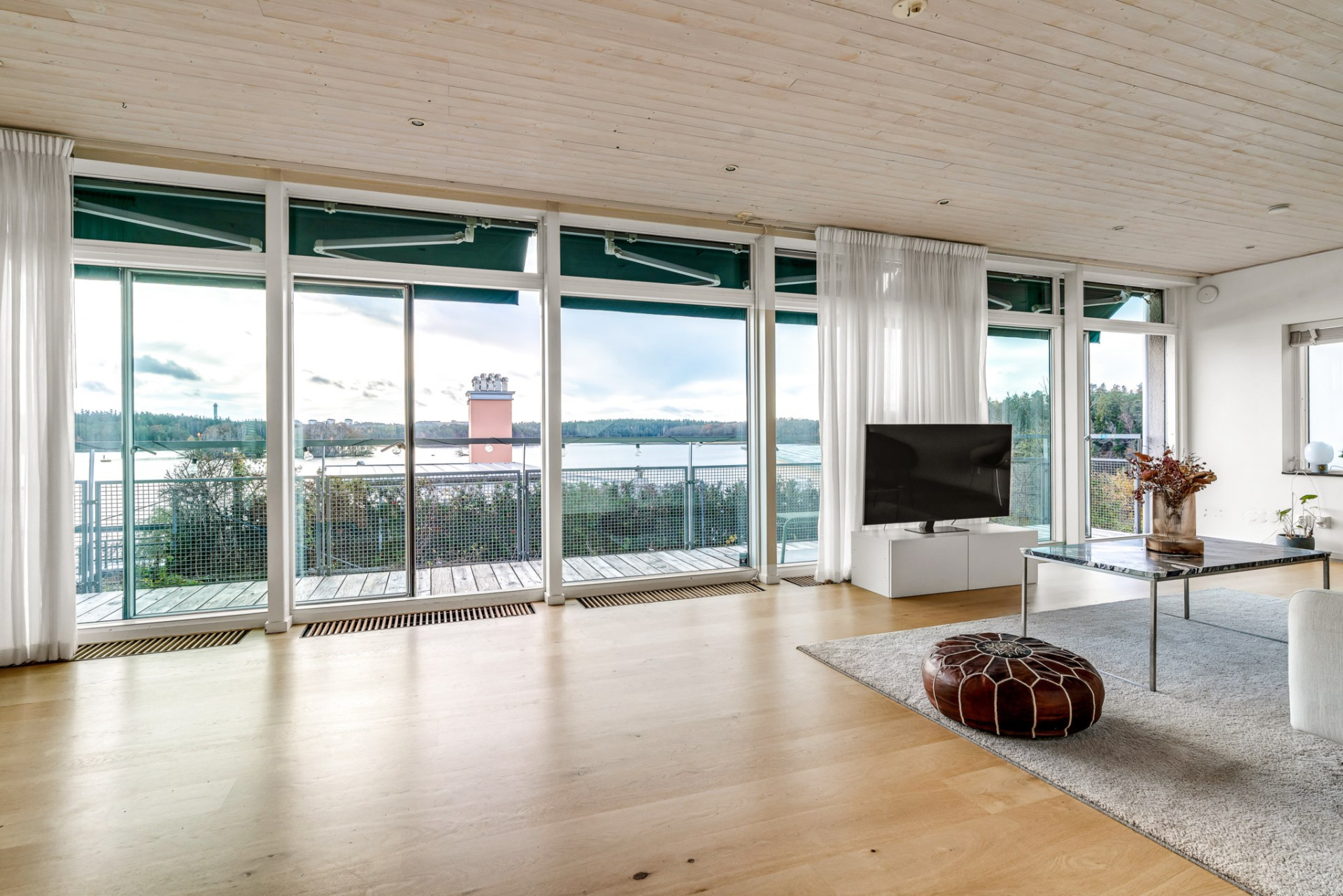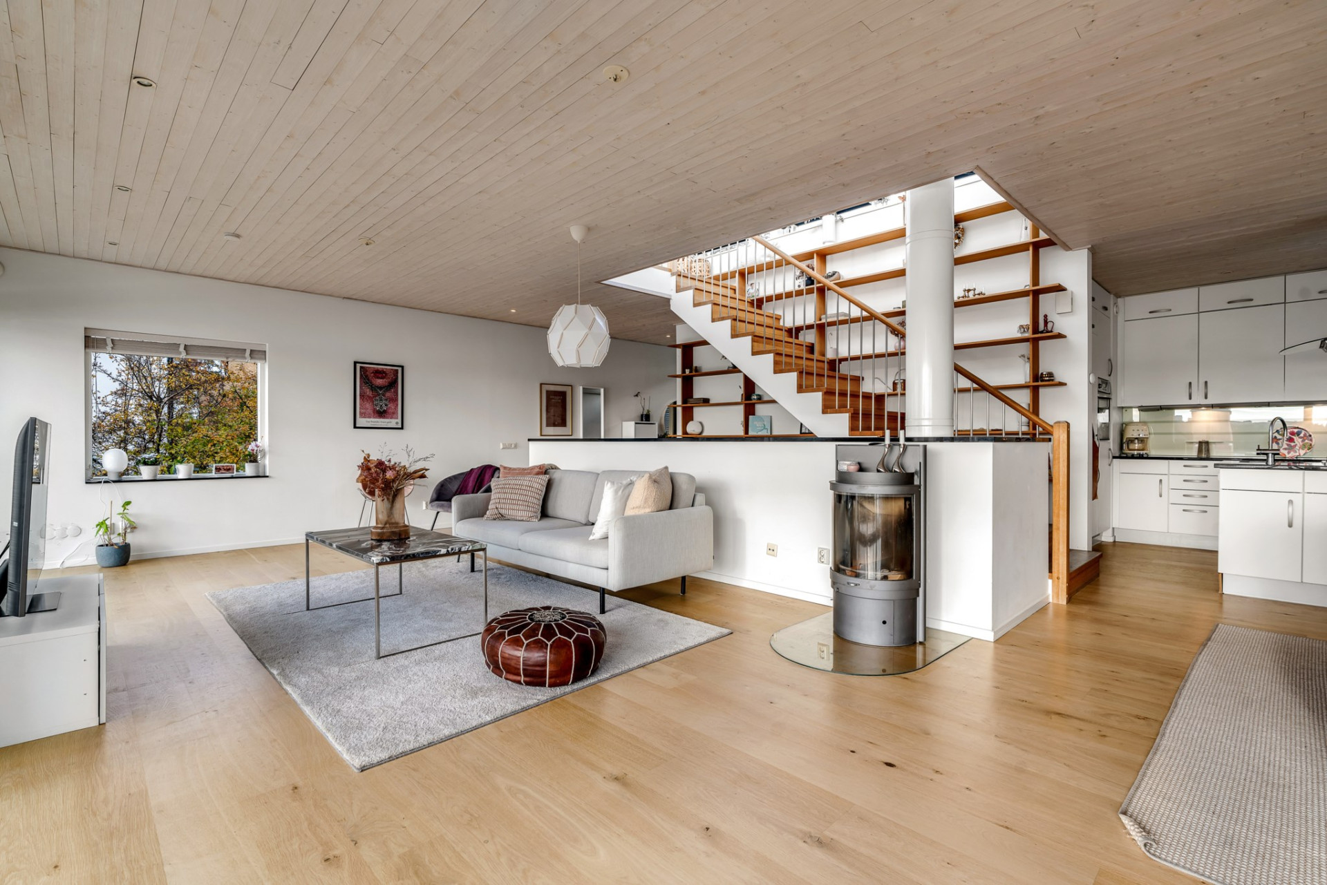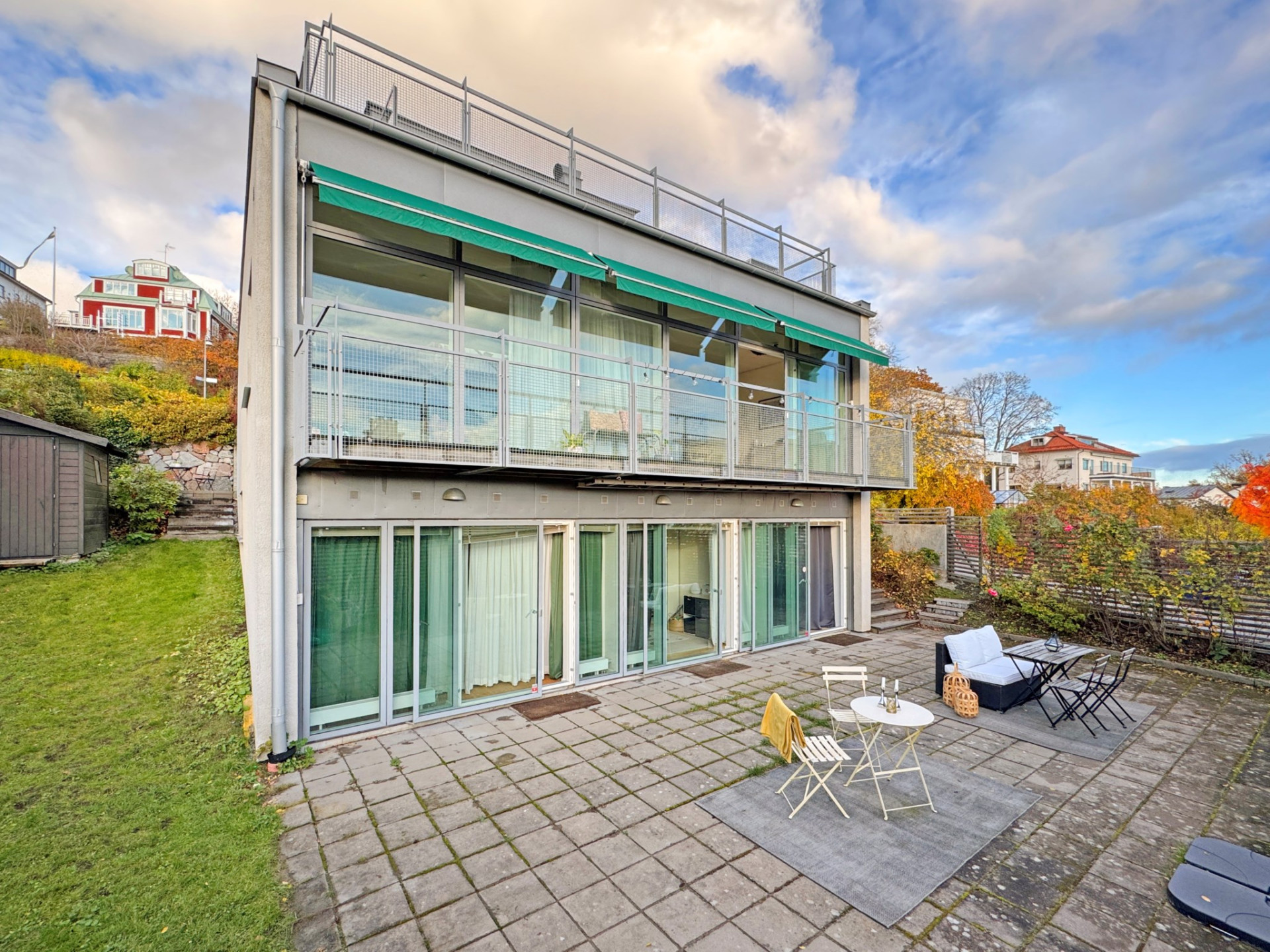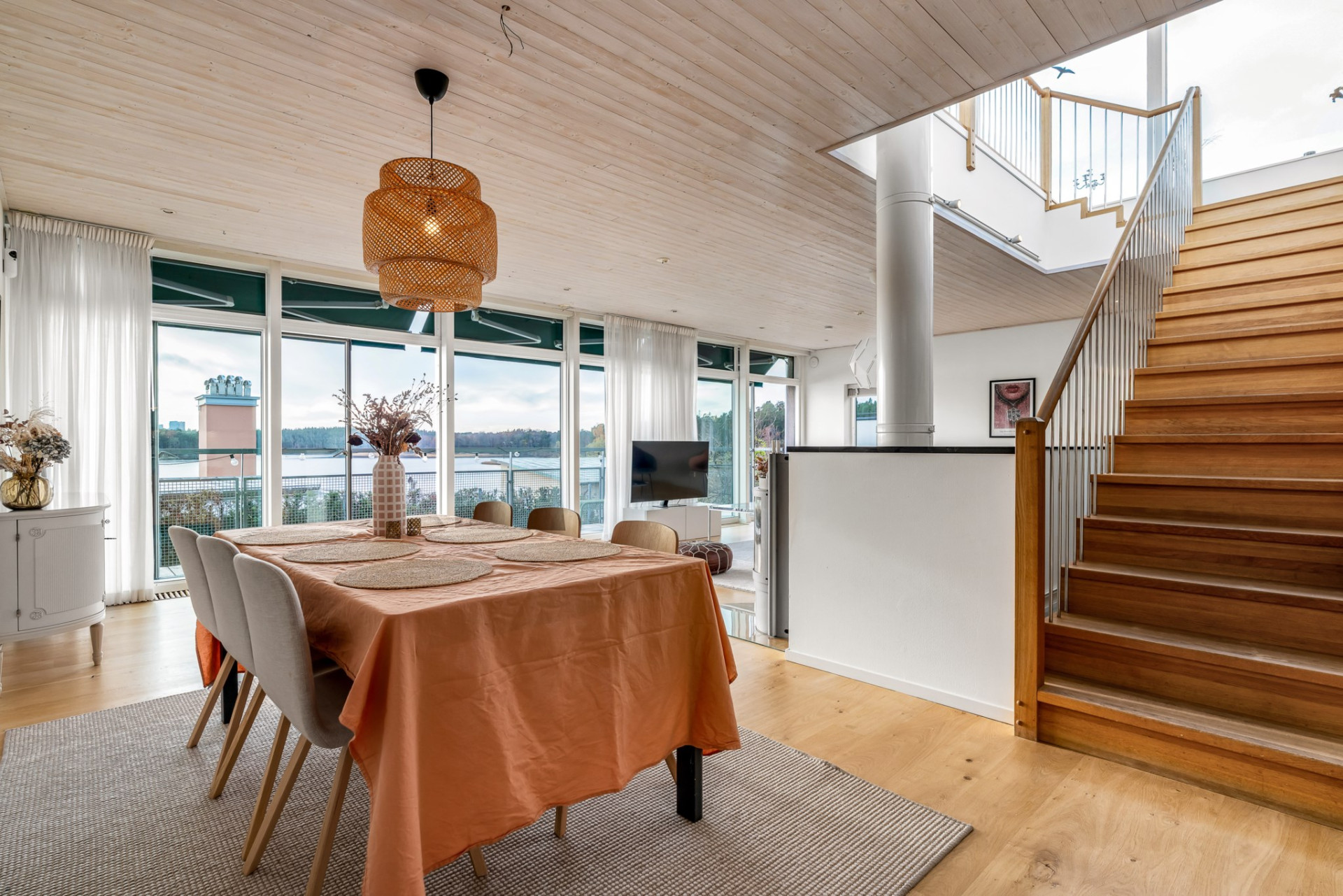 Ektrappan leder upp till lanterninen med glaspartier från golv till tak i alla väderstreck. Här finns det plats för växter, en liten arbetsplats och ett par stolar där man kan avnjuta sjöutsikten de dagar då vädret inte tillåter att man går ut på den väl tilltagna takterrassen på 26 kvm, med den svårslagna utsikten över Mälarens glittrande vatten.