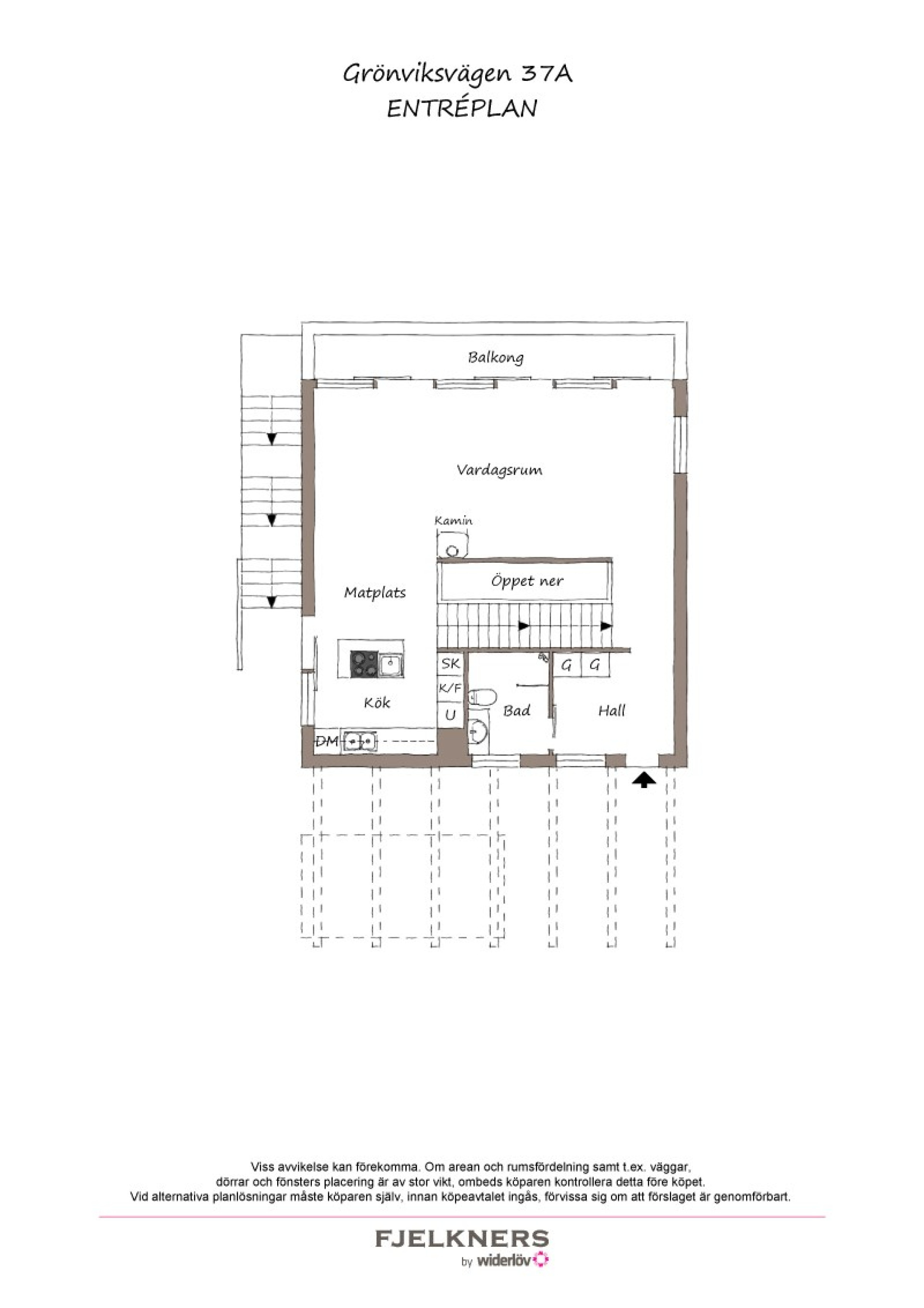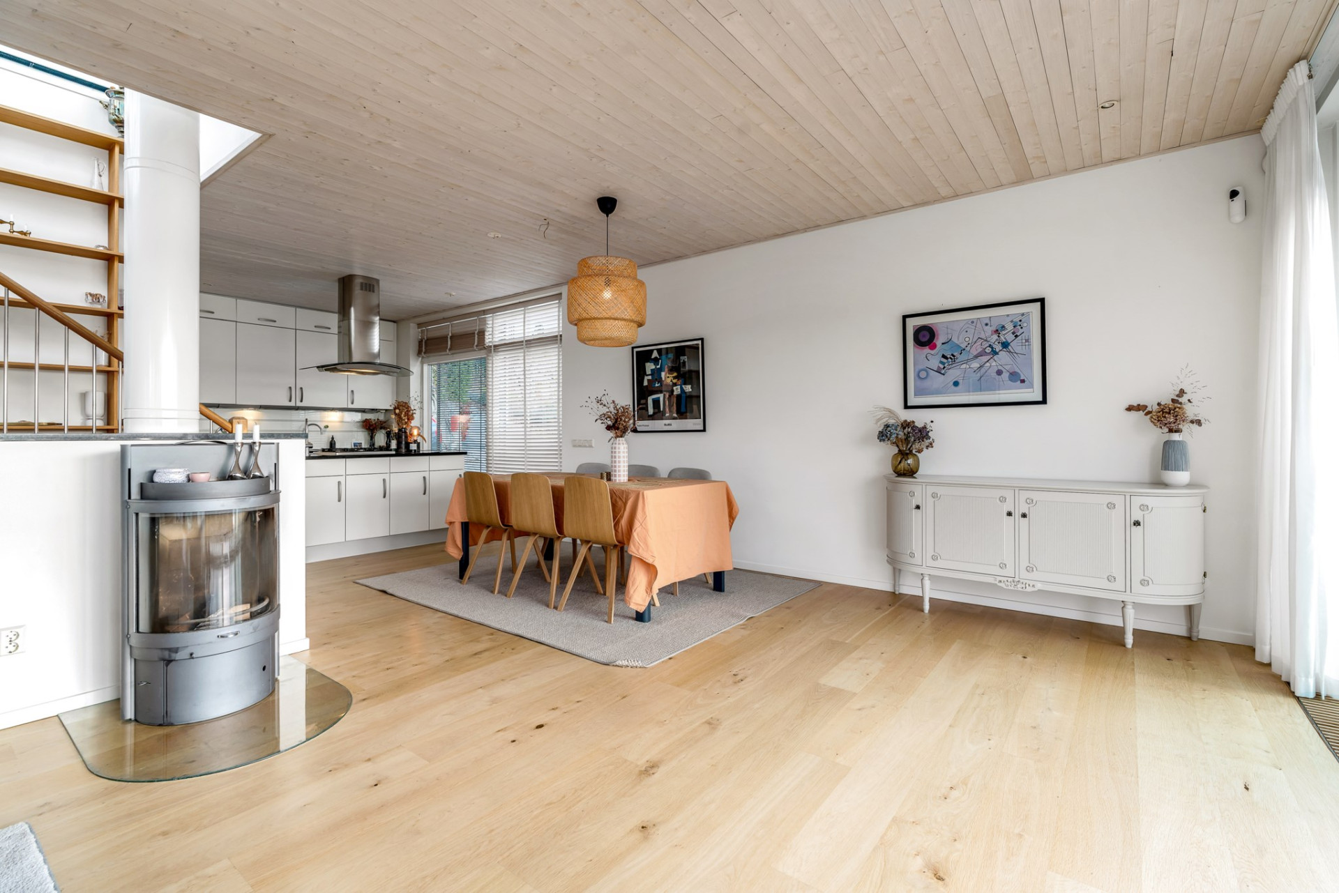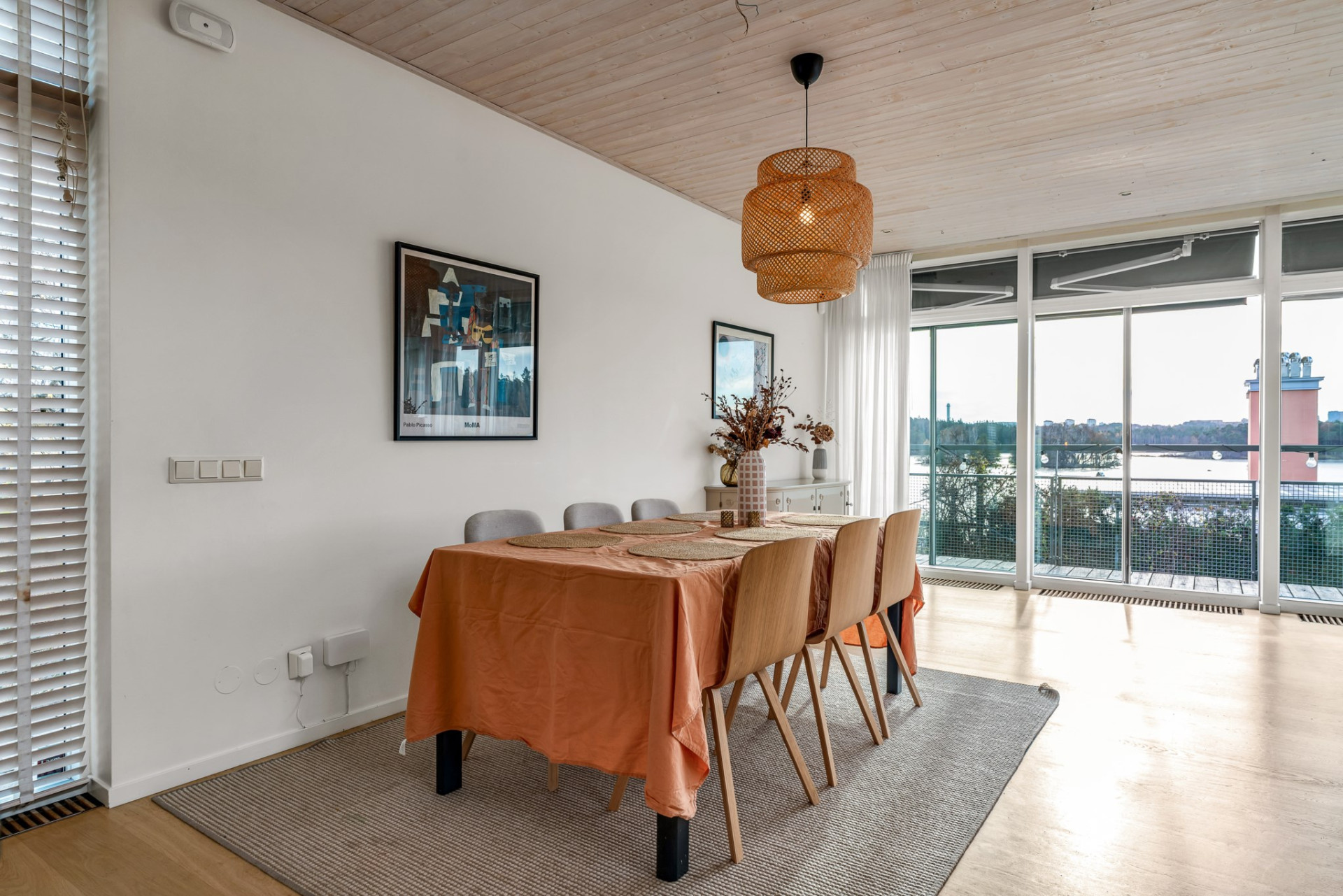 Hallen öppnar upp mot den ljusa och luftiga sällskapsavdelningen, med plats för både soffgrupper och stort matbord vid matplatsen som ligger i öppen planlösning med köksavdelningen. De tre helglasade skjutdörrspartierna leder ut till den längsgående balkongen i söder, med utsikt över Mälaren och med sol från morgon till kväll. Här finns också en värmande kamin, som kan avnjutas från både vardagsrumsdelen och matplatsdelen.