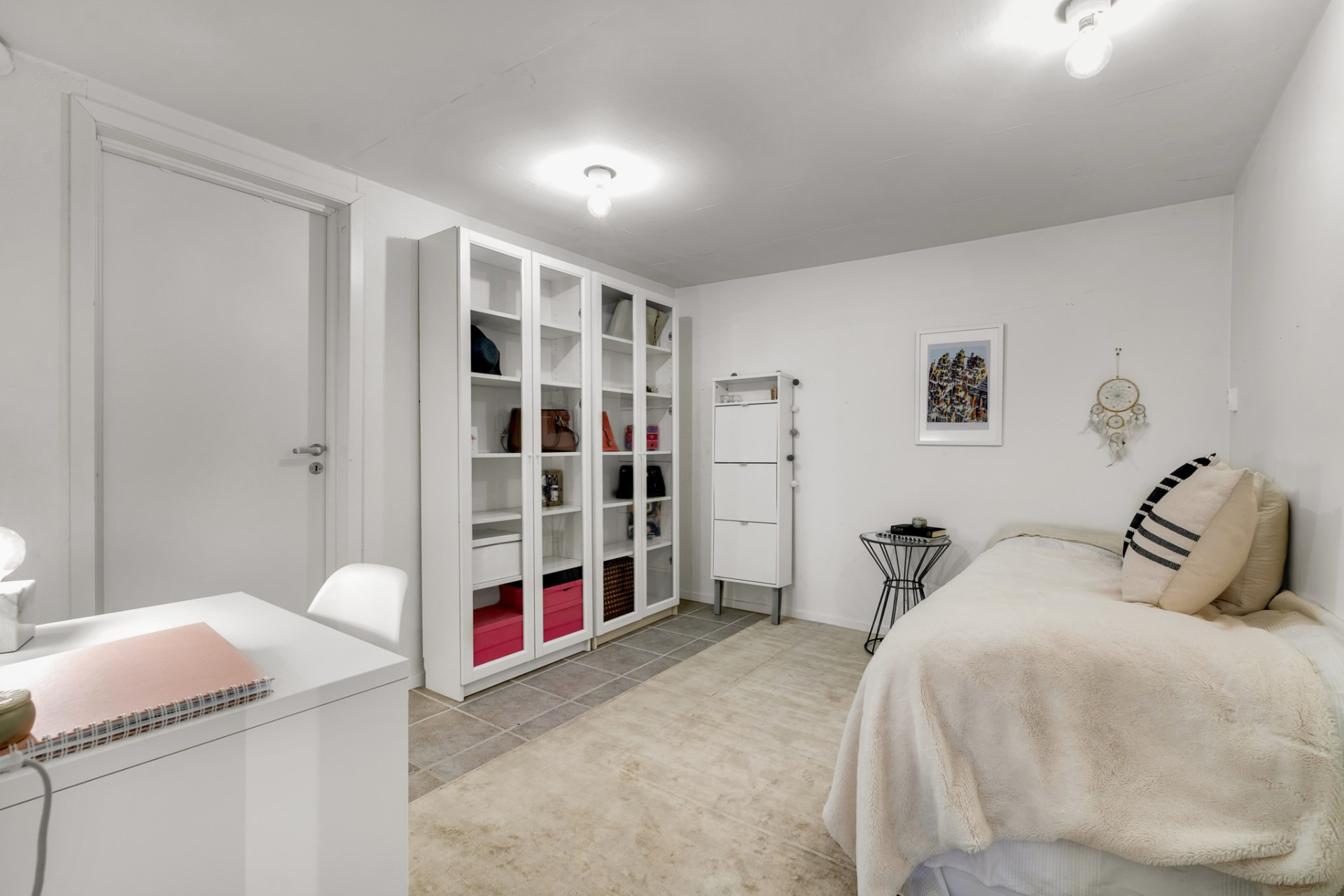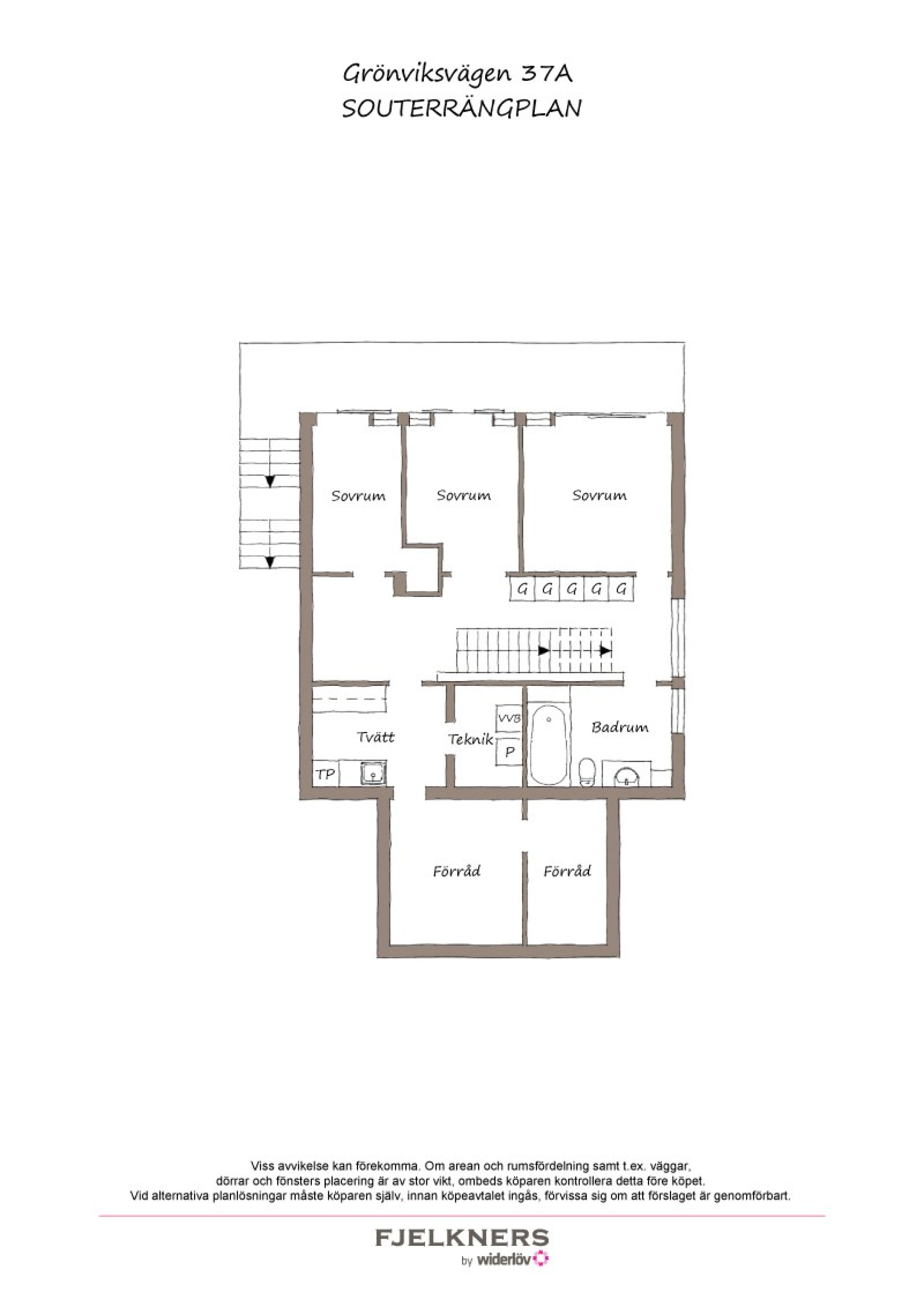 I souterrängplanets hall finns ett flertal takanslutna garderober och utrymme för en arbetsplats eller tv-hörna. Från hallen nås både de tre sovrummen, badrummet och tvättstugan med intilliggande gästrum och förråd. I alla golv ligger det vattenburen golvvärme.