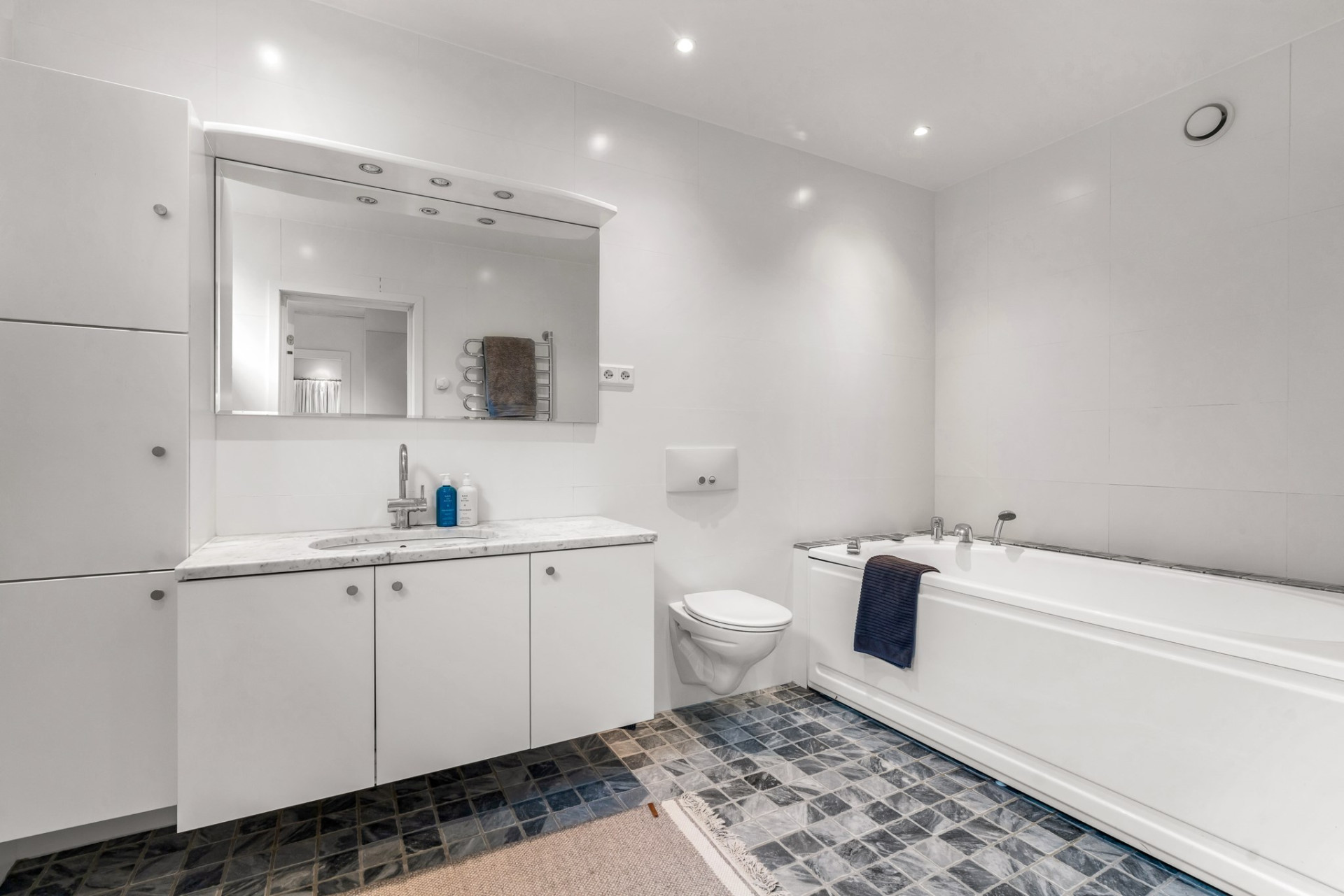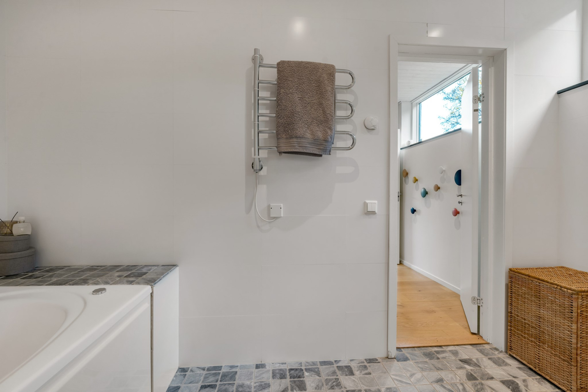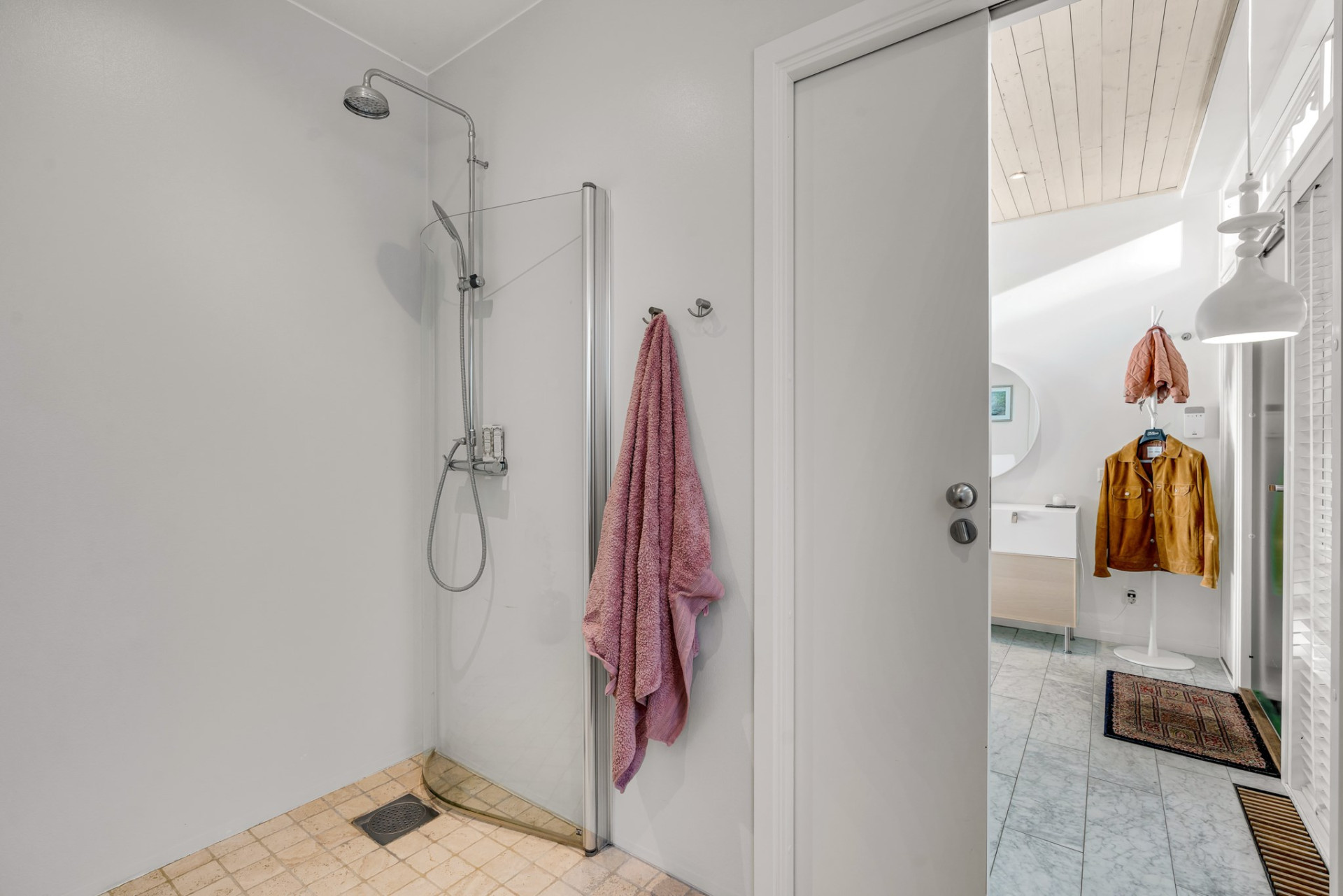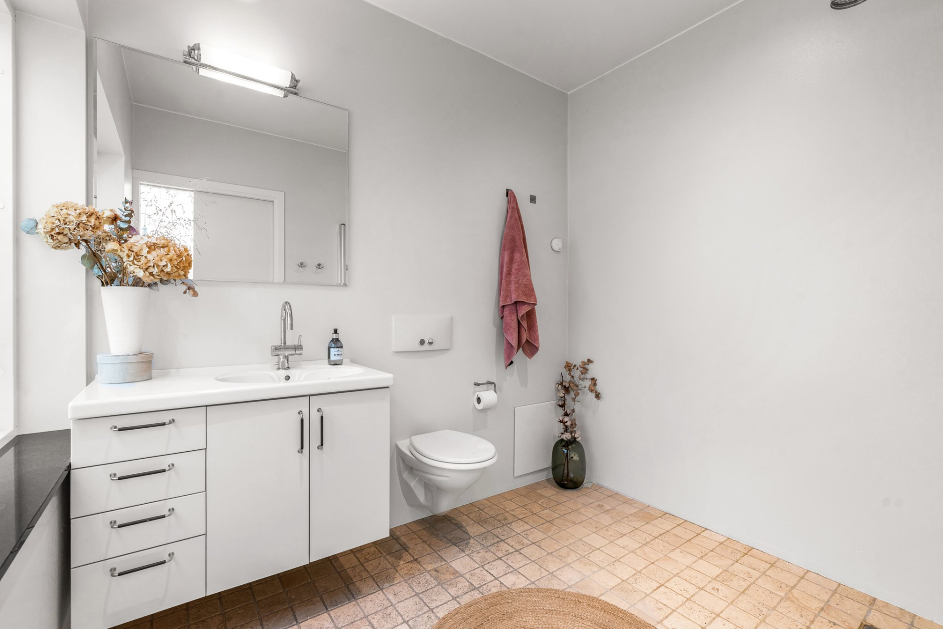 I anslutning till hallen ligger ett av husets två stora badrum. Här finns vägghängd wc, handfat infälld i kommod av ek med matchande spegel med belysning ovan, samt en glasad duschhörna. På golvet ligger ett ljust sjöstensgolv även här med vattenburen golvvärme. Ljusinsläpp från ett frostat fönster och infällda spotlights.