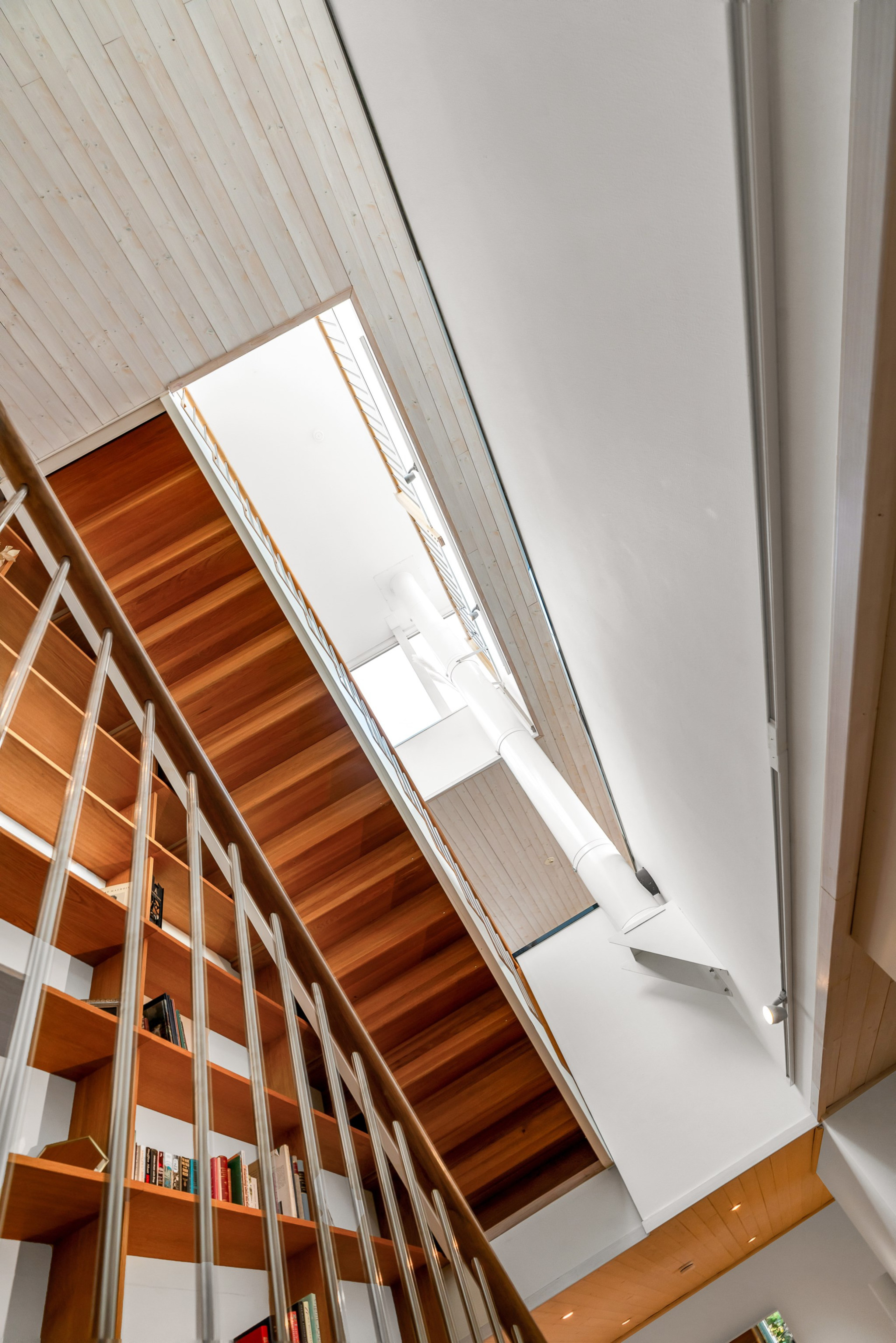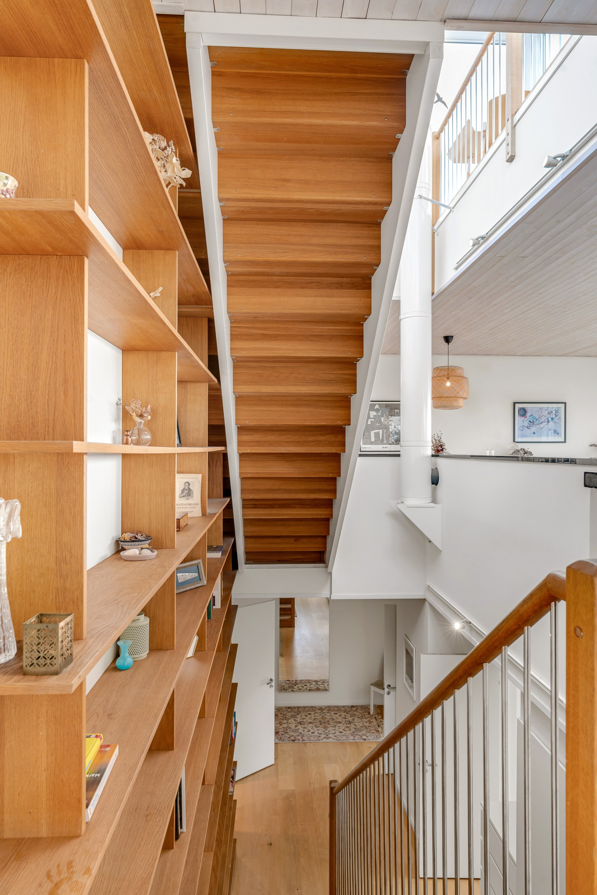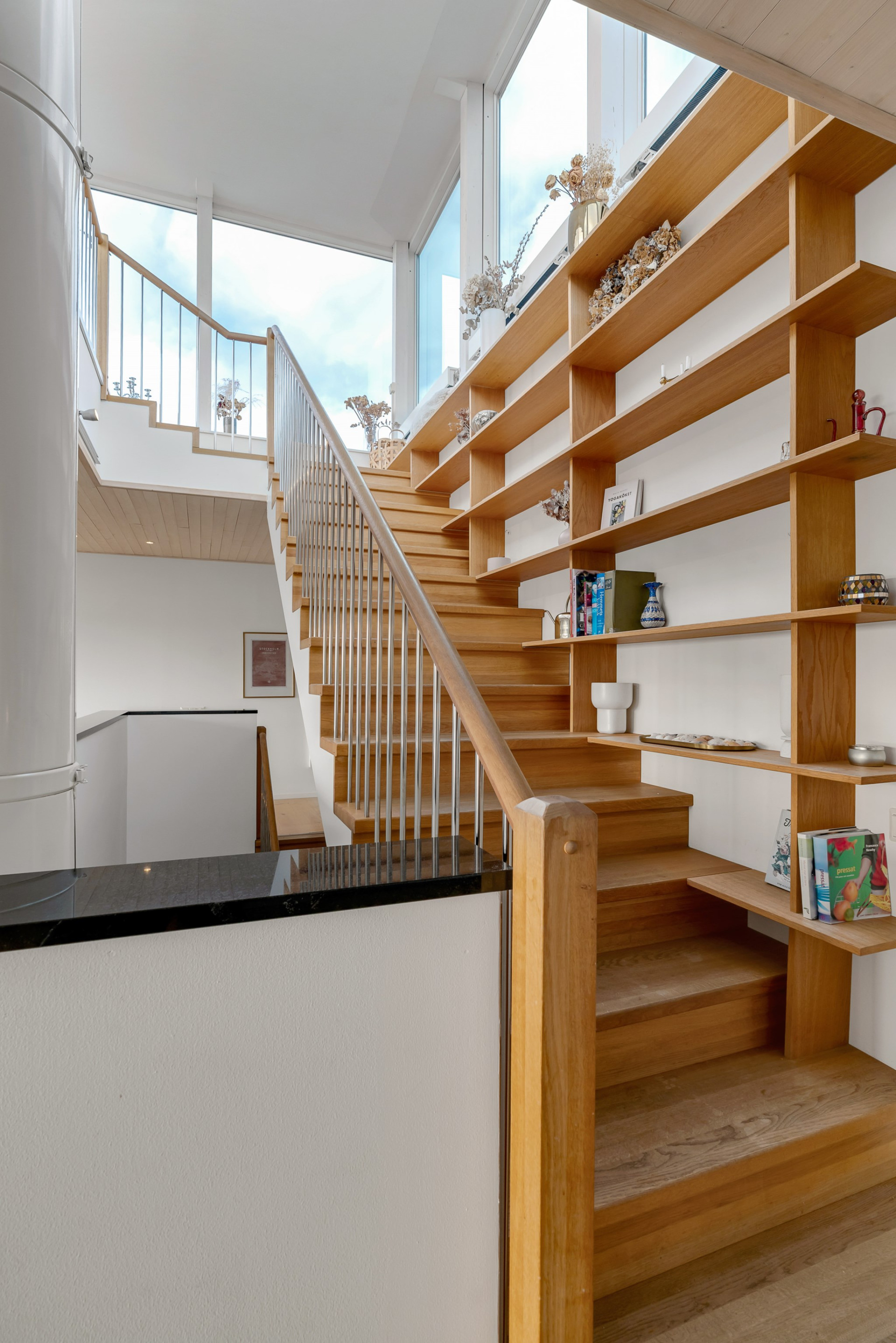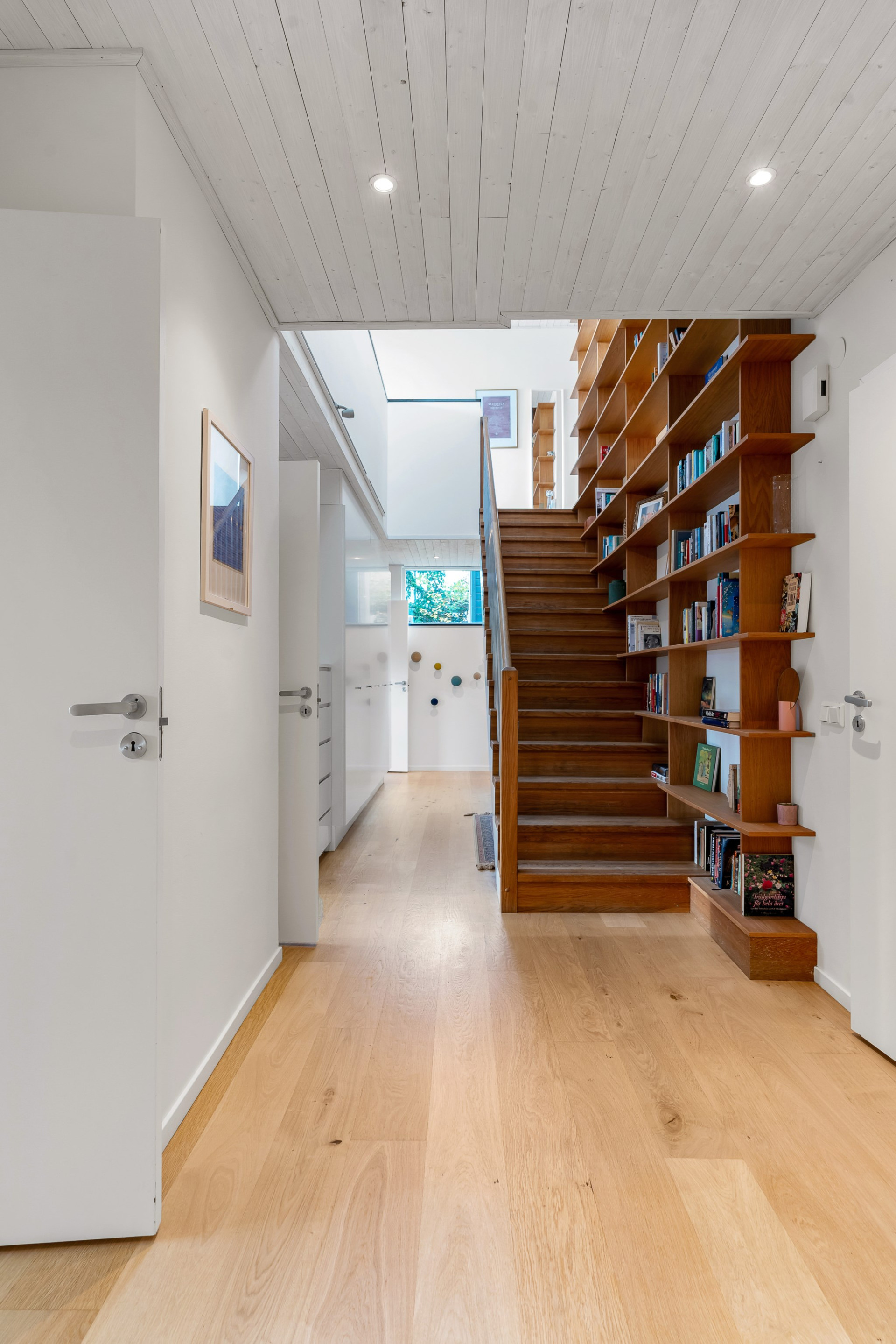 På golven ligger det breda ektiljor med vattenburen golvvärme. Från entréplanet nås både souterrängplan samt lanterninen via den öppna trappan i ek. Invid trappan löper en tre våningar hög bokhylla, också den i ek.
