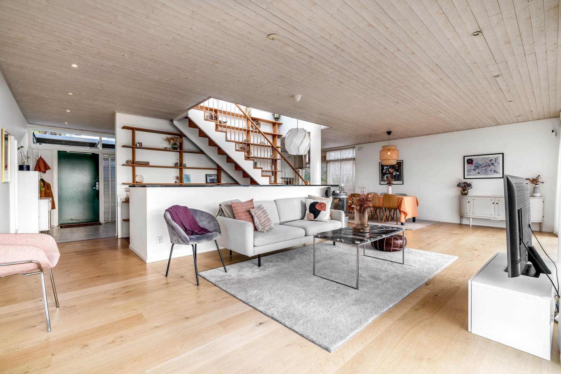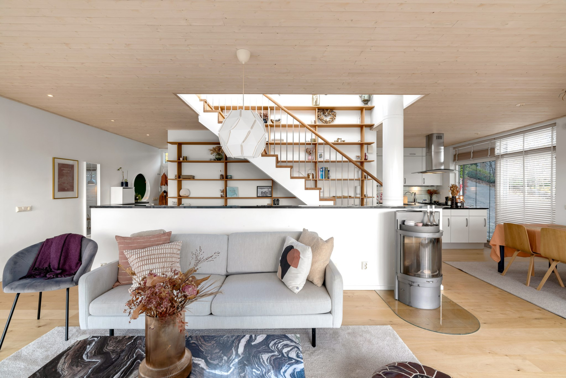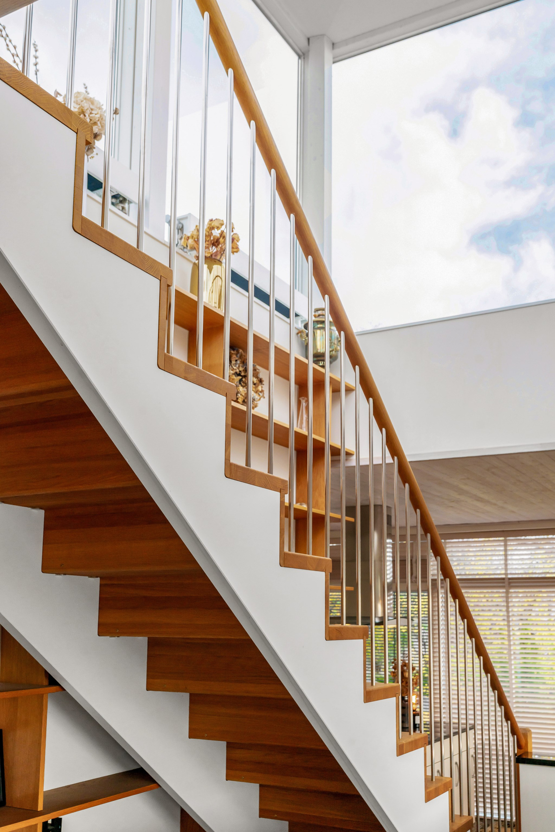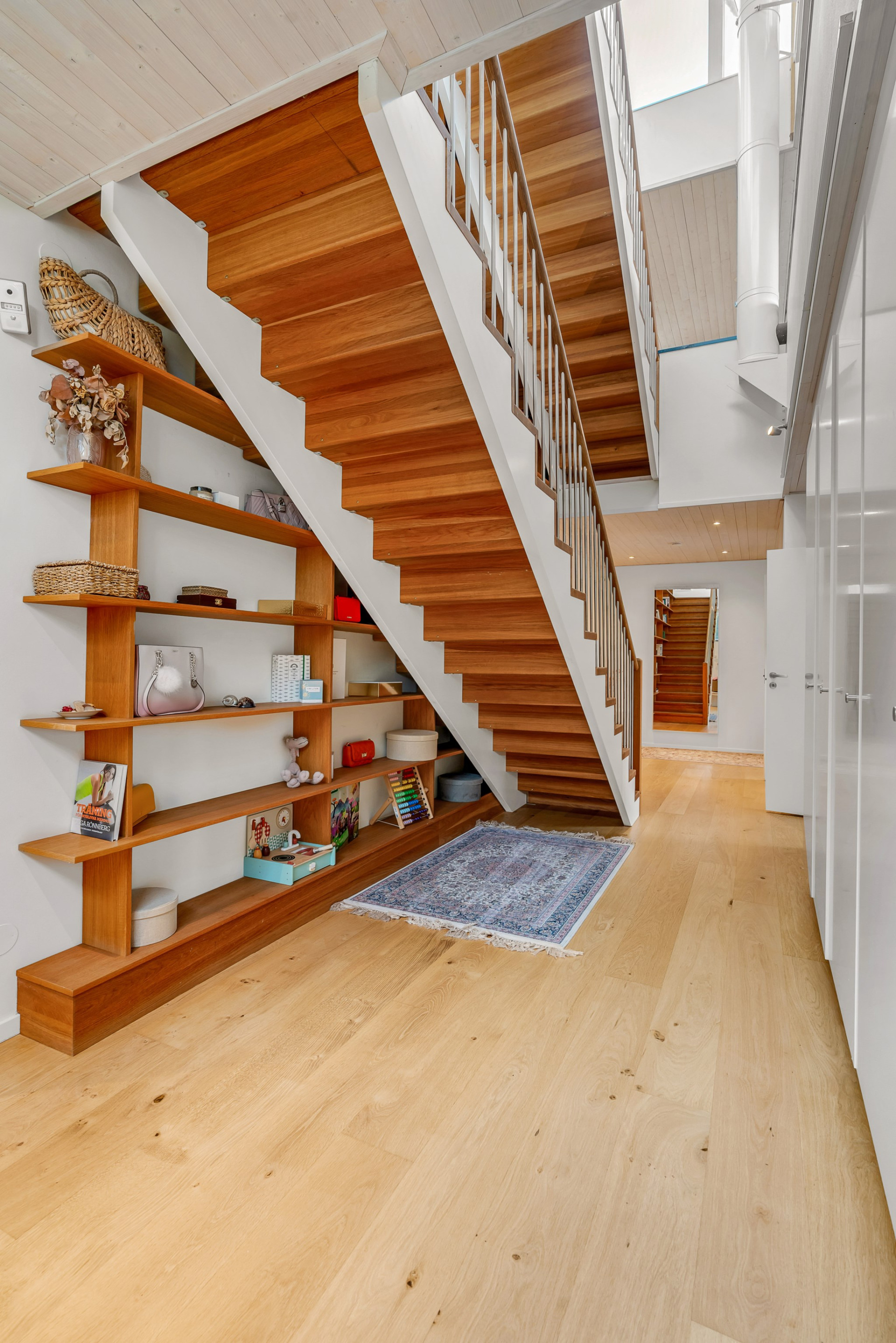 På golven ligger det breda ektiljor med vattenburen golvvärme. Från entréplanet nås både souterrängplan samt lanterninen via den öppna trappan i ek. Invid trappan löper en tre våningar hög bokhylla, också den i ek.