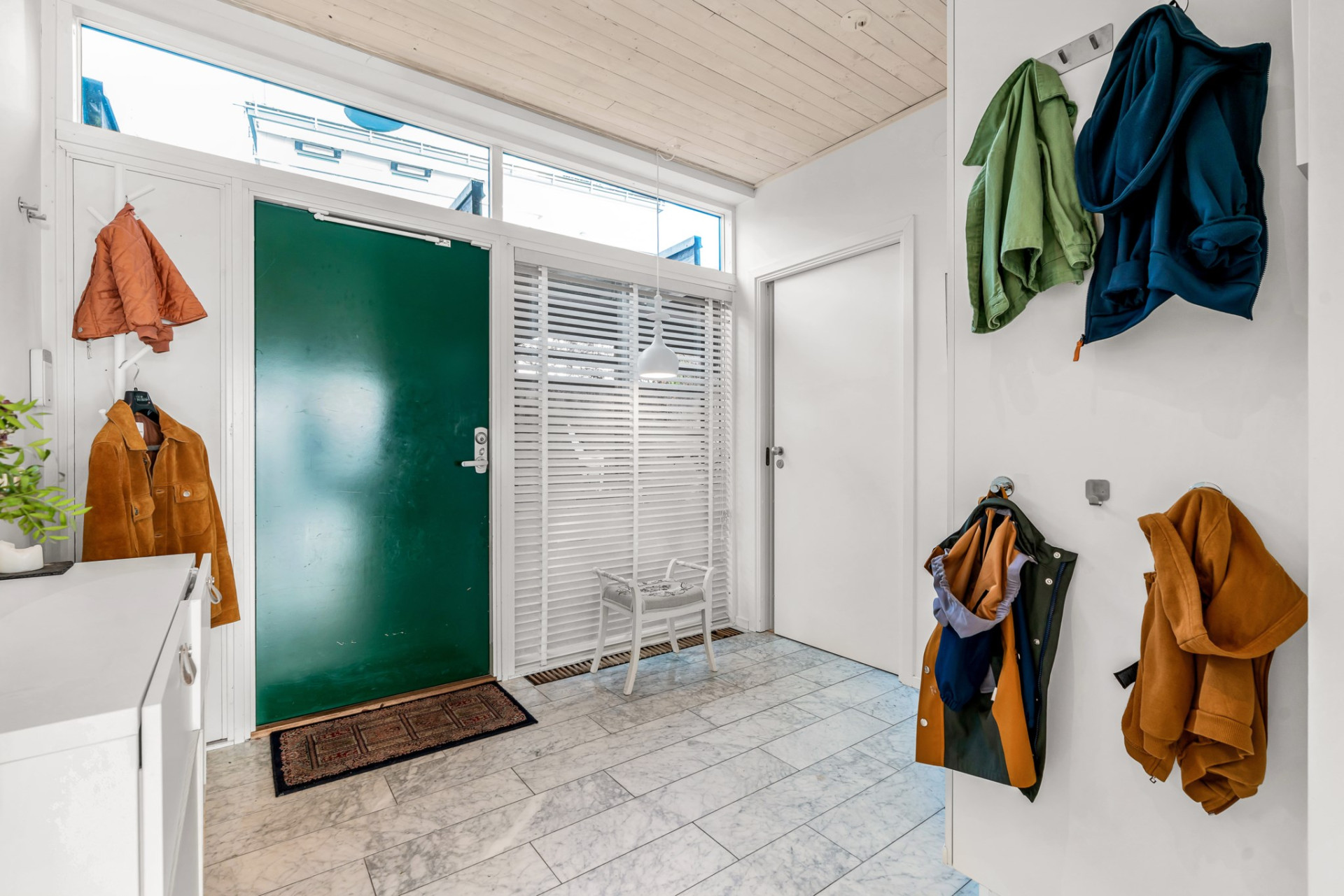 Intill carporten ligger entrén till detta moderna och smakfulla hem. I den rymliga och möblerbara hallen slås man direkt av ljuset som flödar från sällskapsavdelningens stora fönsterpartier och skjutdörrar i glas. Ytterligare ljus från ett stort fönsterparti mot carporten. På golvet i hallen ligger ett ljusgrått marmorgolv med vattenburen golvvärme.