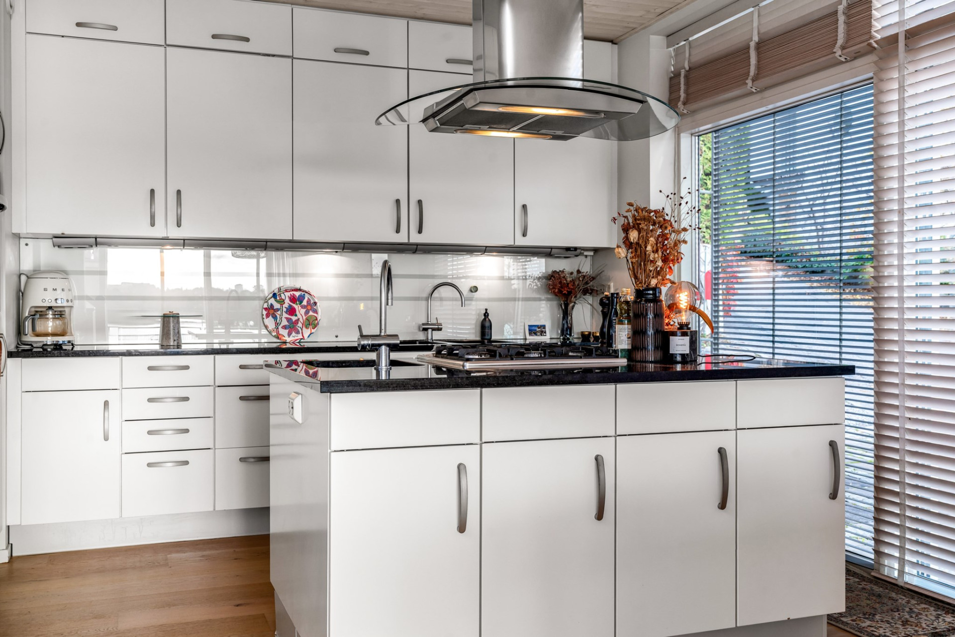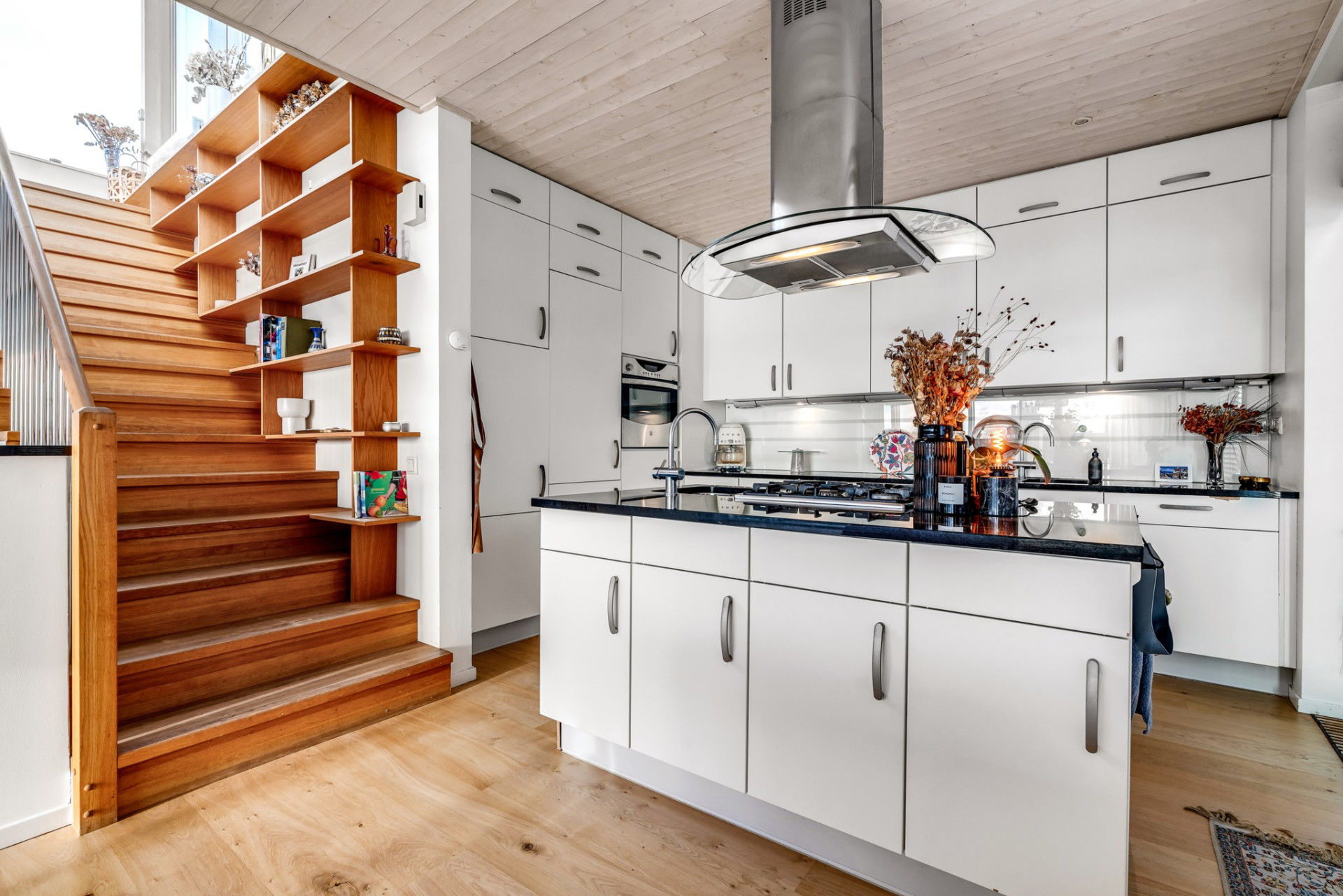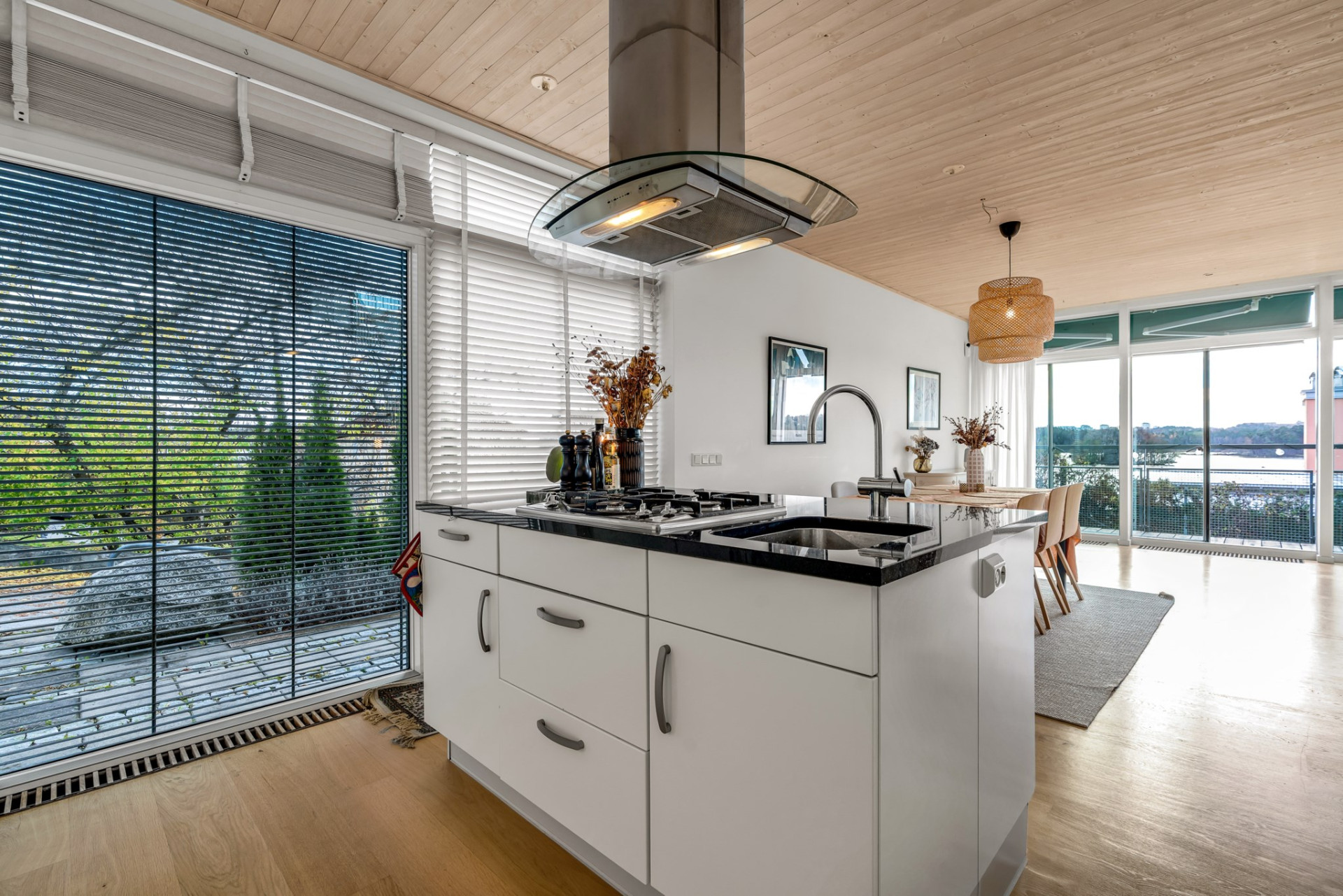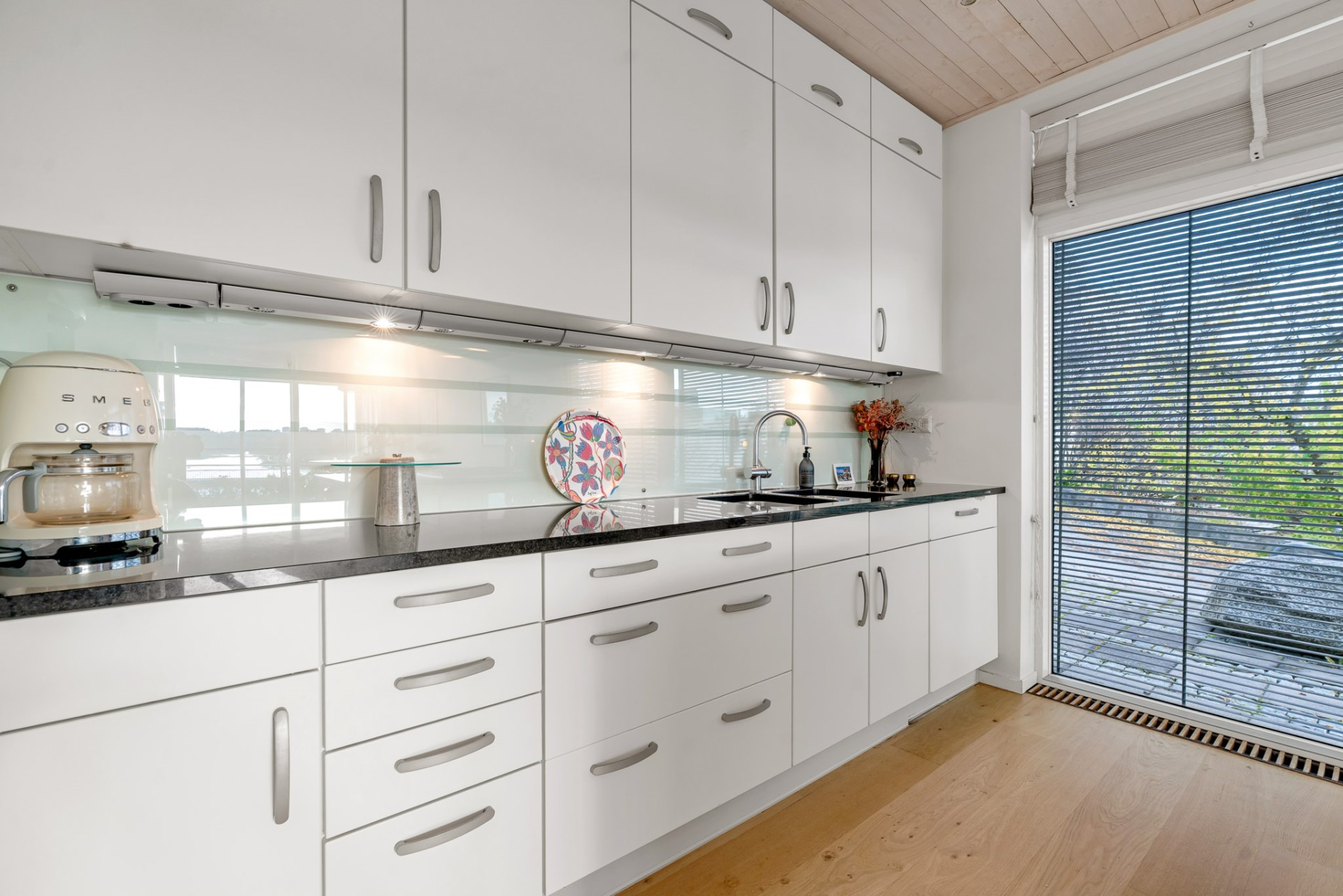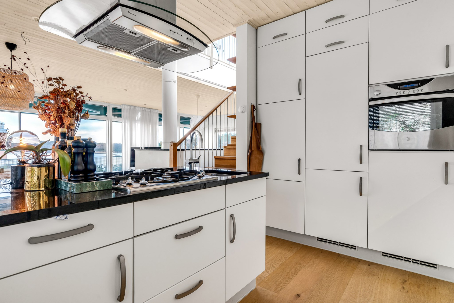 Matplatsen och köksdelen skiljs av med en köksö. I köksön finns , förutom förvaringsmöjligheter, en gashäll med en frihängande rostfri fläktkåpa ovan samt en utslagsho. Lättarbetat kök med gott om förvaringsmöjligheter i underskåp och takanslutna överskåp med släta vita luckor. Gott om arbetsytor på bänkar i svart granit med en underlimmad diskho. Utrustat med inbyggnadsugn i högskåp, integrerad diskmaskin och kyl/frys.