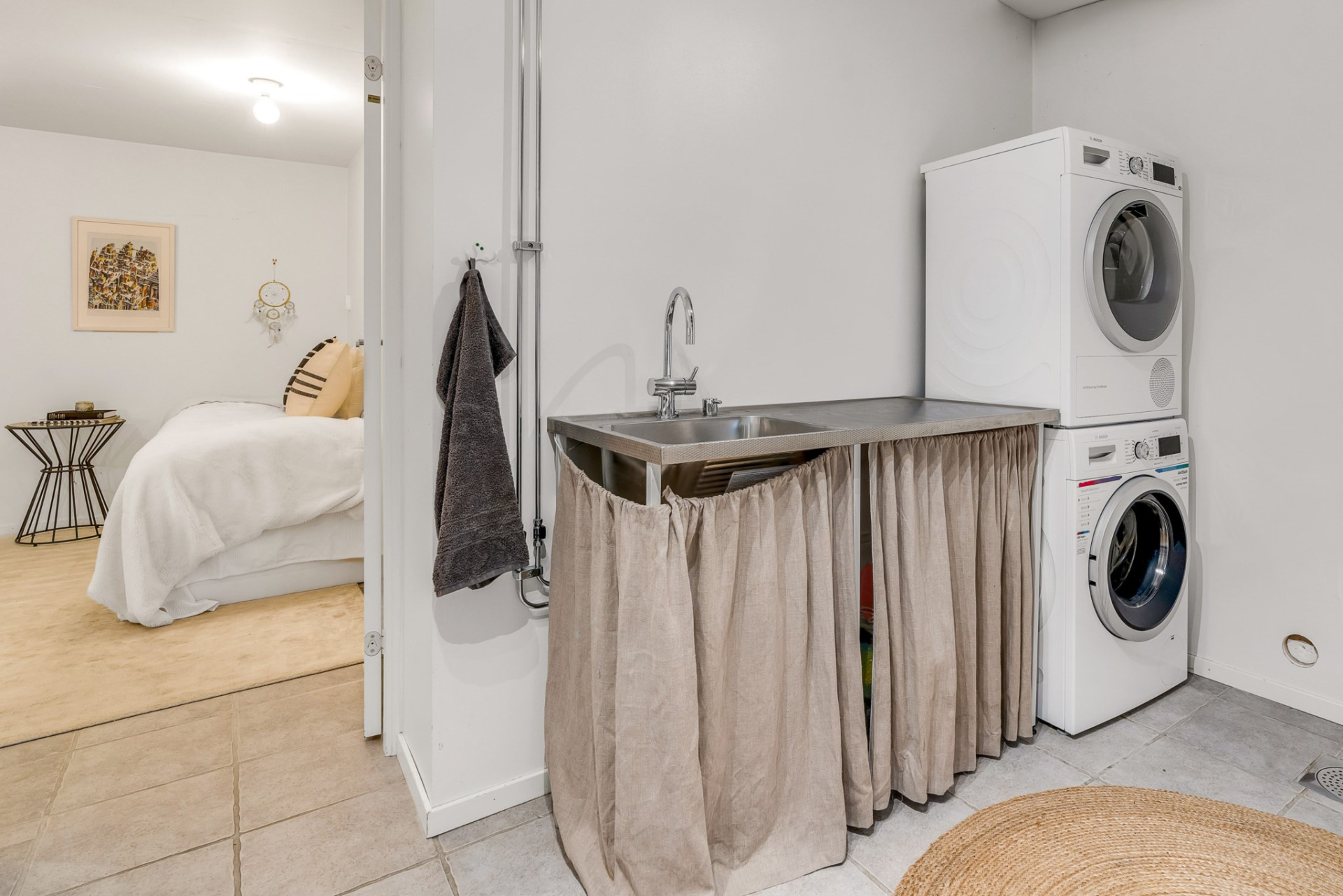Tvättstugan har ett ljust klinkergolv. Här finns tvättpelare och arbetsbänk med rostfri ho samt ytterligare en arbetsbänk med underskåp.