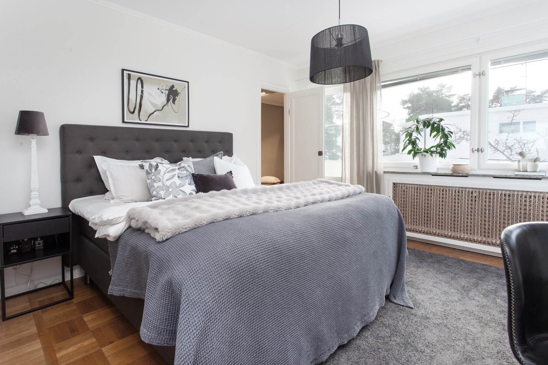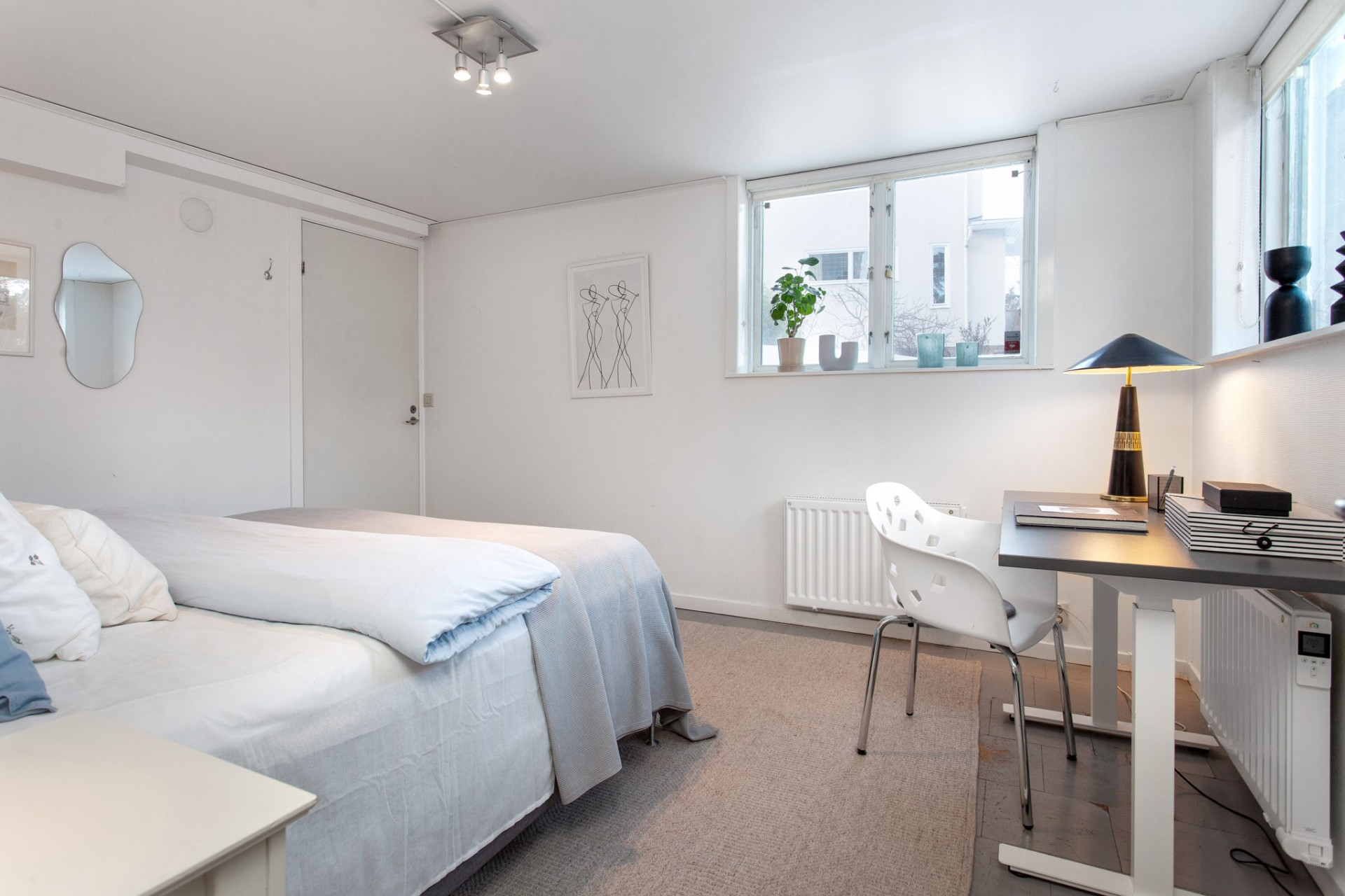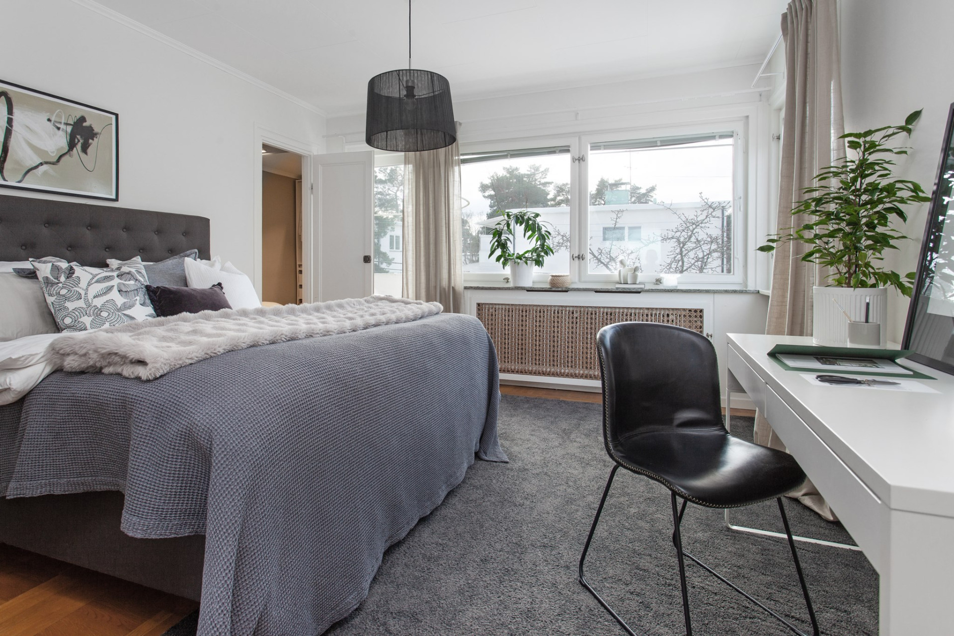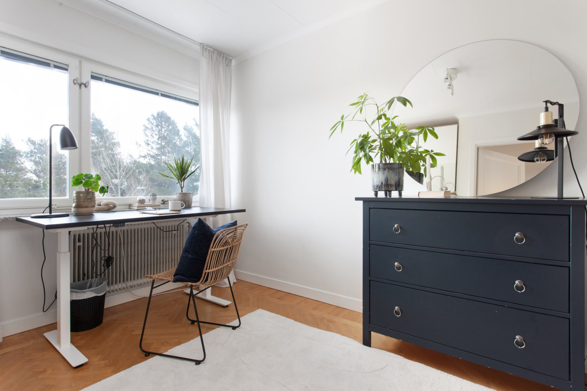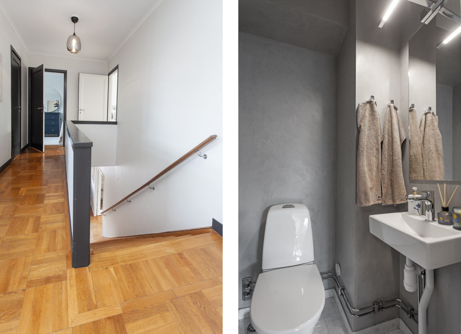 Det tredje sovrummet är placerat mer avskilt. Även här är förvaringen integrerad med garderober i anslutning, vilket ger ett praktiskt och välordnat övre plan. Intill finns en separat wc samt ett badrum med dubbeltvättställskommod, fönster och dusch.