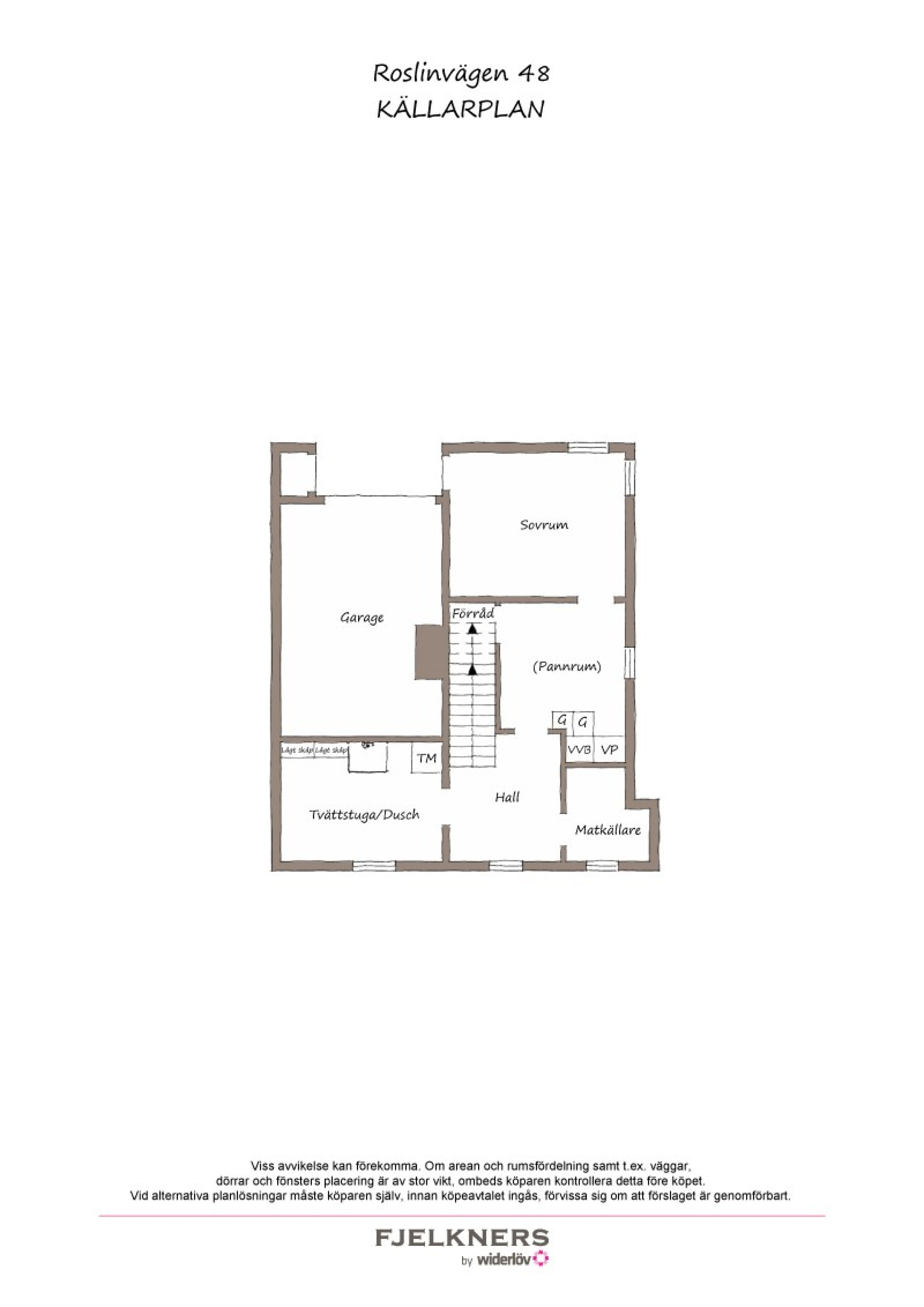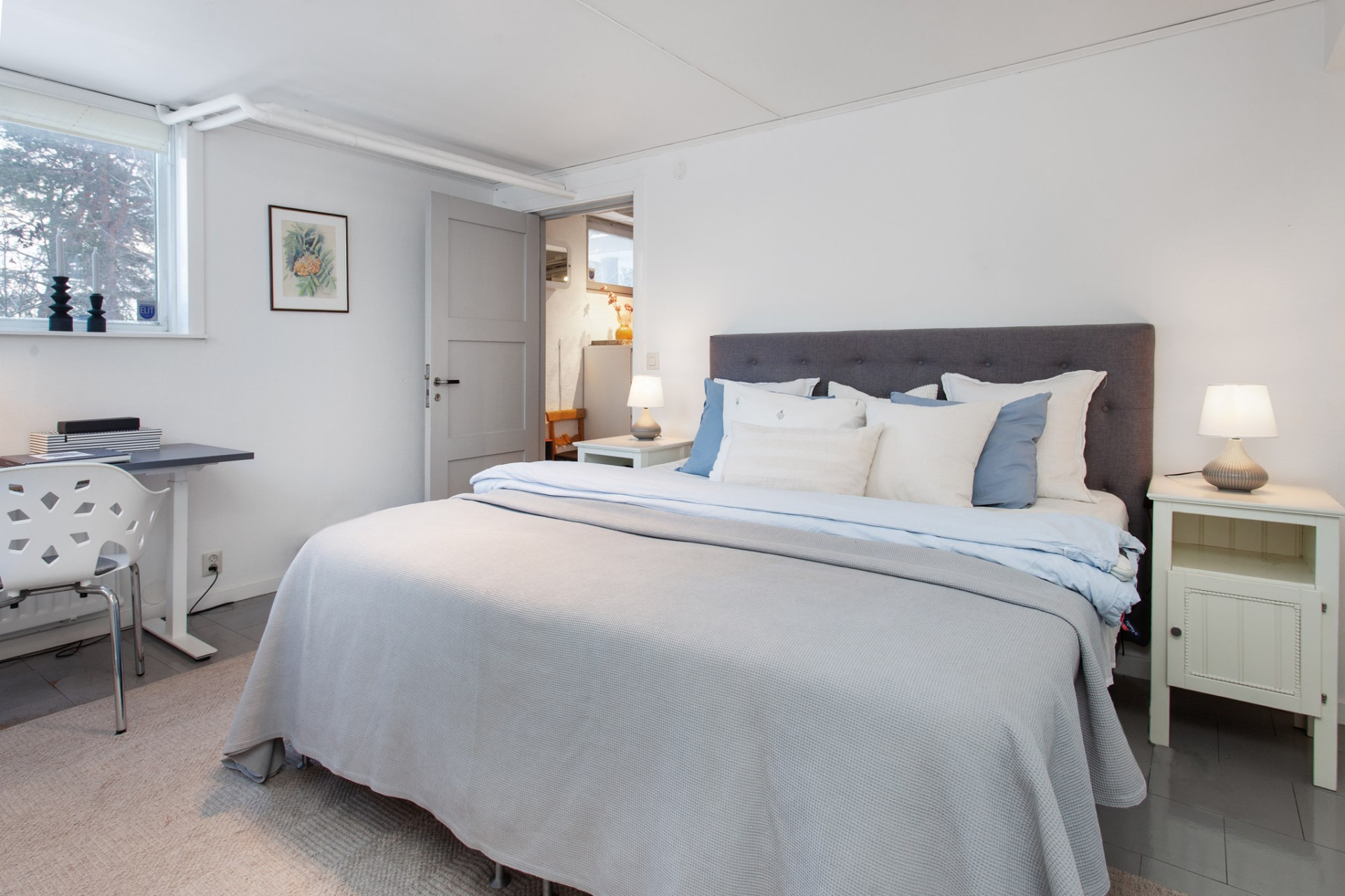 Källarplanet nås via trappan från köket och leder till nedre hallen. Under trappan finns förråd och i anslutning ligger en stor praktisk matkällare. Den generösa tvättstugan med dusch är placerad i anslutning till hallen och erbjuder bra arbetsytor. Sovrummet är rymligt och har stora fönster i två vädersteck som släpper in gott om dagsljus. Här finns även en separat entré. Vidare finns ett pannrum/förråd som ger gott om plats för förvaring förutom garaget som nås från uppfarten via dubbla garagedörrar.