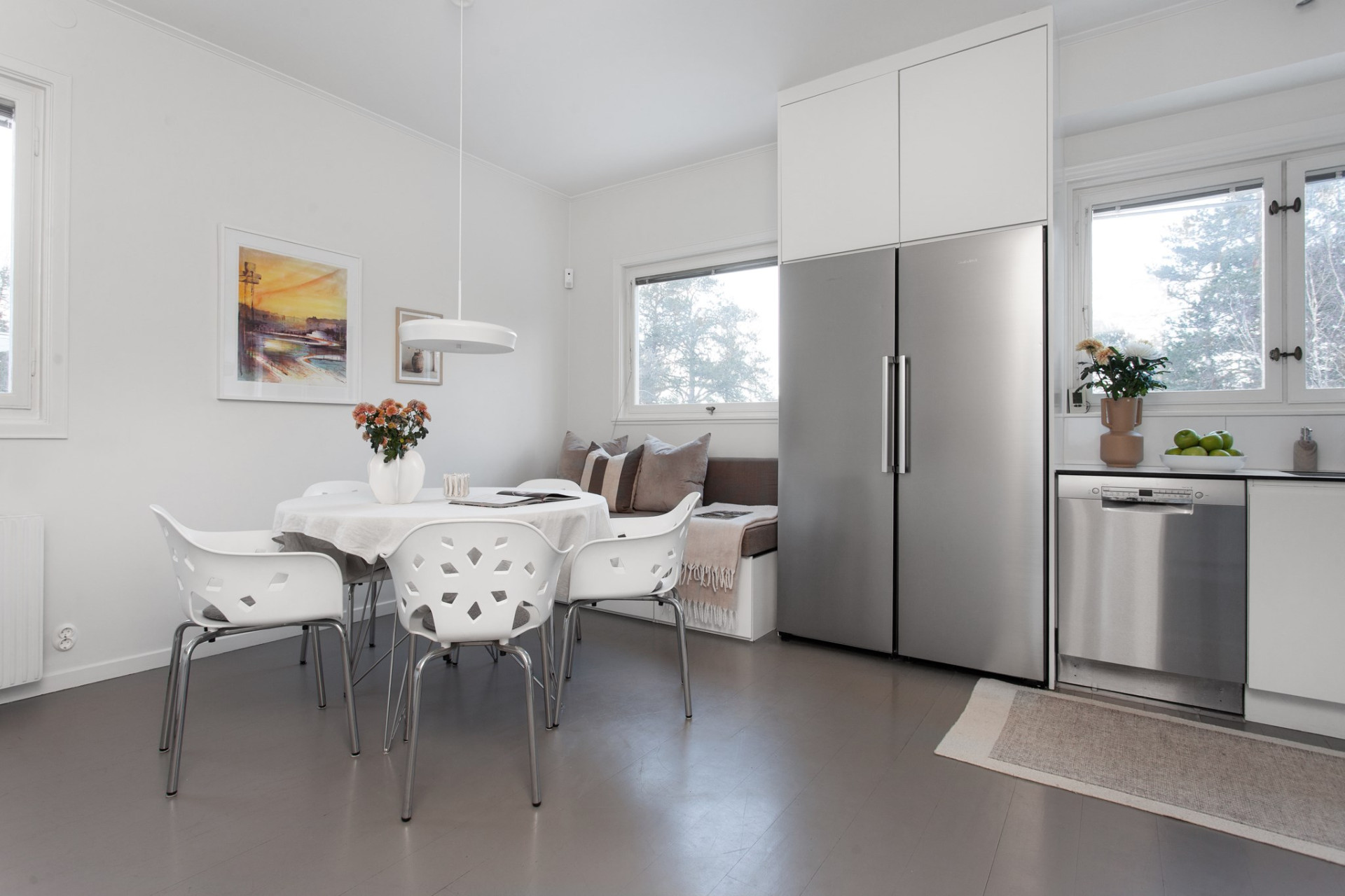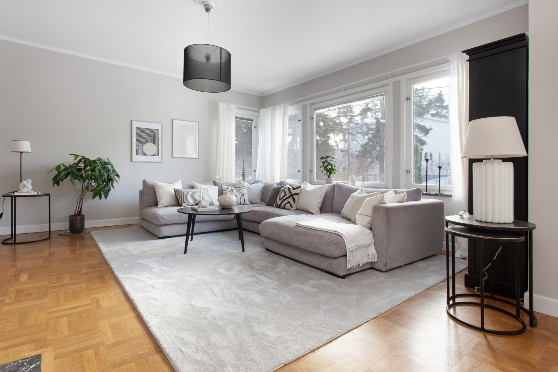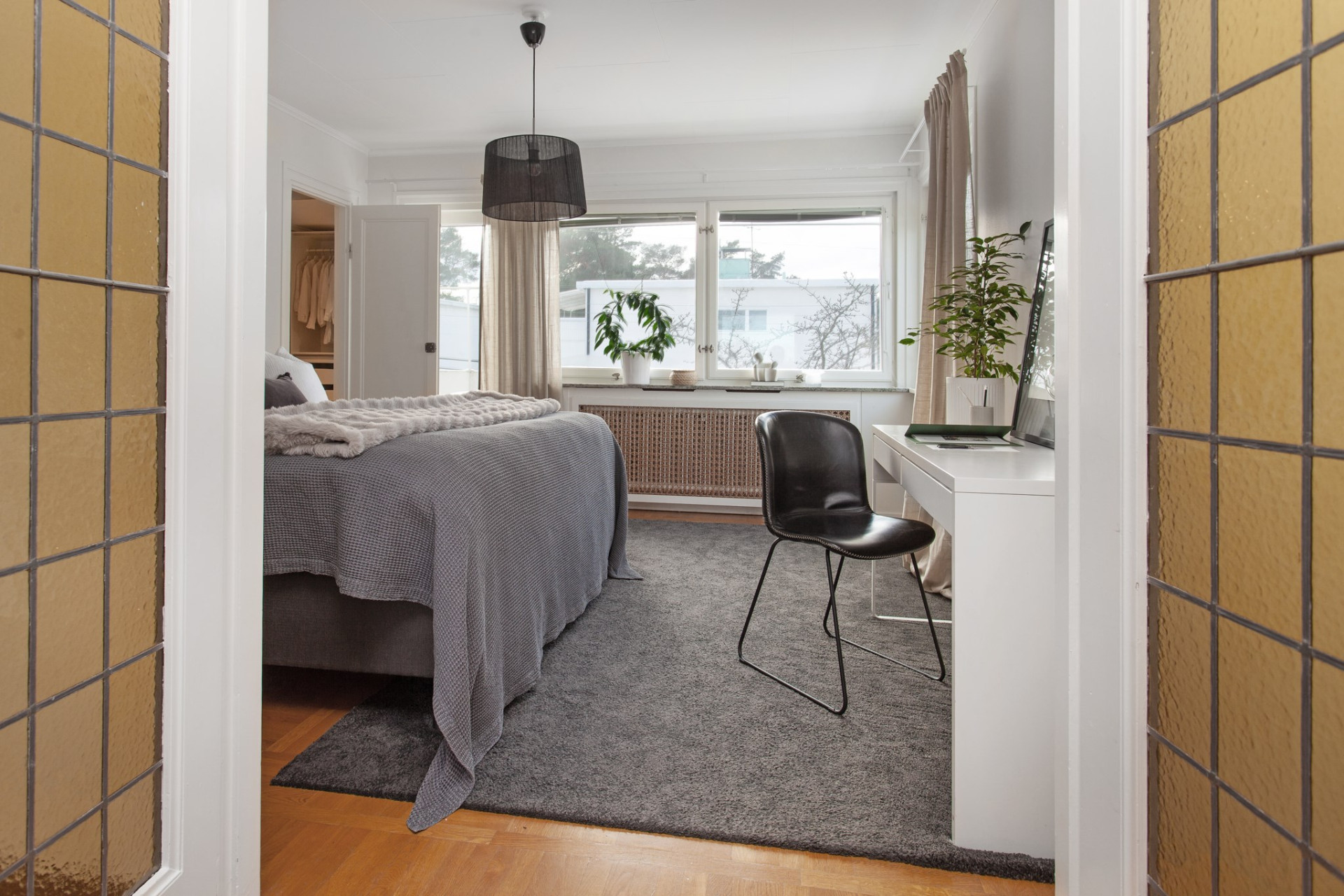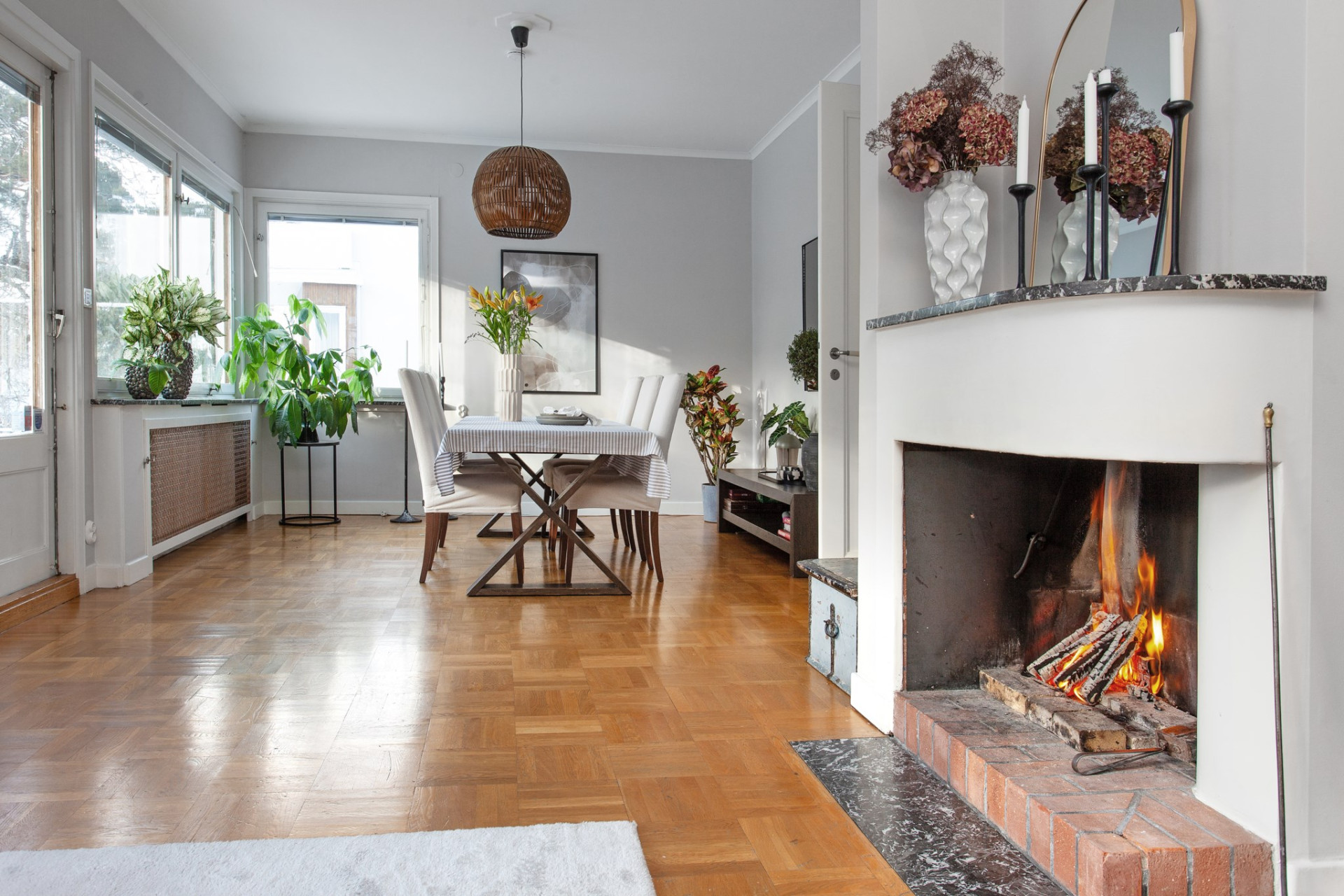 Huset erbjuder generösa sällskapsytor med vardagsrum och matsal i fil, där öppen spis och utgång mot altanen och trädgård förstärker atmosfären. Här finns ett stort ljust kök med plats för matbord och generösa arbetsytor. På övre plan möts man av en möblerbar hall, tre sovrum, badrum samt praktisk separat wc. I källarplanet finns ett fjärde sovrum med separat ingång, tvättstuga, stor matkällare, garage och goda förvaringsmöjligheter. Fastigheten är försedd med bergvärme. Trädgården bjuder lummig grönska mot den lugna gatan där barnen lär sig cykla. Sammantaget ett hem som förmedlar rymd, kvalitet och trivsel – på bekvämt avstånd till skolor, kommunikationer, natur och Mälarens strand.
