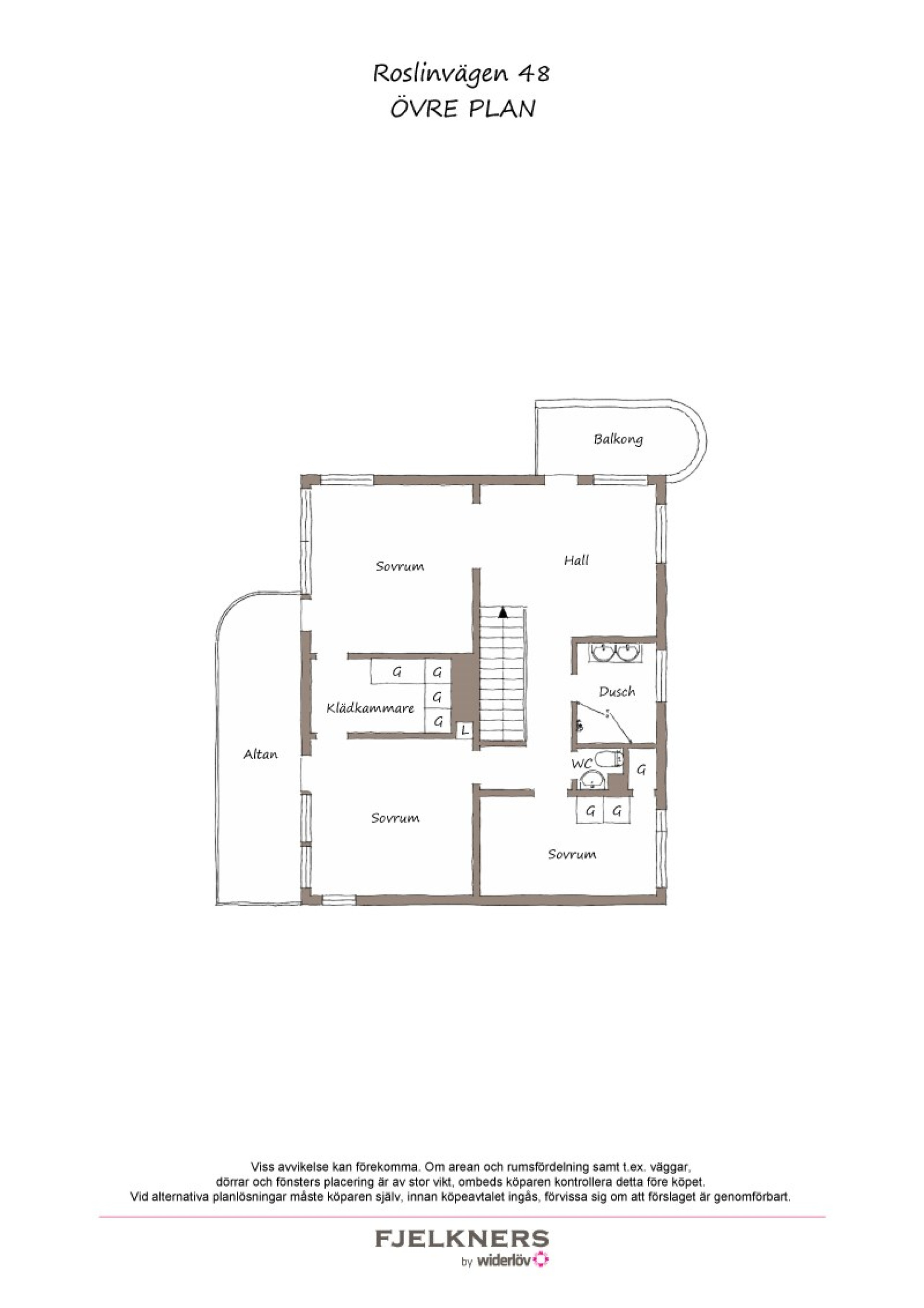 Övre planet nås via trappan och mynnar i en övre ljus hall med plats för arbetsplats eller TV-hörna med direktaccess till den västvända balkongen med gott om kvällssol. Två större sovrum ligger i fil. Mellan rummen finns en rymlig walk-in closet med dubbla ingångar. Utgång till den södervända altanen, som löper längs fasaden, finns från respektive sovrum och ger en tydlig utomhusförlängning av våningsplanet.
