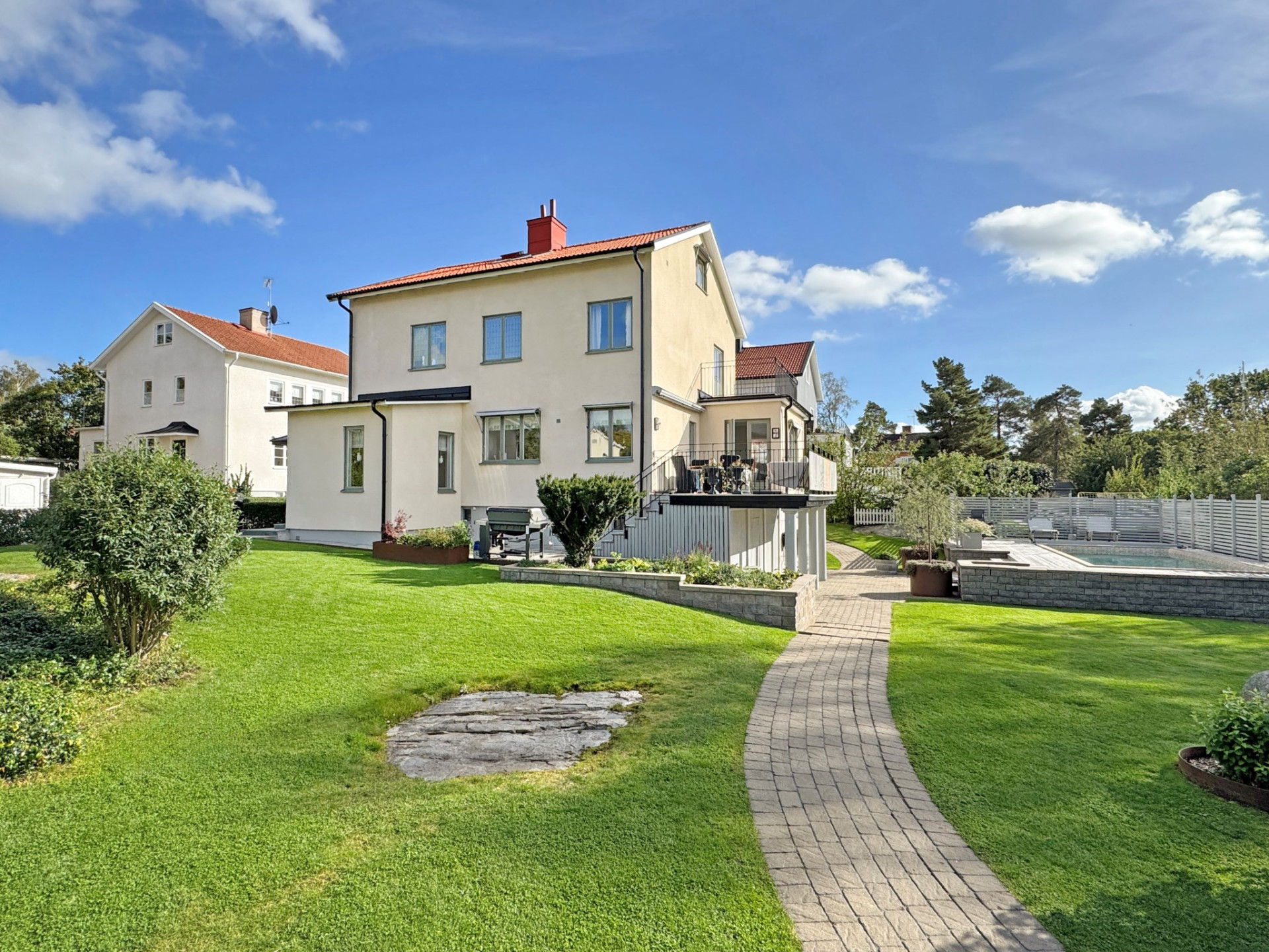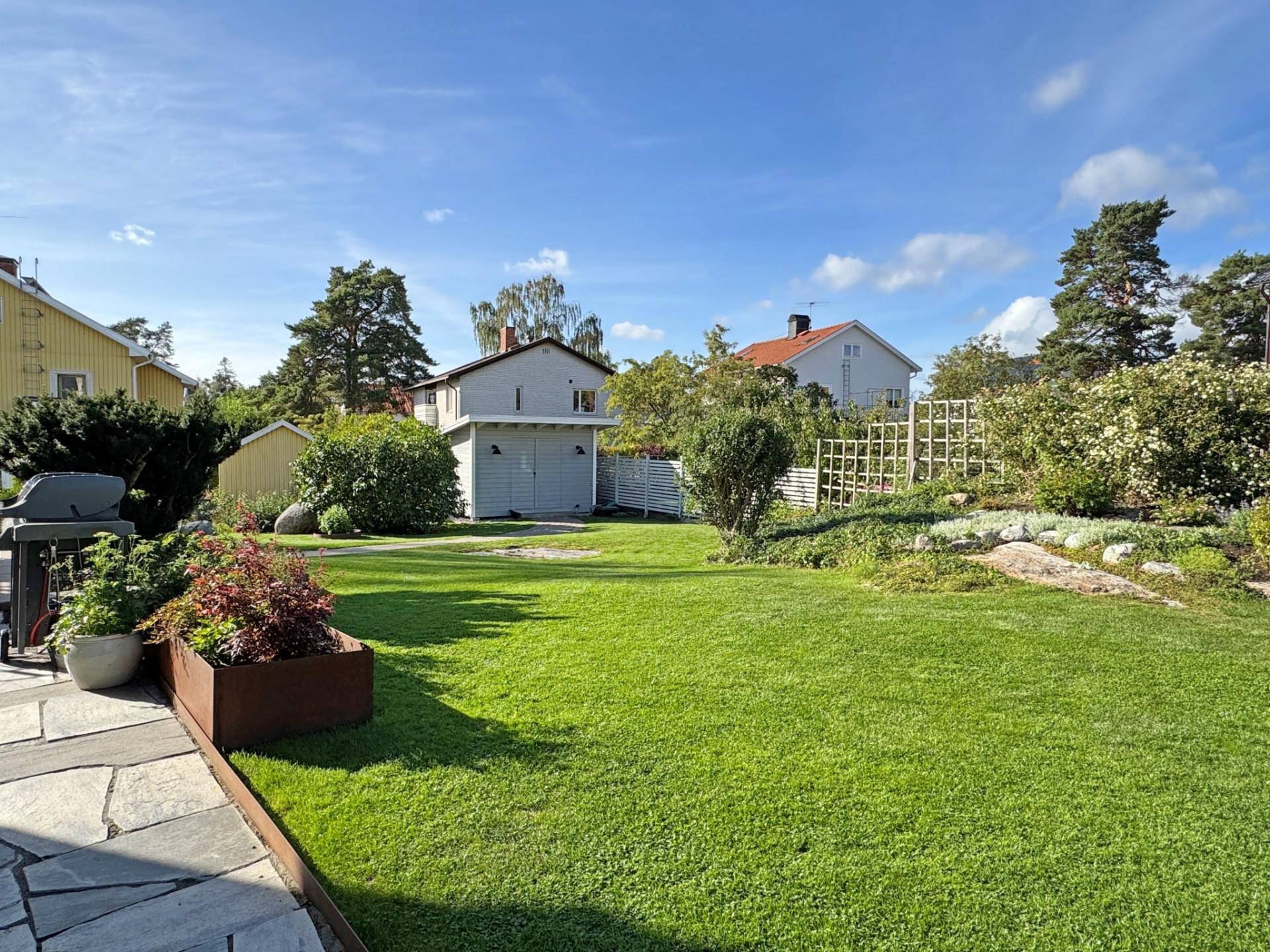 Tomten är plan med vackra stenläggningar och en härlig gräsmatta med plats för lek. Här bor du ostört men nära allt som gör Ålsten så eftertraktat – Mälarens promenadstråk, skolor, service och smidiga förbindelser mot city. Ett boende som verkligen prickar in allt: högt, soligt och privat – det perfekta huset på det perfekta läget!