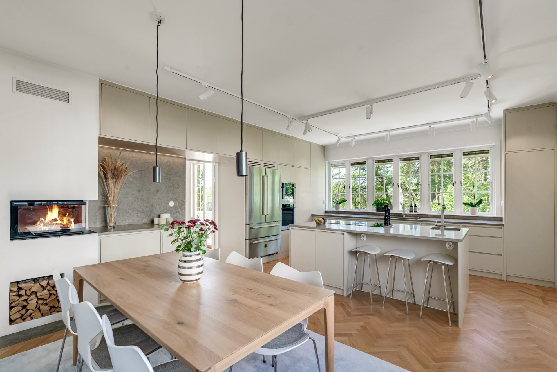 Köket är platsbyggt av Taras Hallgren Snickeri – ett kök som förenar gediget hantverk med genomtänkt design. Här möts funktion och atmosfär med dubbla kylar, utdragbara fryslådor, walk-in skafferi och en stämningsfull braskamin som ger rummet en varm karaktär. Vitvaror från italienska Bertazzoni och vattenburen golvvärme höjer komforten ytterligare.