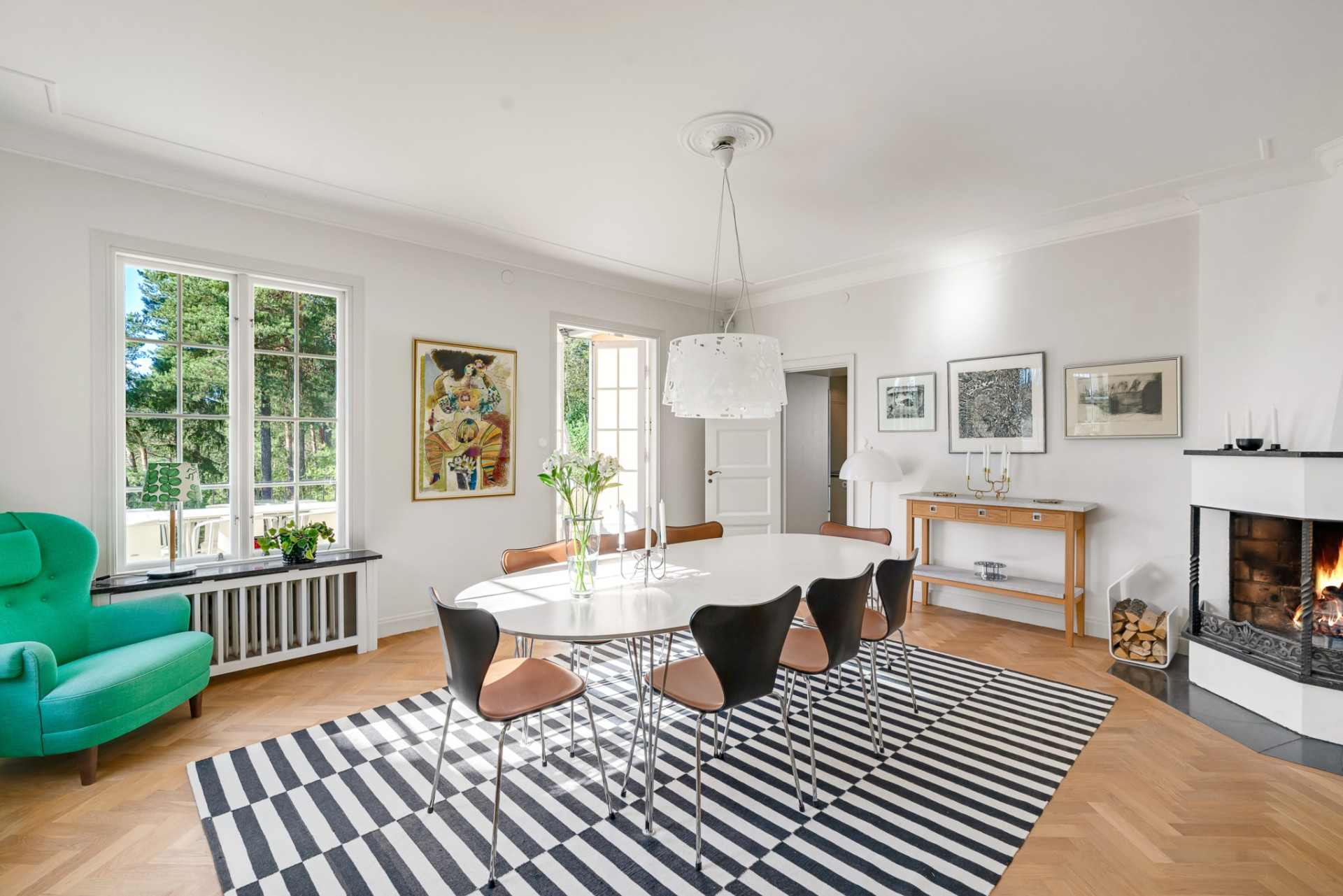 I anslutning till matsalen leder vackra parskjutdörrar in till ett elegant vardagsrum, som i sin tur öppnar upp mot ett rofyllt bibliotek. Här finns trappan som leder vidare upp till övre plan.