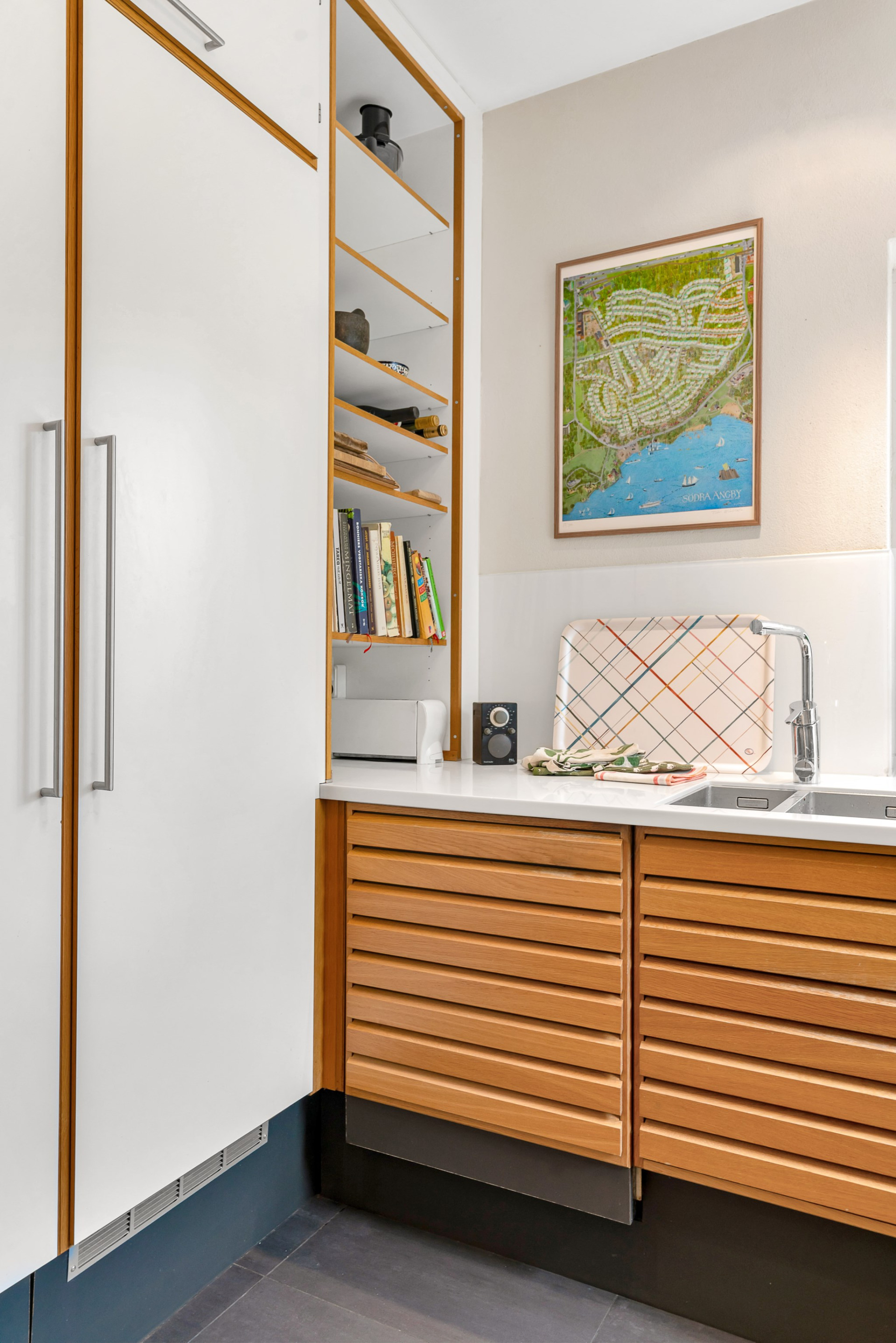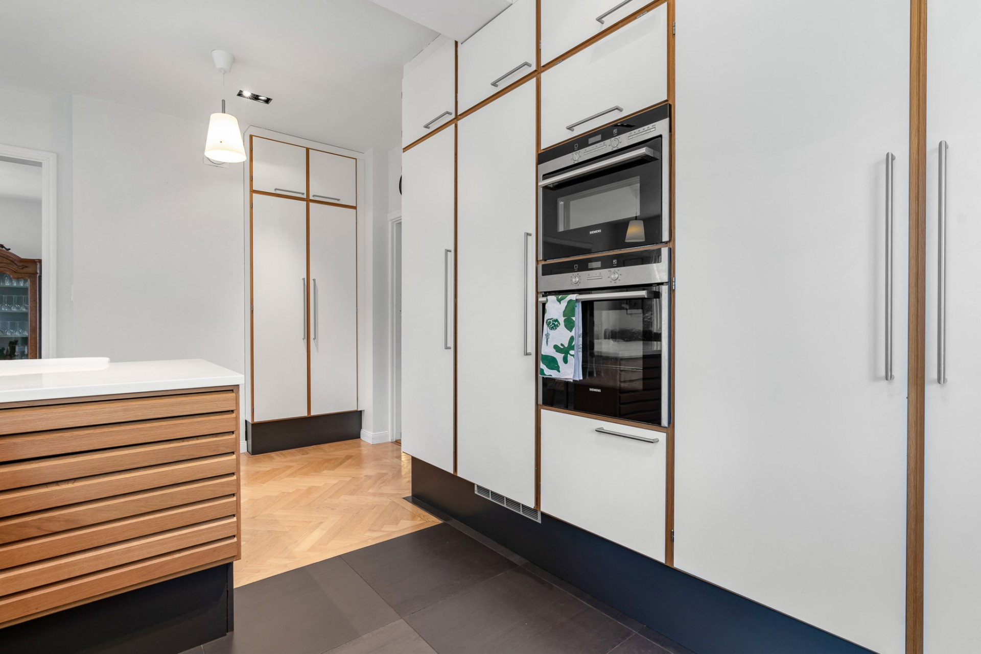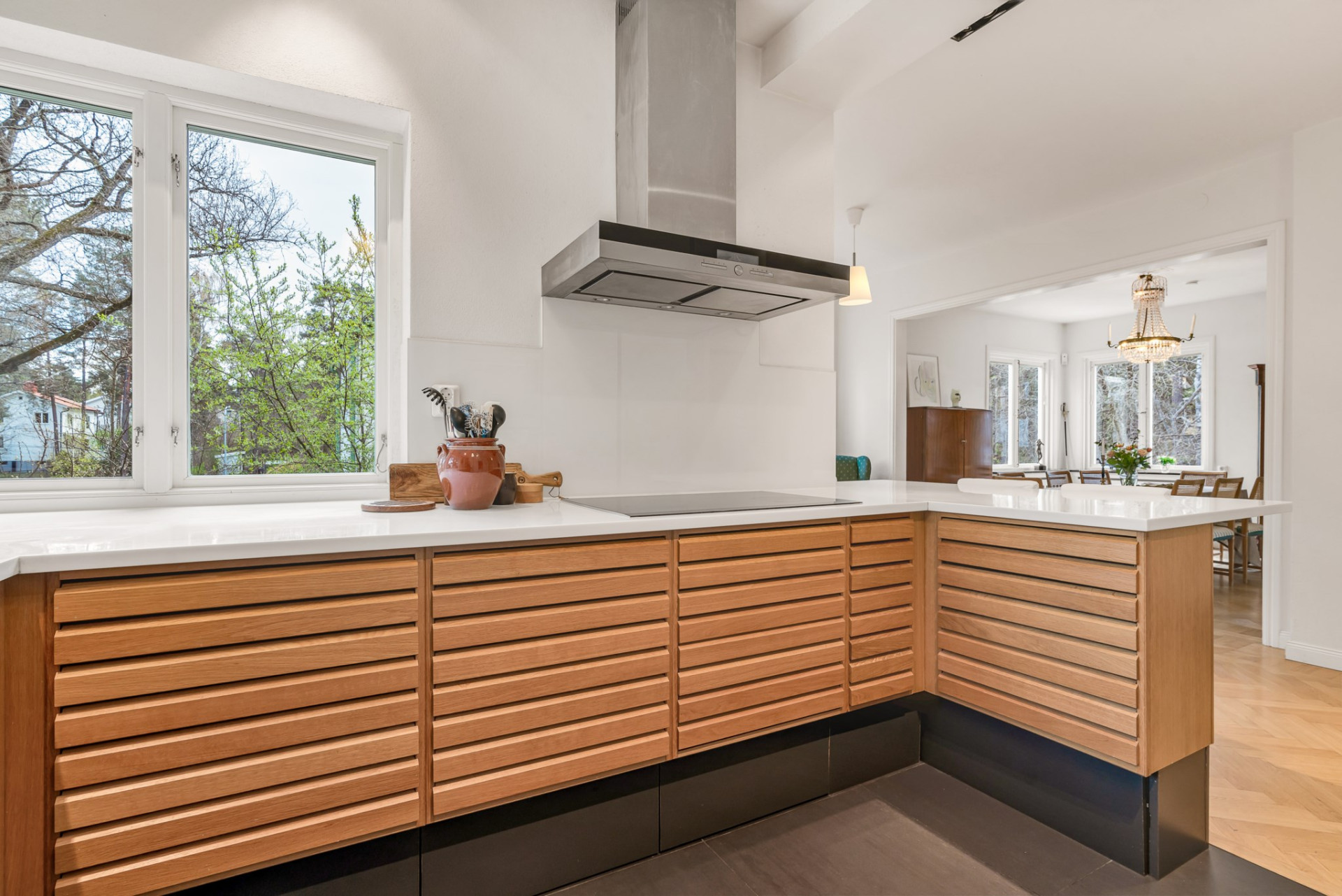 Förbi den rymliga matsalen nås köket, som med sin öppna planlösning skapar en naturlig samlingspunkt för middagar och sociala tillställningar med familj och vänner. Köket, från Unoform, präglas av gedigen kvalitet och tidlös elegans, smakfullt utformat i en harmonisk kombination av ek och vitt.