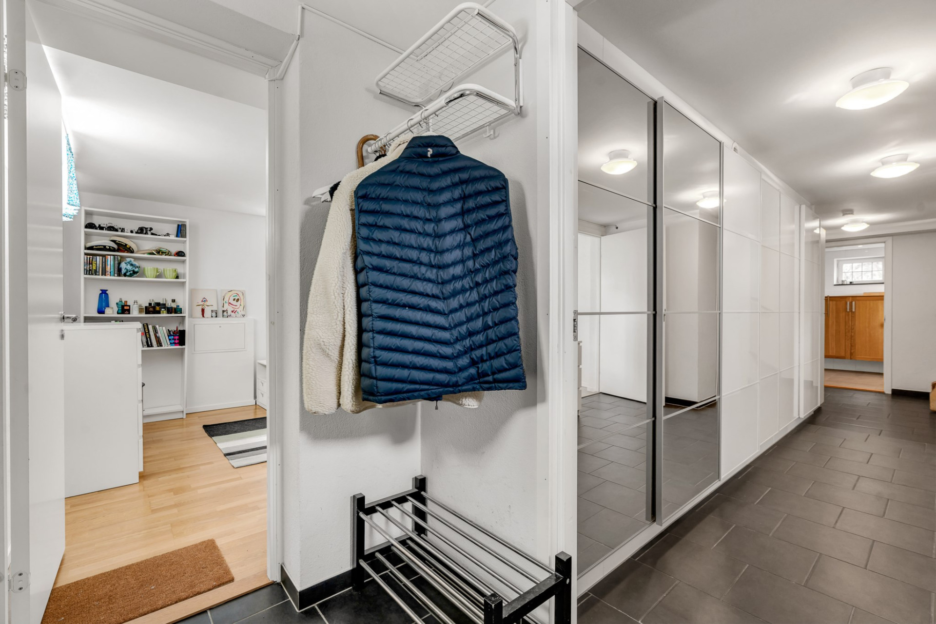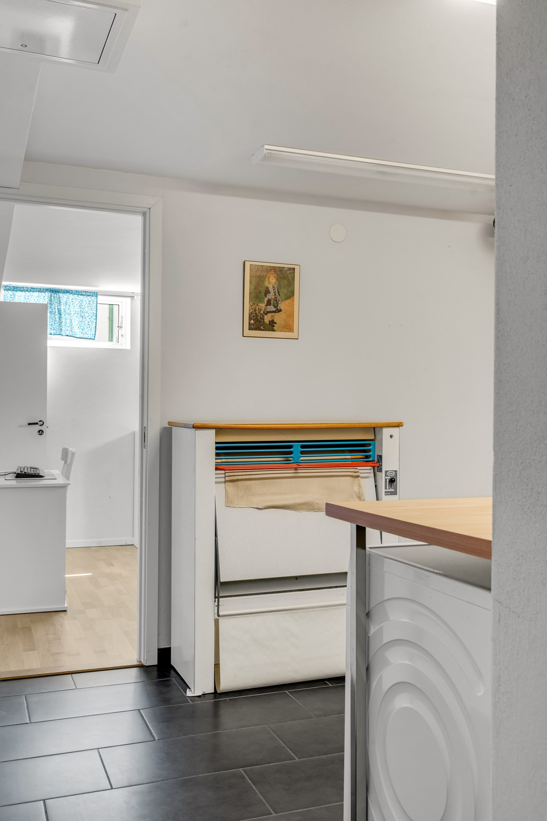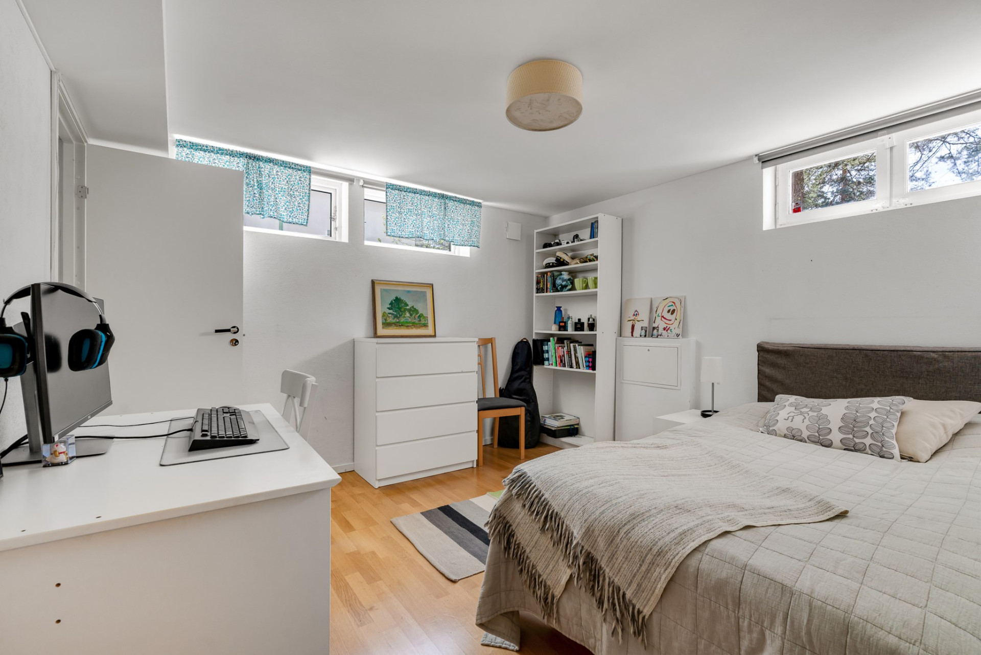 Från en trappa invid den inre hallen tar vi oss vidare ner till soutterängplan som även detta plan imponerar med ljus och rymd. Totalrenoverat med vattenburen golvvärme och högt i tak. Här finns i dagsläget ett stort badrum med dusch, två sovrum eller allrum med parkettgolv som blir perfekt för såväl tonåringen eller den långväga gästen. Groventré med tillhörande hall som ger oändliga förvaringsmöjligheter i många skåp och garderober och en praktisk tvättstuga med gott om plats för såväl upphängning som förvaring tack vare skåp och arbetsytor. Ett stort förråd sköter det mesta av förvaringen och innanför det finner vi ytterligare ett utrymme med dörr mot trädgården och en stor vinkällare med otroliga möjligheter. Endast fantasin sätter stopp!
