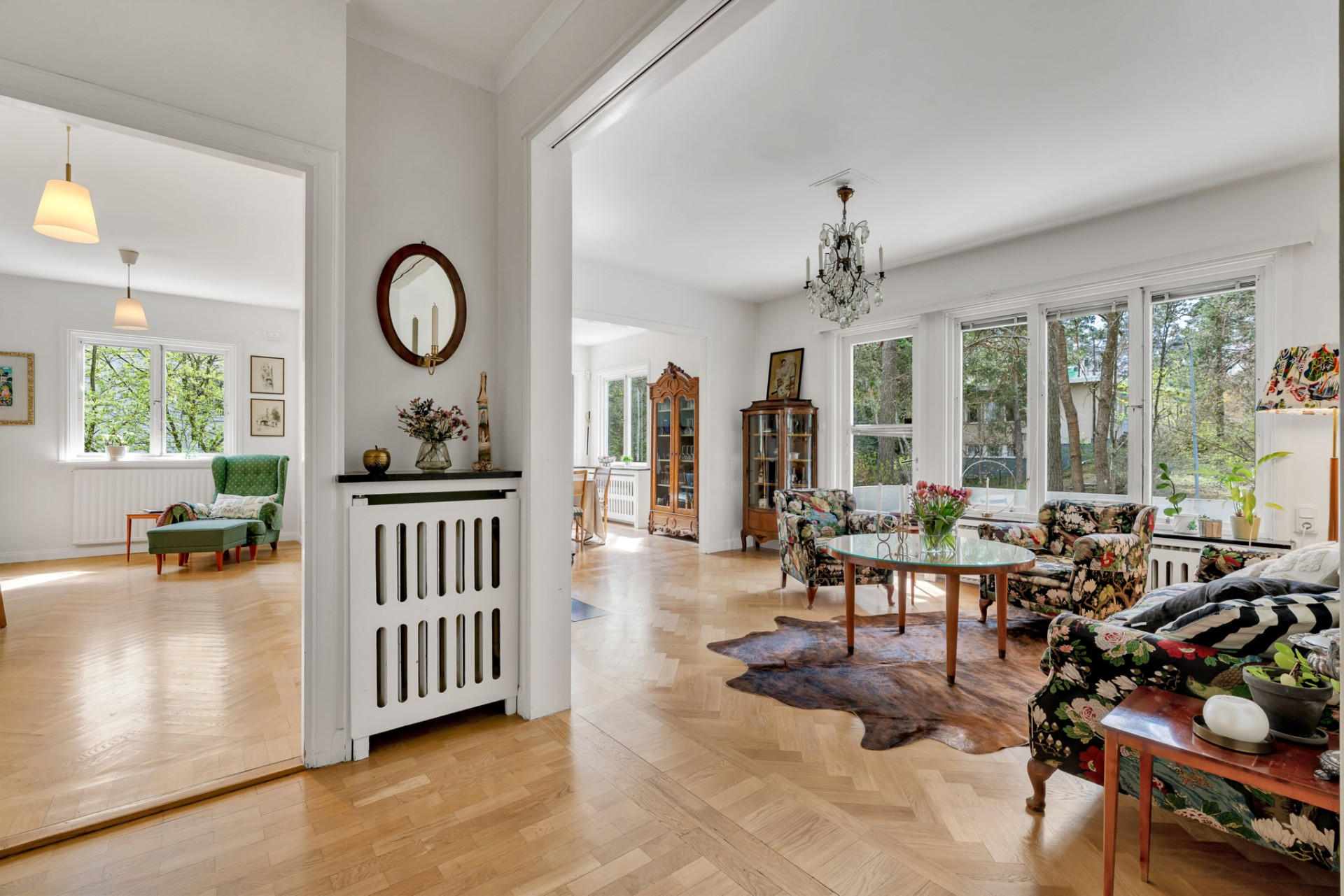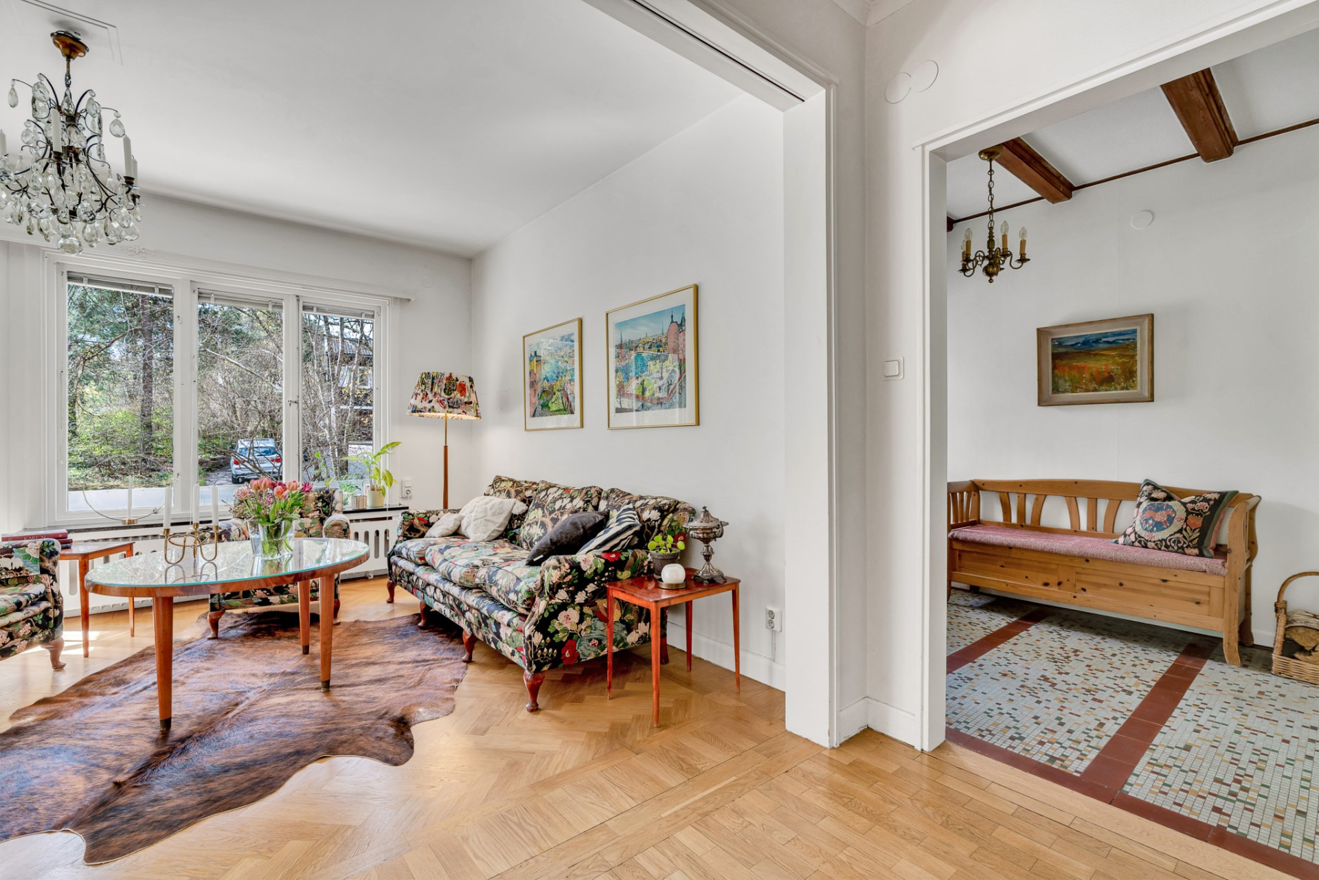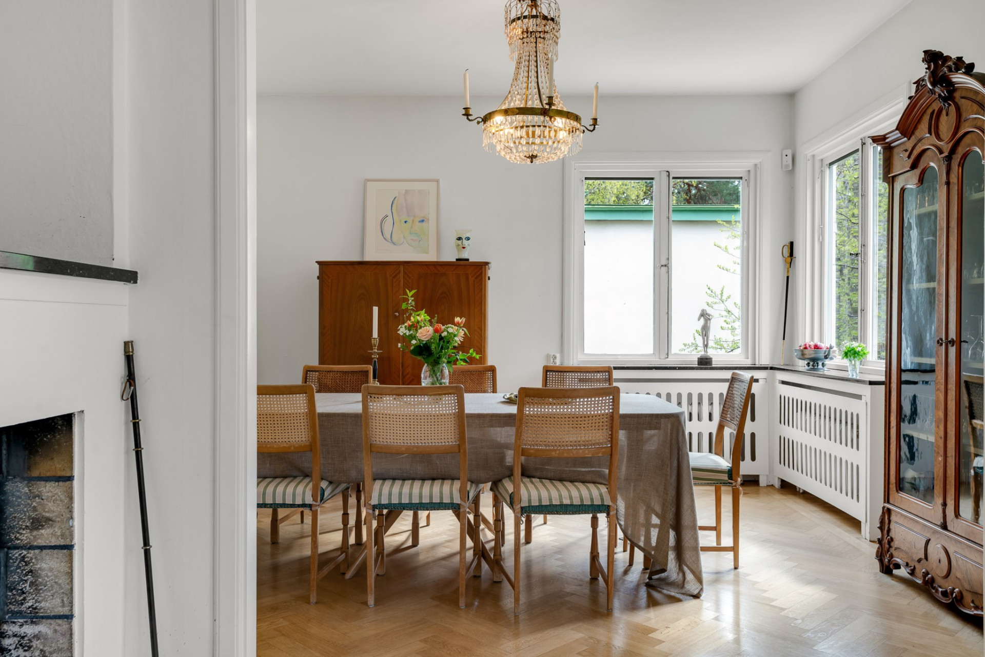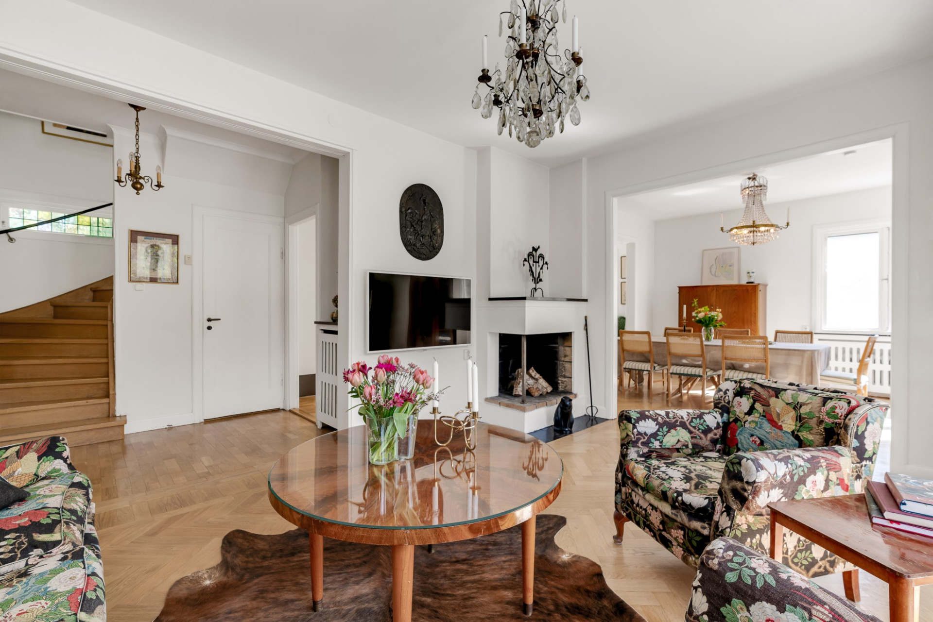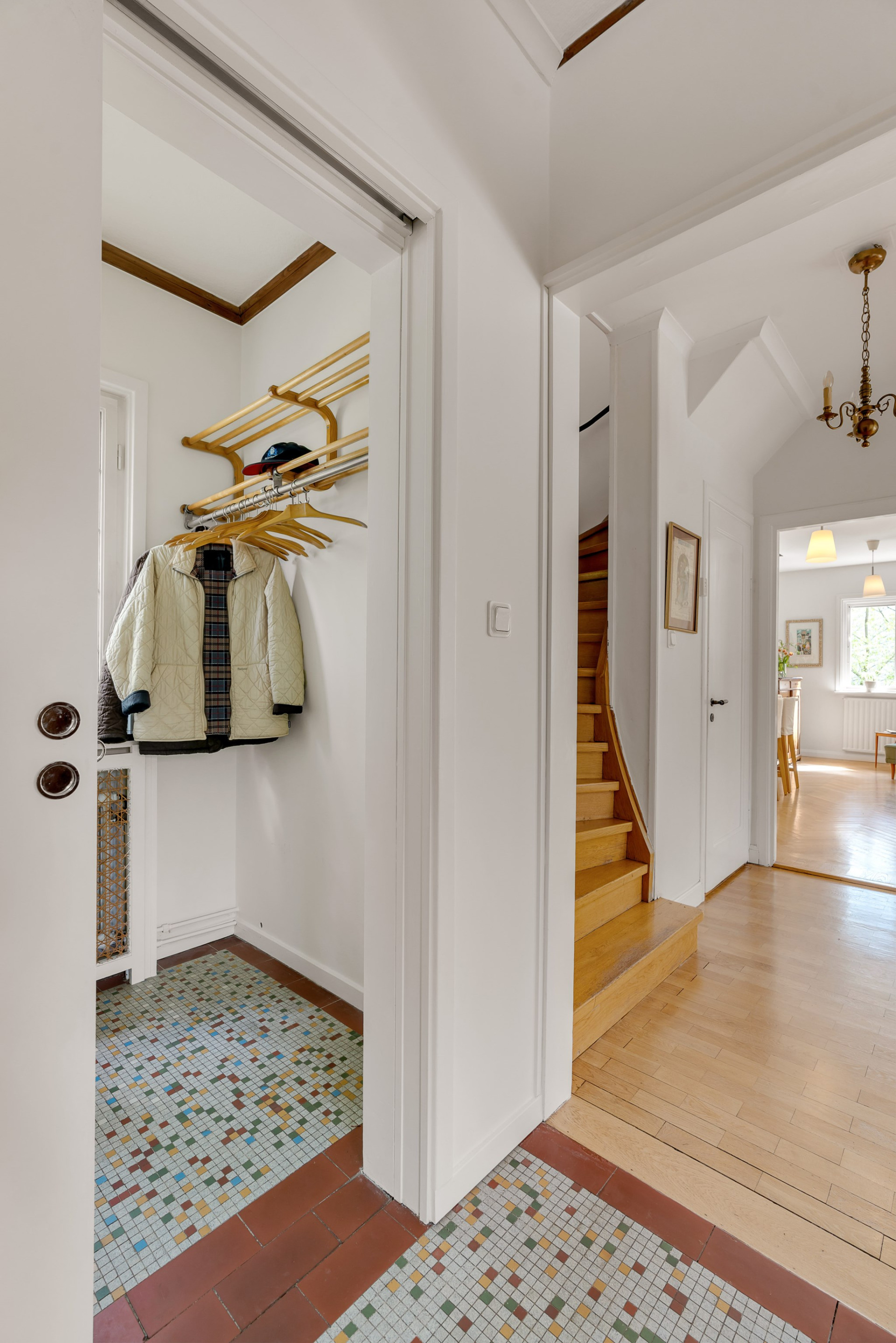Hallen välkomnar med generösa ytor och gott om plats för avhängning i kapprummet rakt fram. Här vilar fötterna på vackert originalgolv i klinker och mosaik, och redan vid entrén möts vi av fina detaljer såsom blyspröjsade fönster och generös takhöjd. Intill kapprummet finns även en praktisk gäst-WC. Vidare in mot vardagsrum och matsal fortsätter bostaden att imponera med sina genomtänkta ytor och klassiska inslag.Tack vare öppen planlösning blir här en genomgående rymd och plats för all tänkbar möblering. Klassiska stora fönsterpartier skänker mycket ljus och fortsatt tidstypiska detaljer såsom fiskbensparkett, elementskydd i original och en värmande öppen spis pryder sin plats. Härifrån tar vi oss även ut till den stora, vackert rundade altanen med sol dagen lång. Här ryms utan problem många på middag under sommarhalvåret och vi kan njuta av lugnet och tystnaden utan insyn från grannar.