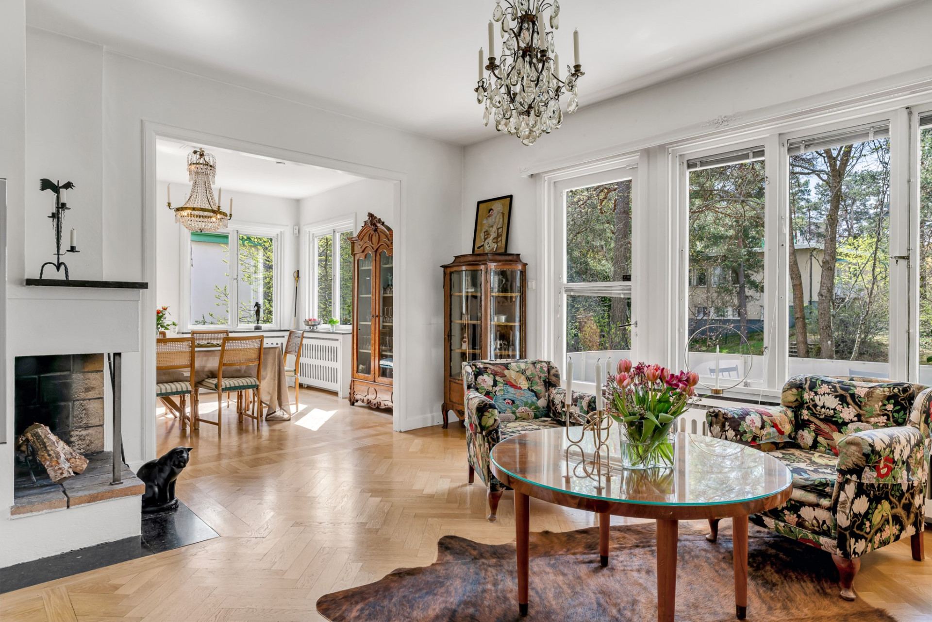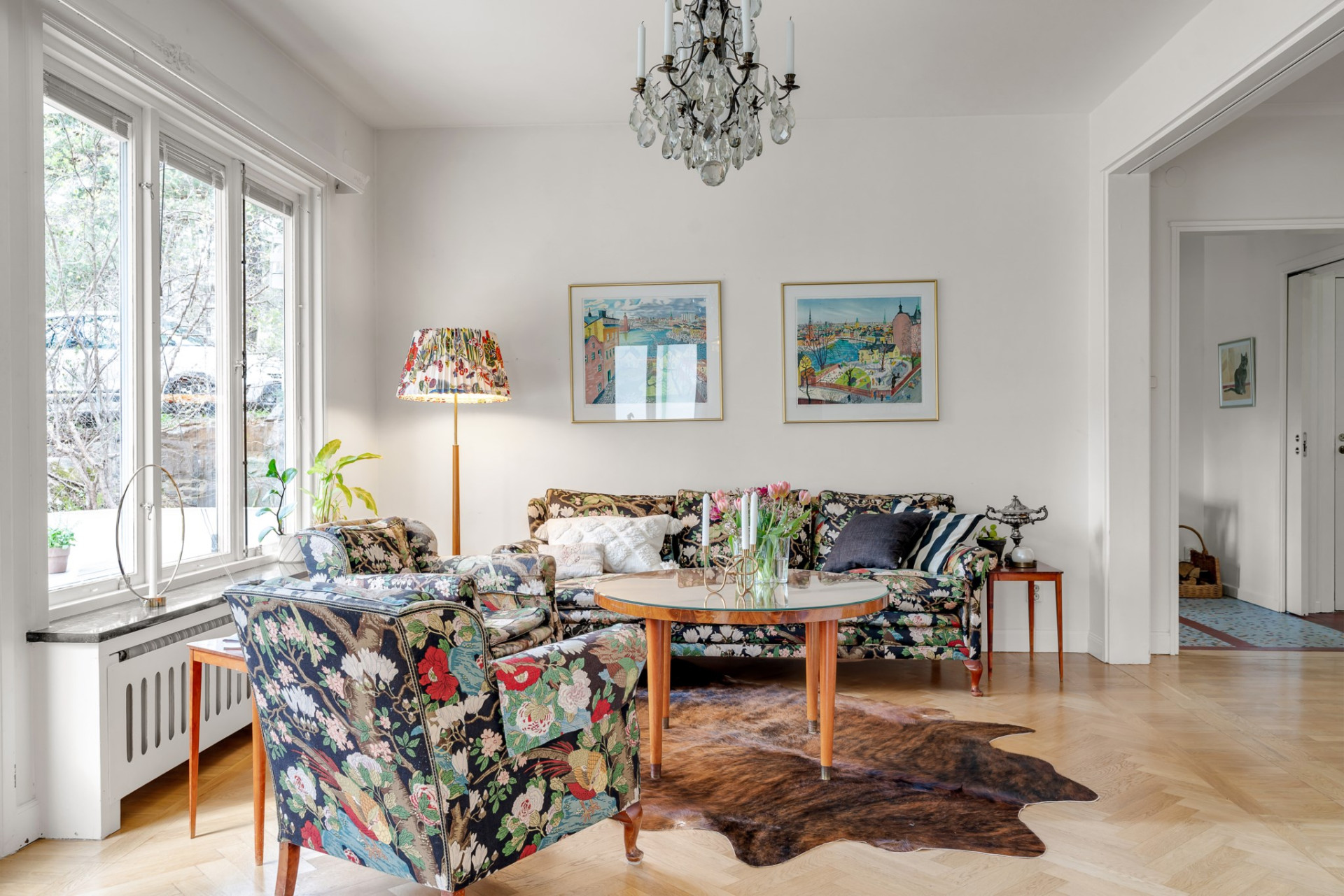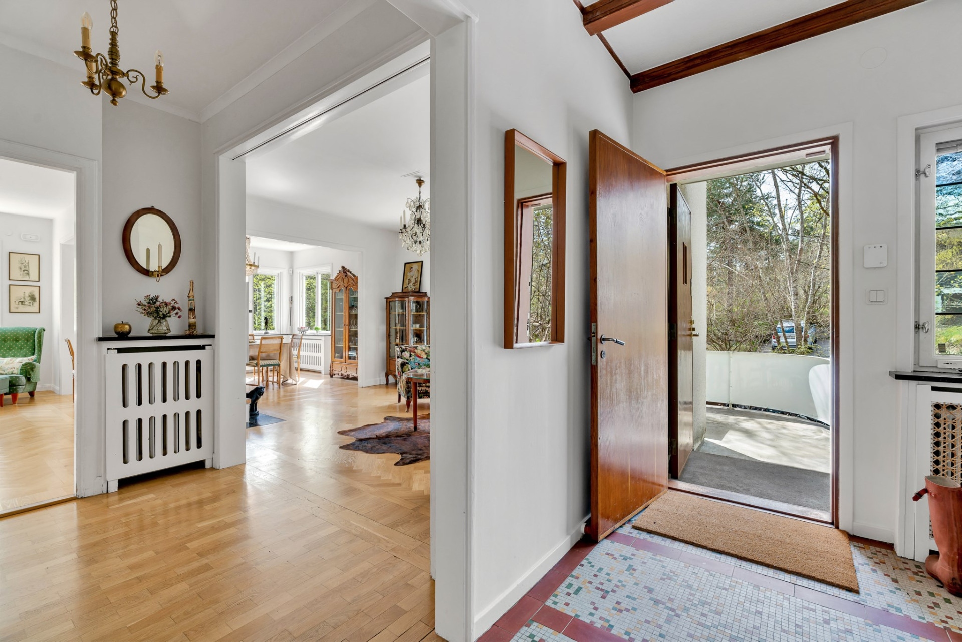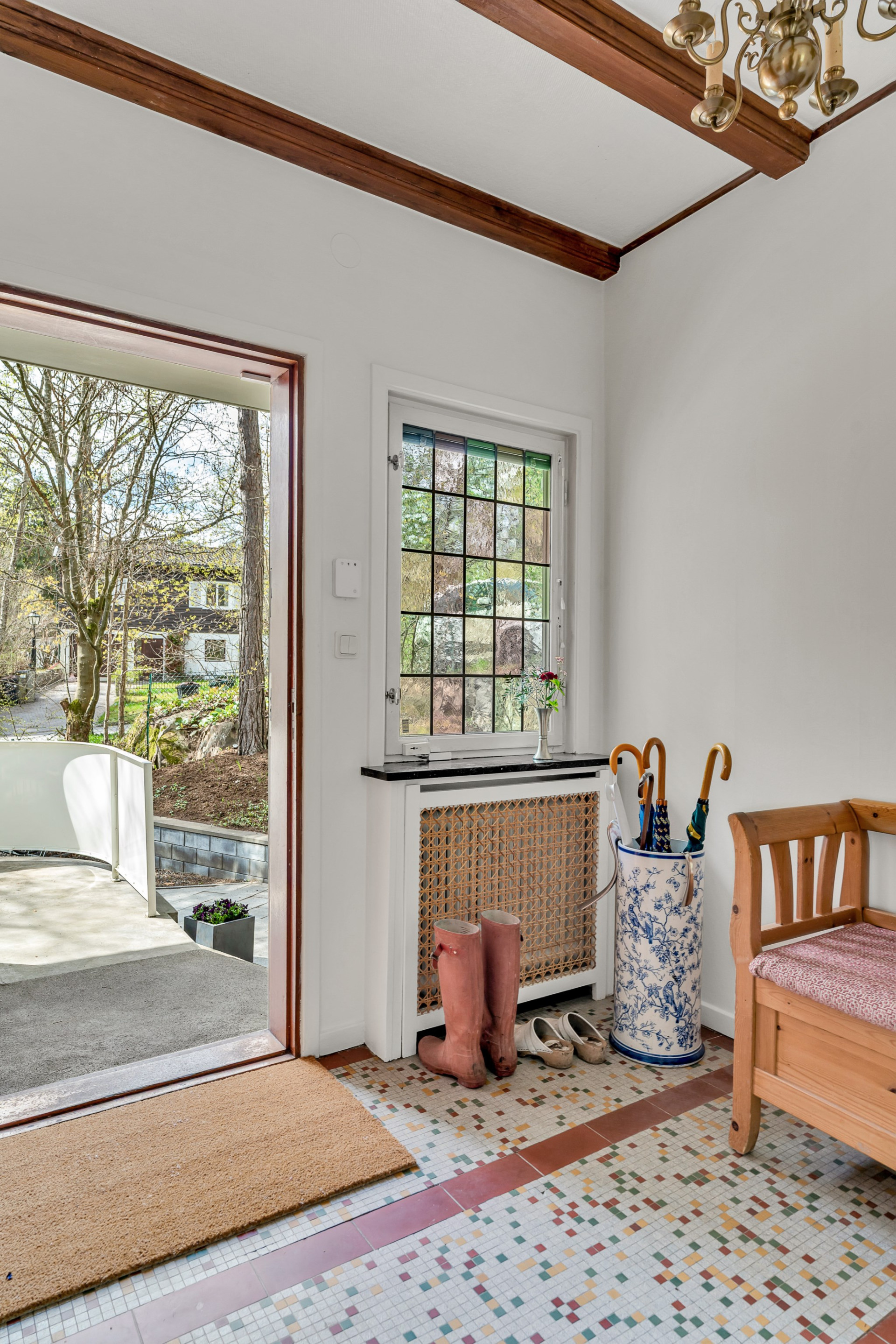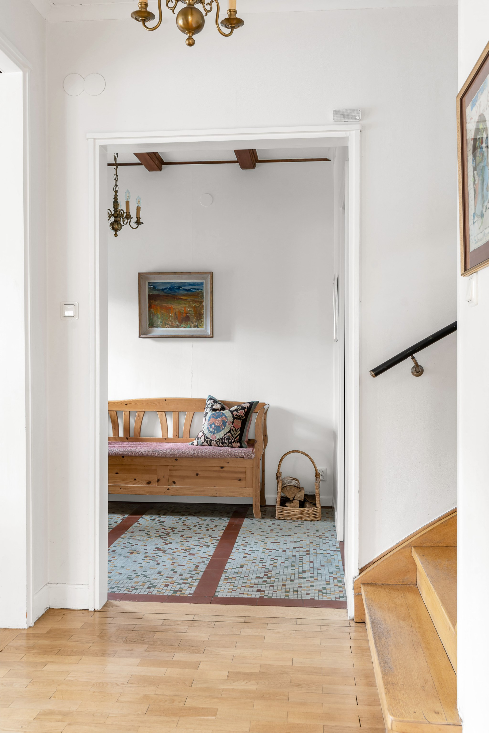 Hallen välkomnar med generösa ytor och gott om plats för avhängning i kapprummet rakt fram. Här vilar fötterna på vackert originalgolv i klinker och mosaik, och redan vid entrén möts vi av fina detaljer såsom blyspröjsade fönster och generös takhöjd. Intill kapprummet finns även en praktisk gäst-WC. Vidare in mot vardagsrum och matsal fortsätter bostaden att imponera med sina genomtänkta ytor och klassiska inslag.Tack vare öppen planlösning blir här en genomgående rymd och plats för all tänkbar möblering. Klassiska stora fönsterpartier skänker mycket ljus och fortsatt tidstypiska detaljer såsom fiskbensparkett, elementskydd i original och en värmande öppen spis pryder sin plats. Härifrån tar vi oss även ut till den stora, vackert rundade altanen med sol dagen lång. Här ryms utan problem många på middag under sommarhalvåret och vi kan njuta av lugnet och tystnaden utan insyn från grannar.