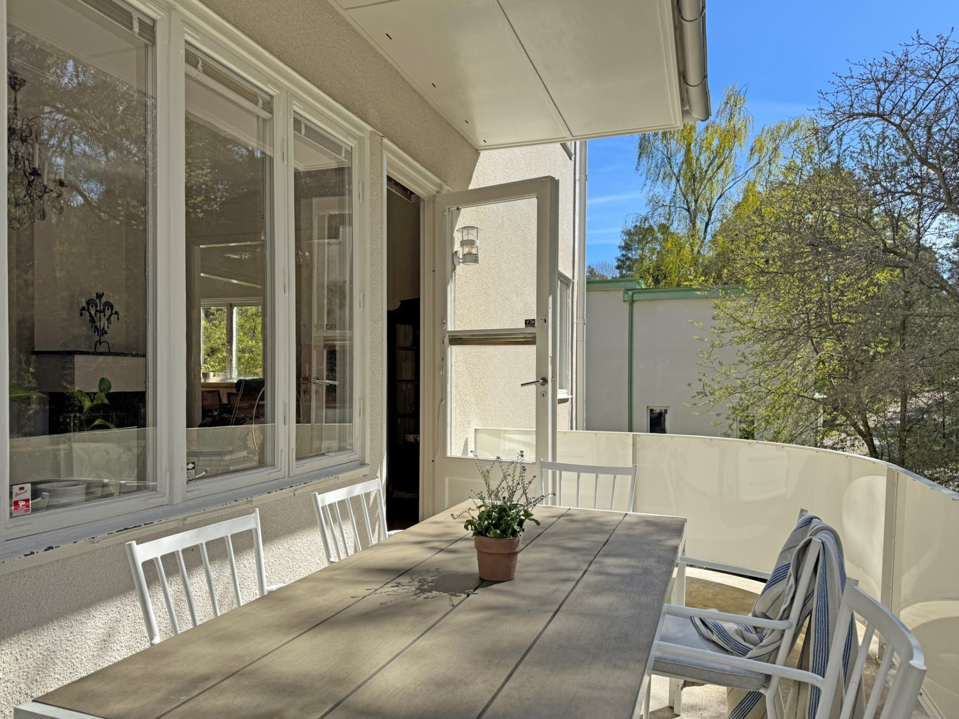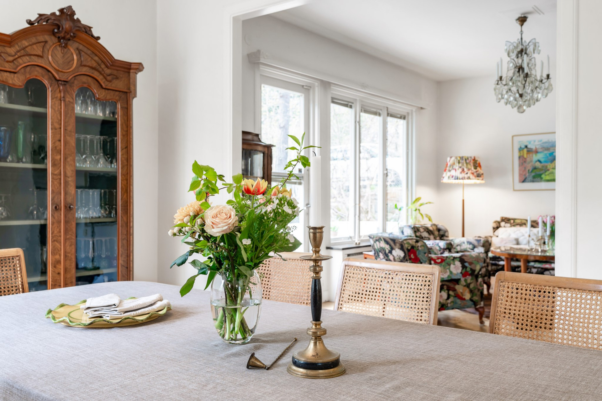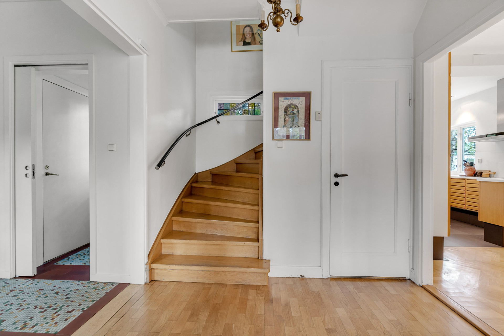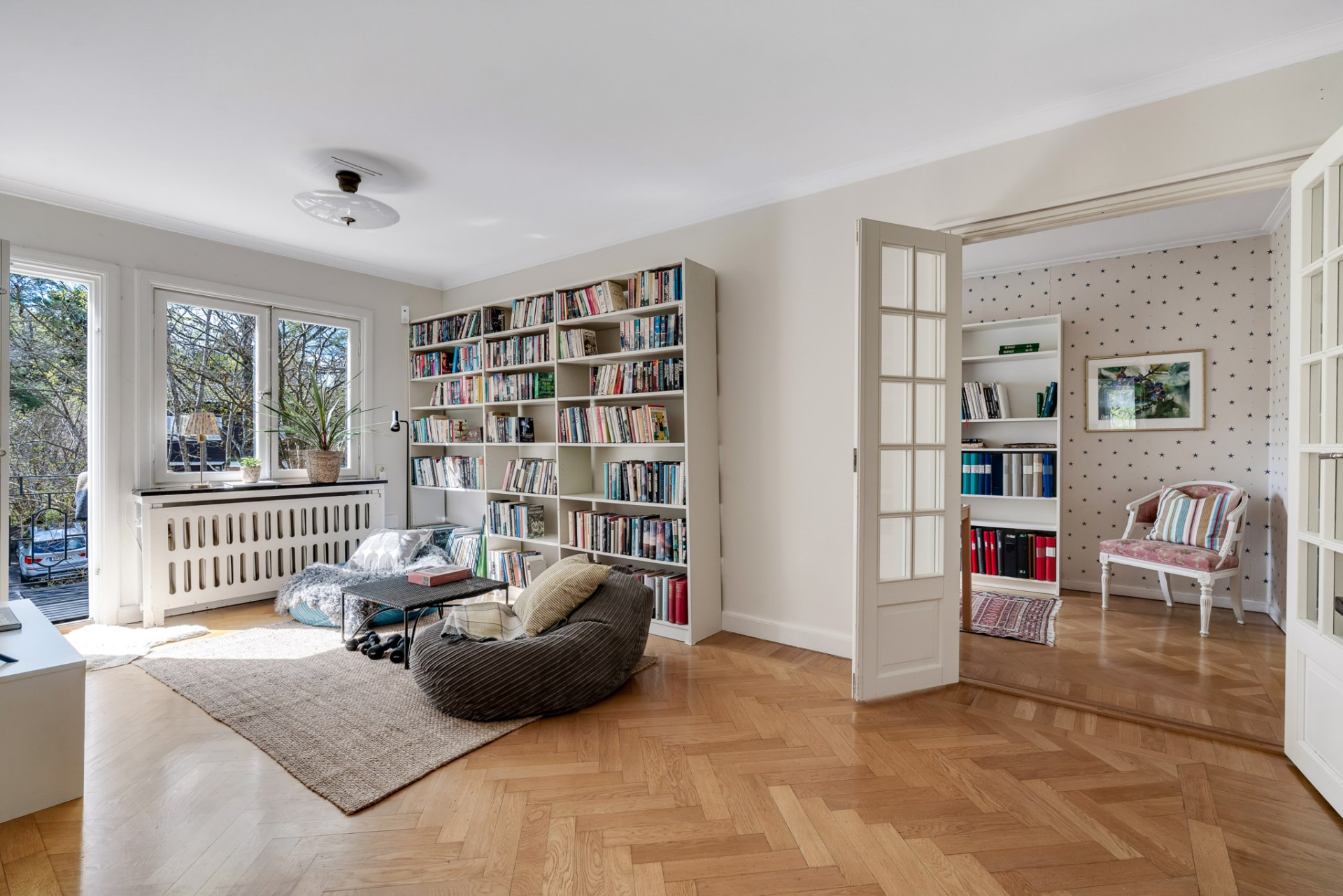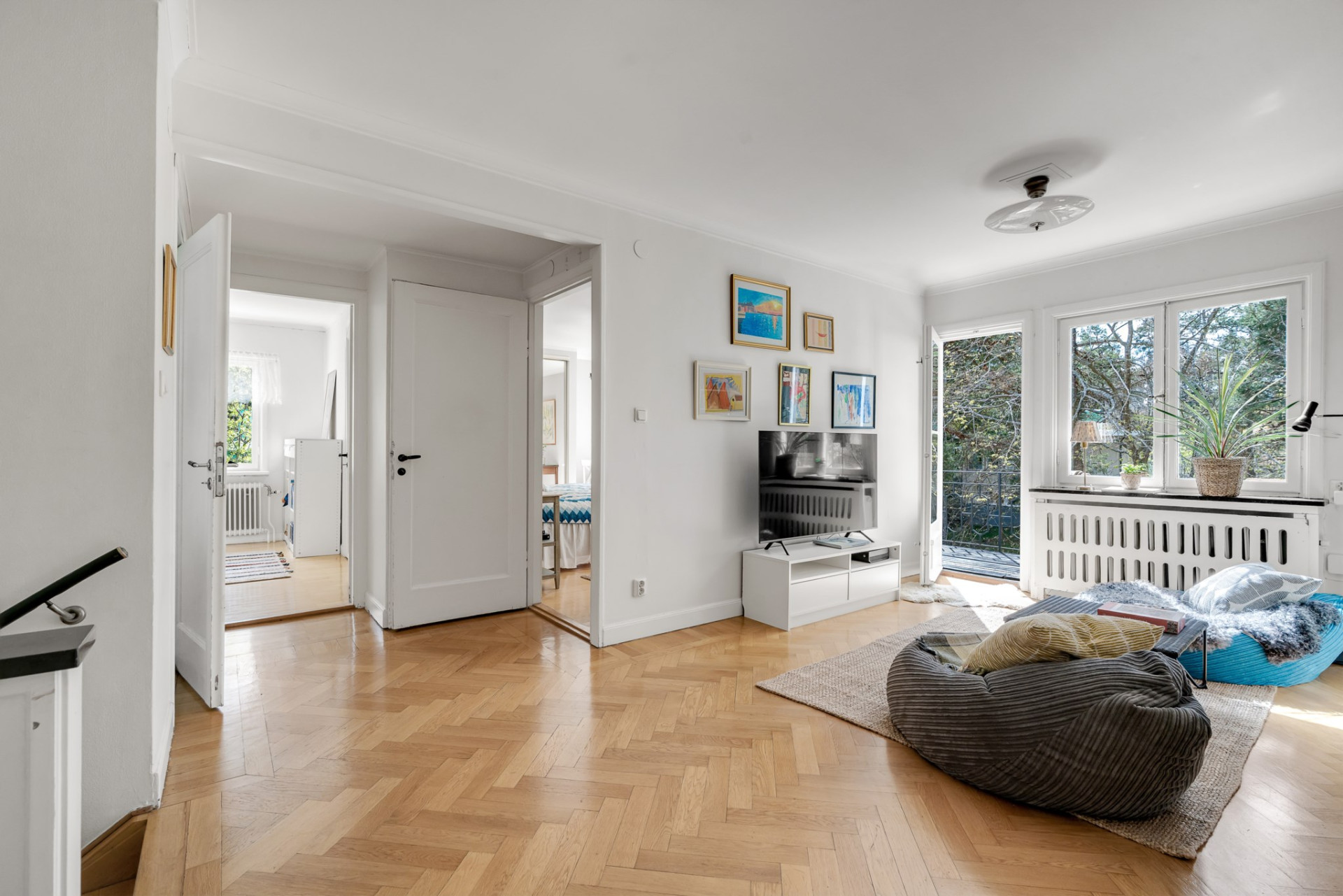 Hallen välkomnar med generösa ytor och gott om plats för avhängning i kapprummet rakt fram. Här vilar fötterna på vackert originalgolv i klinker och mosaik, och redan vid entrén möts vi av fina detaljer såsom blyspröjsade fönster och generös takhöjd. Intill kapprummet finns även en praktisk gäst-WC. Vidare in mot vardagsrum och matsal fortsätter bostaden att imponera med sina genomtänkta ytor och klassiska inslag.Tack vare öppen planlösning blir här en genomgående rymd och plats för all tänkbar möblering. Klassiska stora fönsterpartier skänker mycket ljus och fortsatt tidstypiska detaljer såsom fiskbensparkett, elementskydd i original och en värmande öppen spis pryder sin plats. Härifrån tar vi oss även ut till den stora, vackert rundade altanen med sol dagen lång. Här ryms utan problem många på middag under sommarhalvåret och vi kan njuta av lugnet och tystnaden utan insyn från grannar.